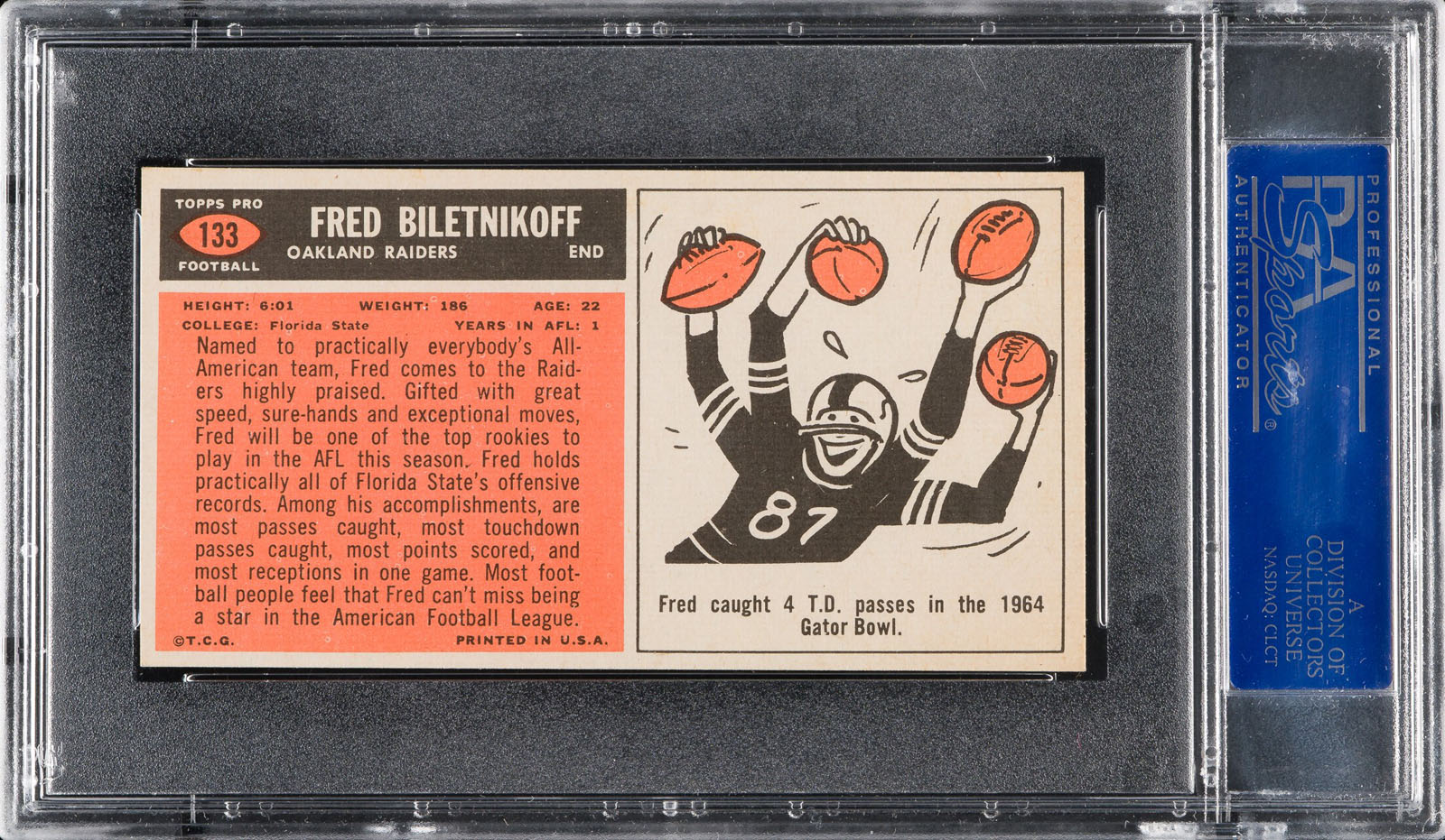 Graded NM 7 by PSA. Exceptional high-grade rookie card of Hall of Famer Fred Biletnikoff (Oakland Raiders) from the popular 1965 Topps football set, also noted as a short print within the series. Crisp and clean, both front and back, with centering slightly toward the lower left, snow-white borders, bold colors, flawless registration, and four strong corners. A superb example that would be a welcome addition to any 1965 Topps football set or Hall of Fame rookie collection. Reserve $200. Estimate (open).