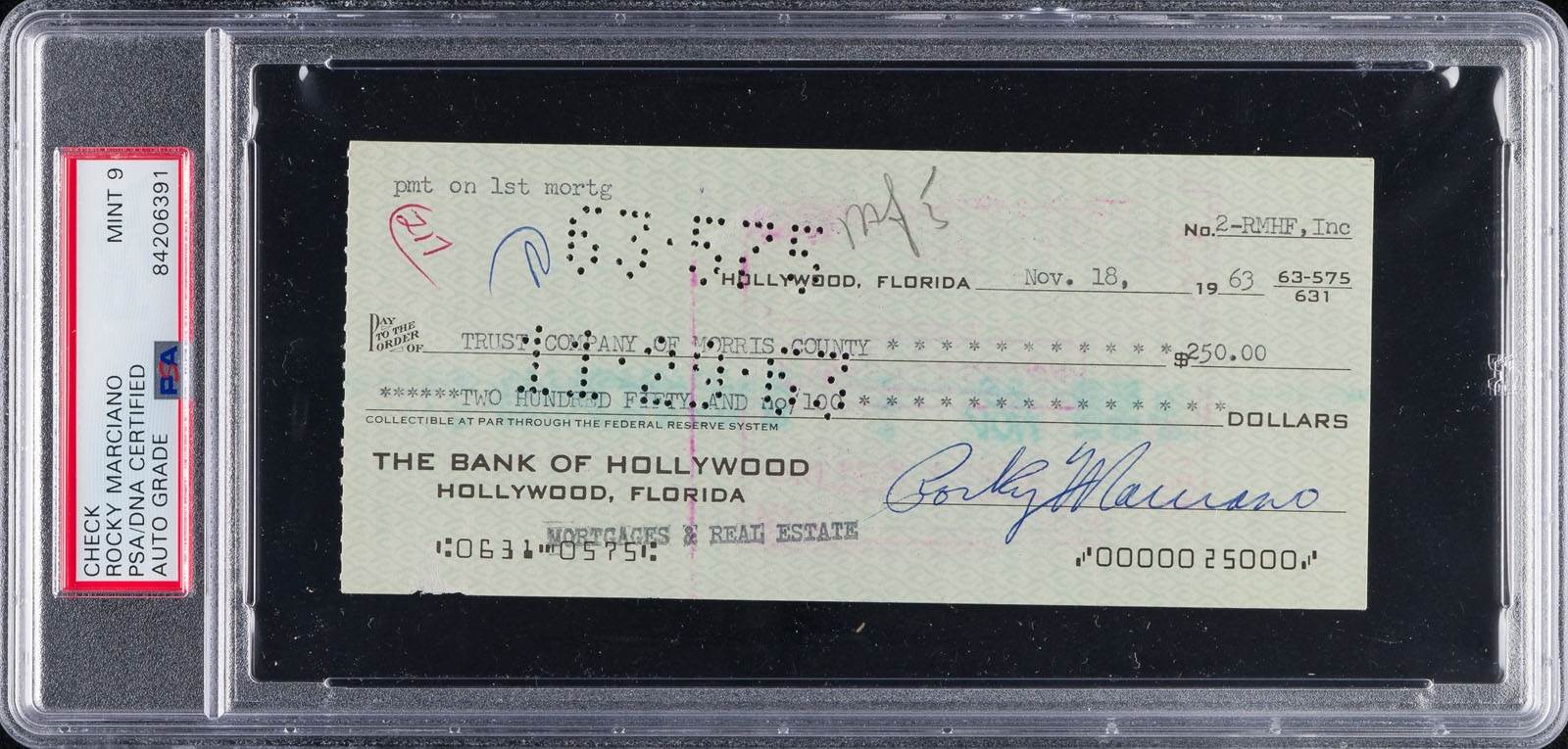 Bank check, dated October 2, 1963, signed in blue ink by legendary heavyweight boxing champion Rocky Marciano. PSA/DNA has encapsulated the check and graded the signature MINT 9. The check, drawn on The Bank of Hollywood in Hollywood, Florida, is made out to “Trust Company of Morris County” in the amount of $250. Signed “Rocky Marciano” along the base. Rocky Marciano is the only heavyweight-boxing champion in history to retire undefeated. Unfortunately, his untimely death in 1969, one day before his forty-sixth birthday, has resulted in the scarcity of his signature examples today. The very few checks from the Marciano estate that have surfaced in recent years have quickly disappeared into collections and are not readily available in the marketplace. The check (6 x 2.75 inches), which has normal bank cancellation stamps and holes, displays a small abrasion in the lower left corner and a few small written notation along the top border. In Very Good to Excellent condition overall. Reserve $300. Estimate (open).