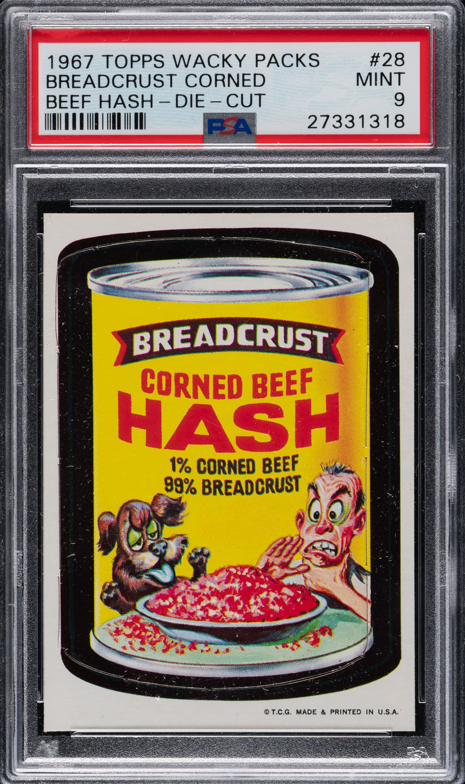 Graded MINT 9 by PSA. One of only seven examples graded at this level with just one higher out of 115 cards evaluated to date. Ultra high-grade example of card #28 "Breadcrust Corned Beef Hash" from the popular 1967 Wacky Packages Die-Cut series. Bright and clean, both front and back, with brilliant colors, four sharp corners, and excellent centering. Crisp and clean reverse. This is an extraordinary ultra high-grade sample from one of the 1960s' most popular and historically significant nonsport-card sets. Reserve $300. Estimate (open).
