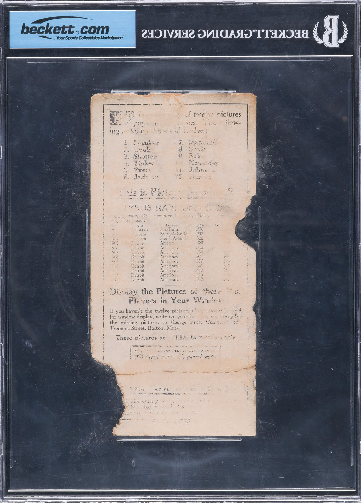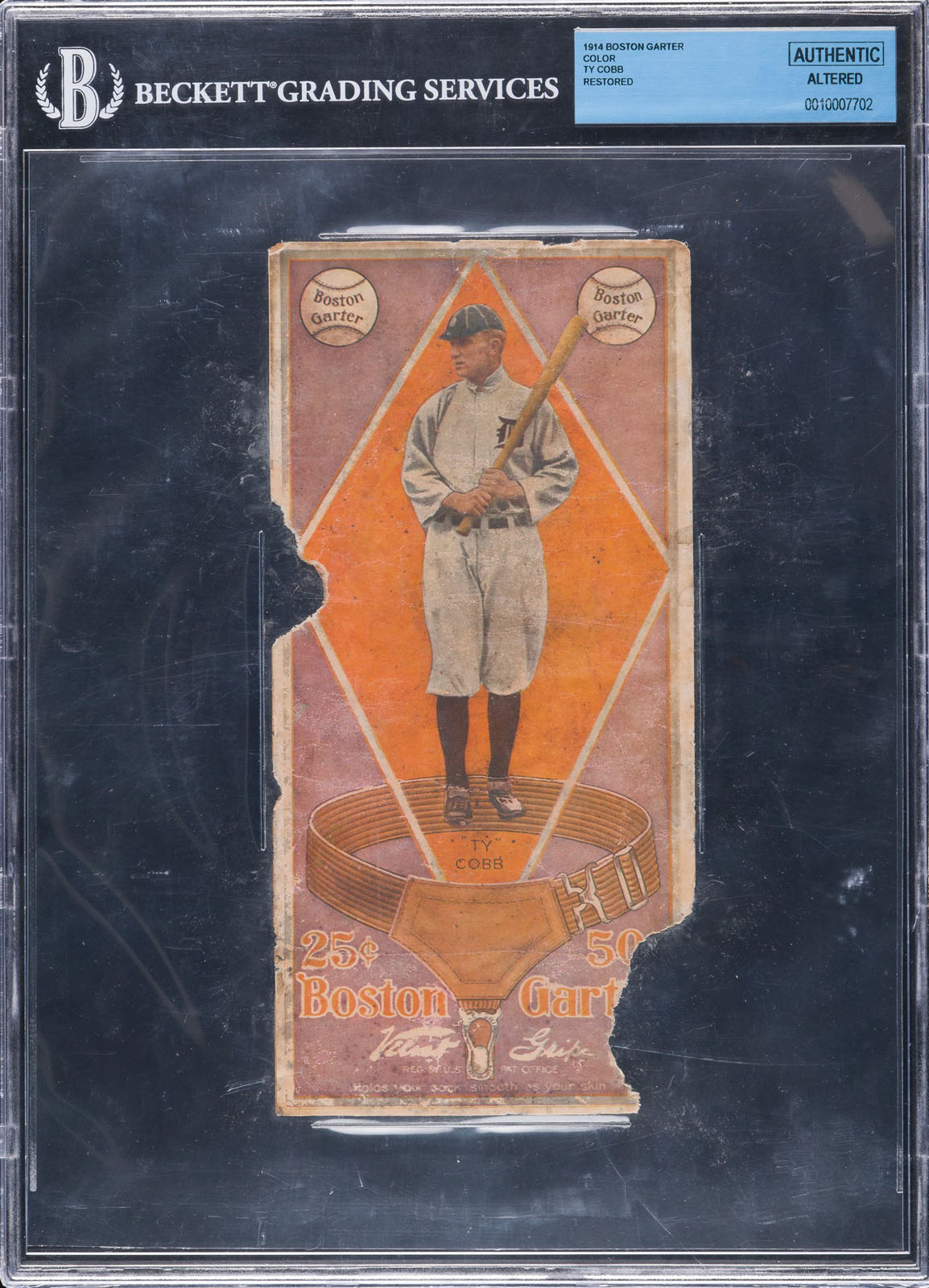 The 1914 Boston Garter set is one of the most beautiful card issues ever produced. It is also one of the rarest. It is a privilege for Robert Edward Auctions to offer the key card of Ty Cobb from this extraordinary set. To the best of our knowledge, there are three examples (including the offered) of Ty Cobb known to exist. Boston Garters have always been one of the most highly prized of all early twentieth-century cards. In the past this set has been identified as being issued in 1913, but it now seems clear the correct year of issue is actually 1914. All Boston Garters are extremely rare. As noted on the reverse, only one card was issued with each box of twelve garters, and the cards were to be displayed by retailers in their store windows. The reverse includes a checklist for the entire set, and Cobb's batting and fielding records are listed through the 1913 season. The unparalleled quality of the lithography and the unique concept of the set both contribute to making Boston Garters one of the most distinctive and noteworthy baseball-card sets ever issued. The large-format card measures 4 x 8.25 inches. This low-grade example represents a rare opportunity for the collector who wants a real 1914 Boston Garter card of Ty Cobb at an affordable level. Despite the obvious condition problems of this example, the image of Cobb in a batting stance is exceptionally bright and crisp. The card has undergone extensive professional restoration, including mending two halves together and inpainting of loss color. This card would be a highlight in even the most advanced card collection in the world and represents an extremely rare opportunity to acquire one of the key cards from the legendary 1914 Boston Garter set. Encapsulated as Authentic (Restored) by BGS. Reserve $5,000. Estimate $10,000+.