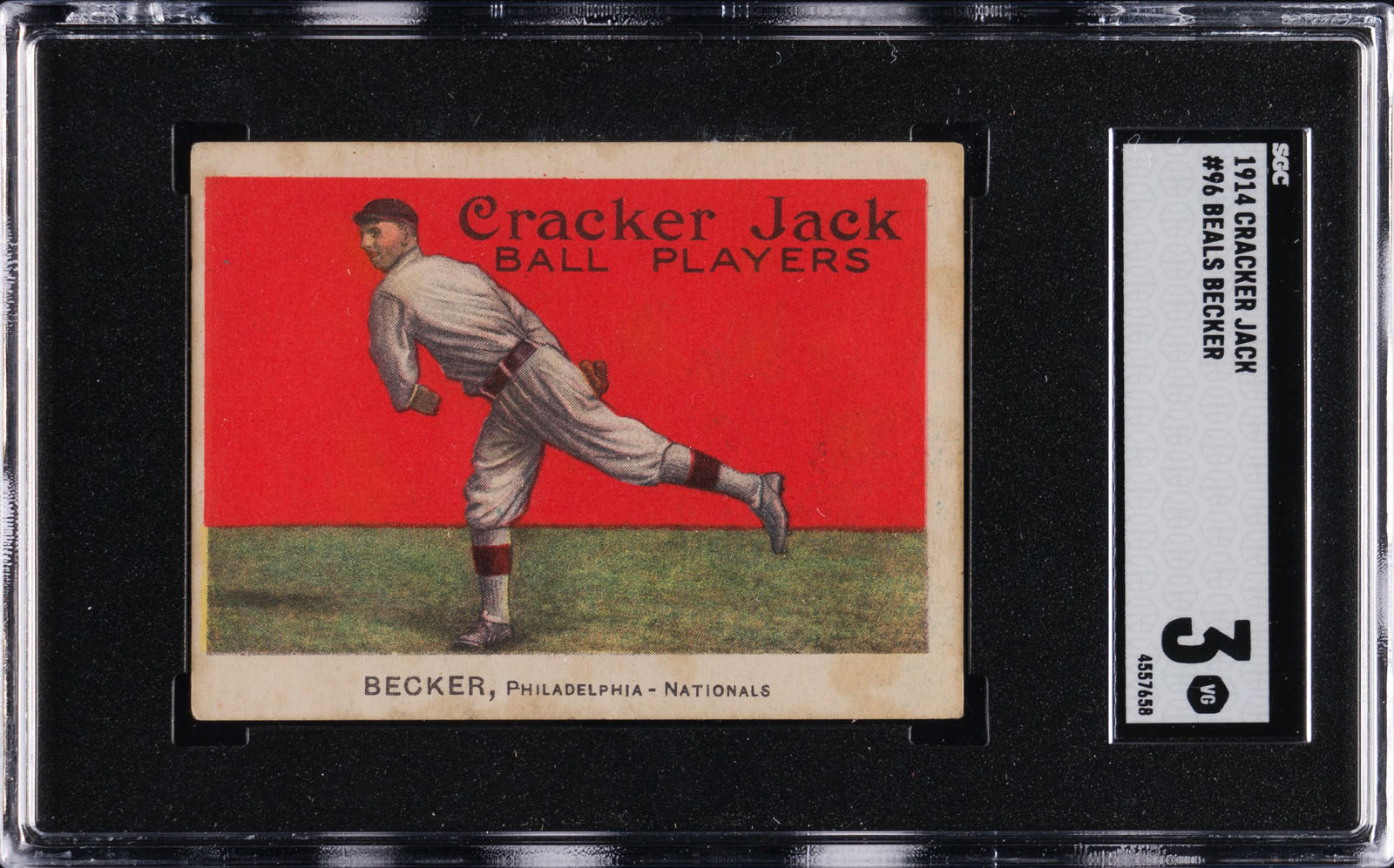 Graded VG 3 by SGC (submitted by REA). Attractive mid-grade example of #96 Beals Becker (Philadelphia Phillies) from the legendary 1914 Cracker Jack series. The offered card displays bold colors, flawless registration, and light, even wear on the corners. Centering is toward the left (when held horizontally as intended) and light staining is visible on the front and back. There is a crease above his image, which accounts for the assigned grade. This is an outstanding example from this classic set that would make a worthy addition to any high-quality 1914 Cracker Jack set or prewar-card collection. Reserve $100. Estimate (open).