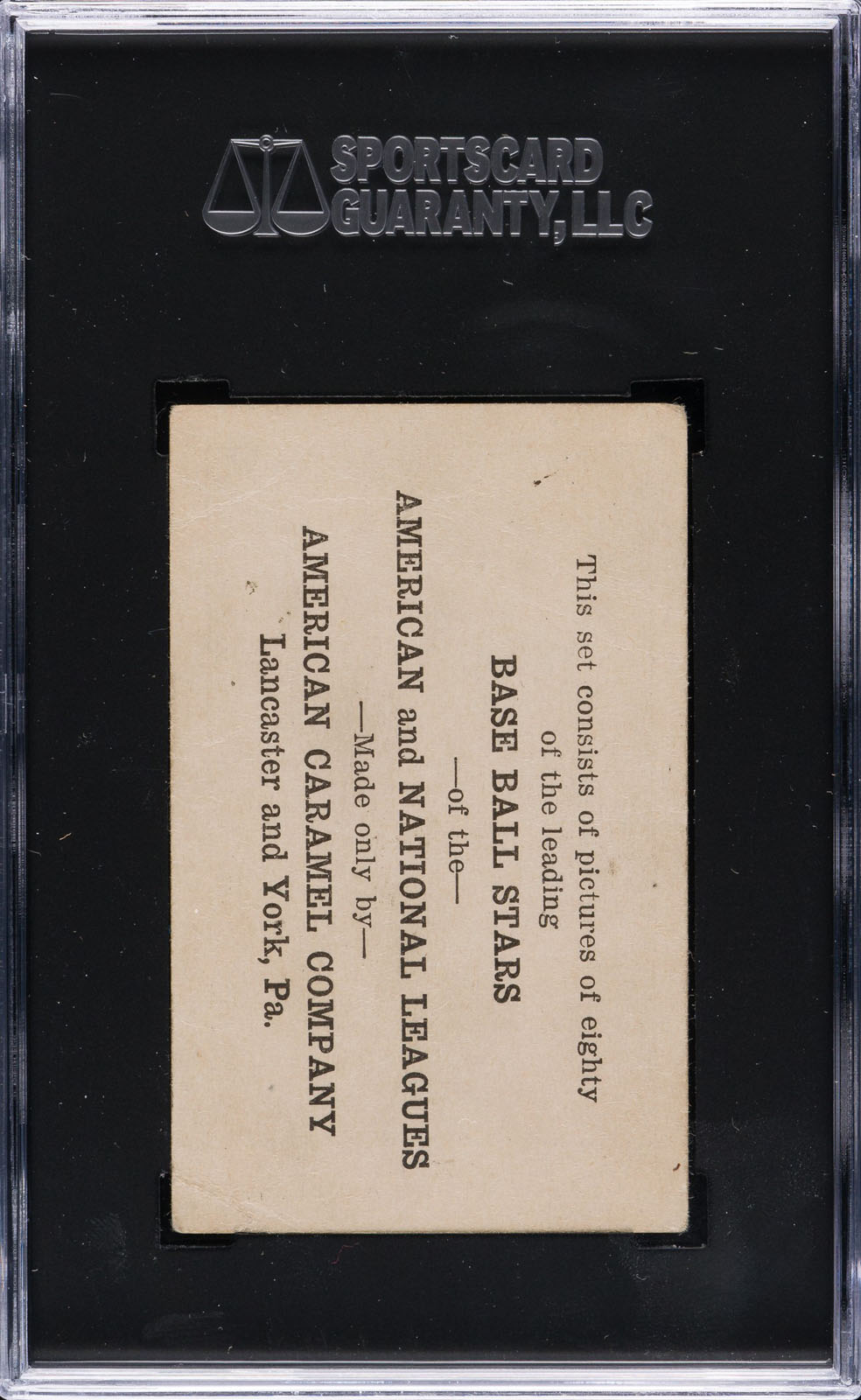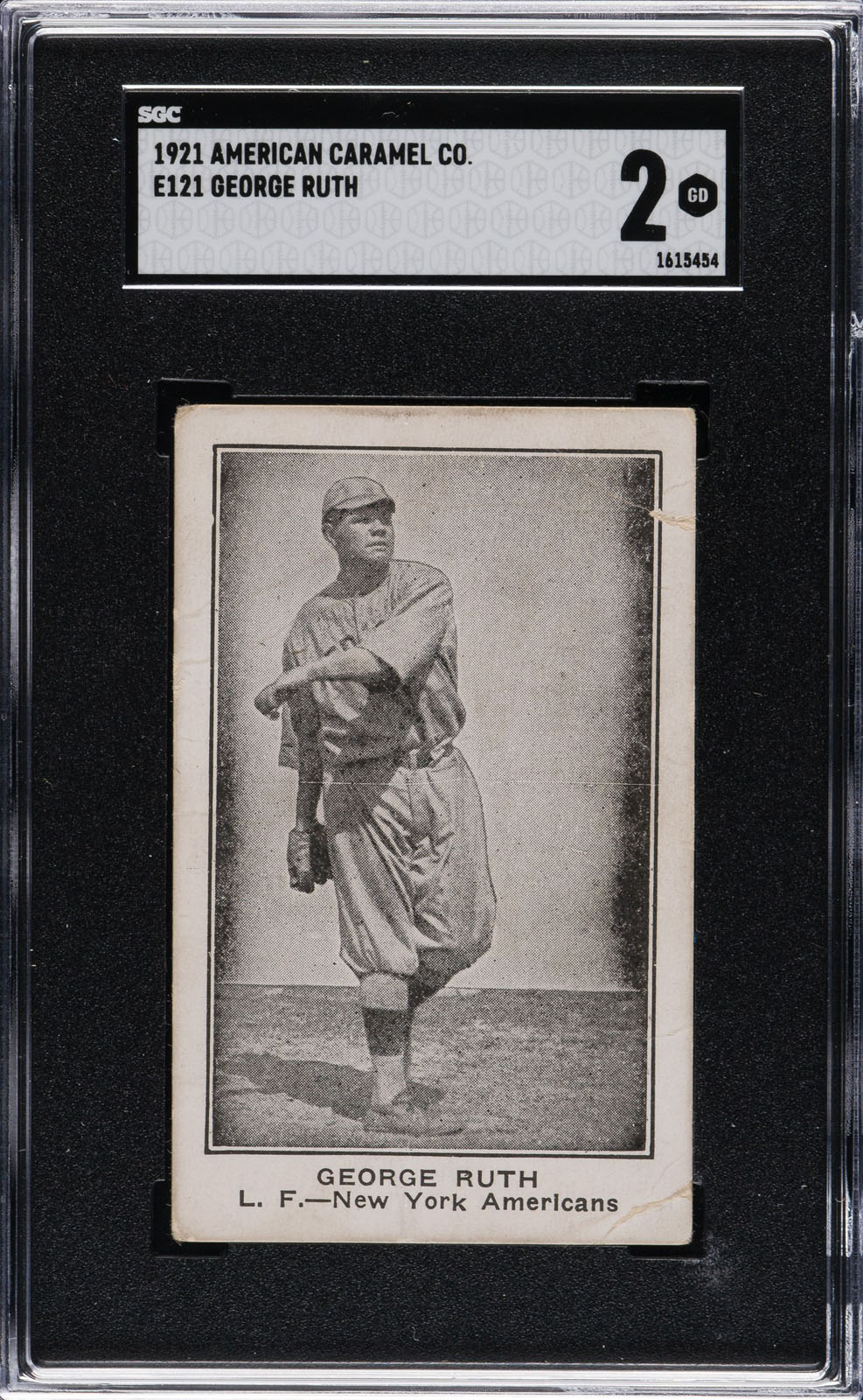 Presented is an extremely pleasing E121 American Caramel card of Babe Ruth. This is one of the premier early Ruth cards and one of the very few dating from the early 1920s. This card is part of an exciting, fresh-to-the-hobby find of caramel cards, including twenty-one Lou Gertenrich cards, a 1914 Cracker Jack Mathewson, and a second E121 American Caramel Babe Ruth card, saved by the family of the original owner who lived in the Midwest, all consigned to this auction. While the image of Ruth is crisp and well centered, the card is graded GOOD 2 by SGC (submitted by REA) due to several unobtrusive creases. The reverse is clean with bold black text. One of several different cards of Ruth in the E121 set, this is one of the all-time classic Babe Ruth cards of the 1920s. Referred to on checklists as the Babe Ruth "George" variation, this popular card features Ruth in a full-length throwing pose. It is interesting to note that the young, but already very celebrated, Ruth is pictured on this card in a Boston uniform, though he is appropriately identified below as a member of the New York Americans. "Boston" (mostly covered by Ruth's throwing arm) can be clearly seen across Ruth's chest upon close examination. In fact, this photograph of Ruth is the very same image which was used on Ruth's 1917 E135 Collins-McCarthy candy card. Apparently the American Caramel Company was going to print and did not have the time to pursue an updated image of Ruth with his new team. This is an ideal example for someone who wants a very presentable example of this classic Babe Ruth card, from the heart of his playing days, without spending the tens of thousands of dollars that a higher-graded example would command. Reserve $2,500. Estimate $5,000+.