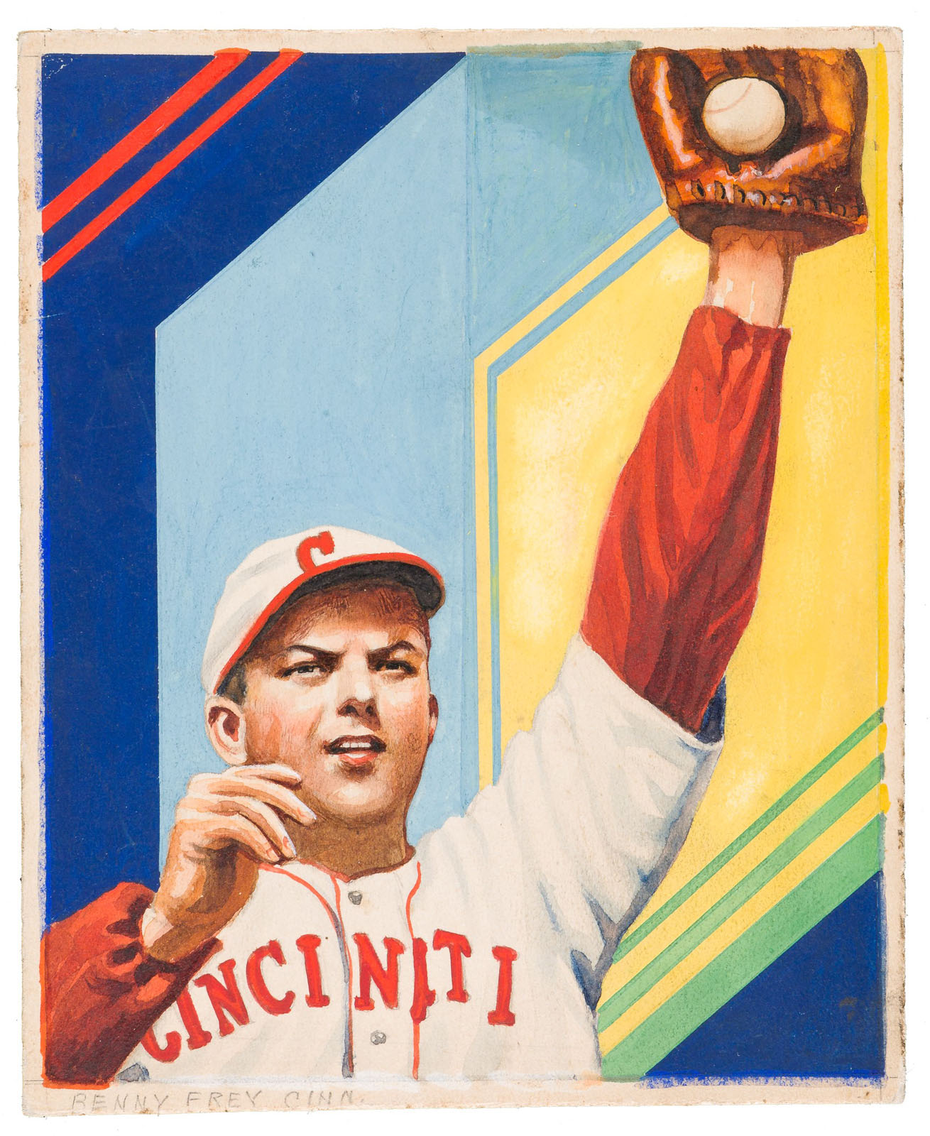 Original unissued artwork featuring Benny Frey of the Cincinnati Reds to be used in the 1935 R327 Diamond Stars series. This artwork of Frey was created (but never used) by National Chicle to be included in its Diamond Stars series. The Diamond Stars set is highly prized by collectors in large part because of the beautiful artwork and art deco-inspired designs of the set. The detail and the geometric background designs of the offered example are exceptional. Artwork for card sets from the 1930s is exceedingly rare. Back in the late 1970s a group of material surfaced in the collecting world directly from the family of a National Chicle employee, which included approximately thirty original R327 Diamond Star artworks, approximately twenty-five National Chicle Football artworks, and approximately one-hundred additional artworks from several National Chicle nonsport sets (including R136 Sky Birds). The offered artwork originates directly from this historic find and is an exceptional example of original 1930s gum card artworks. As is the case with all Diamond Stars artworks, the artwork is on thick artist’s board, and measures 4.5 x 5.5 inches. Extremely clean, with sharp, bright, crisp colors. In Excellent to Mint condition. Reserve $500. Estimate (open).