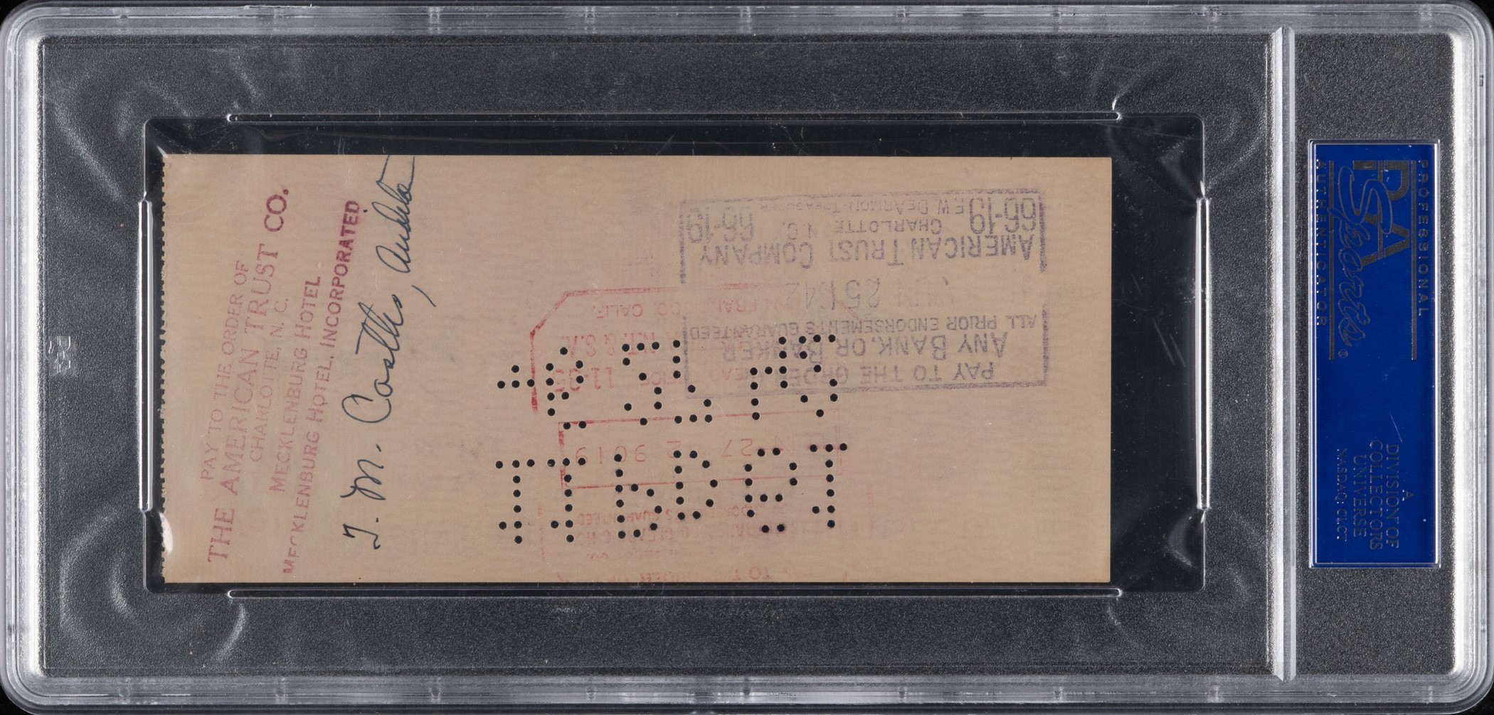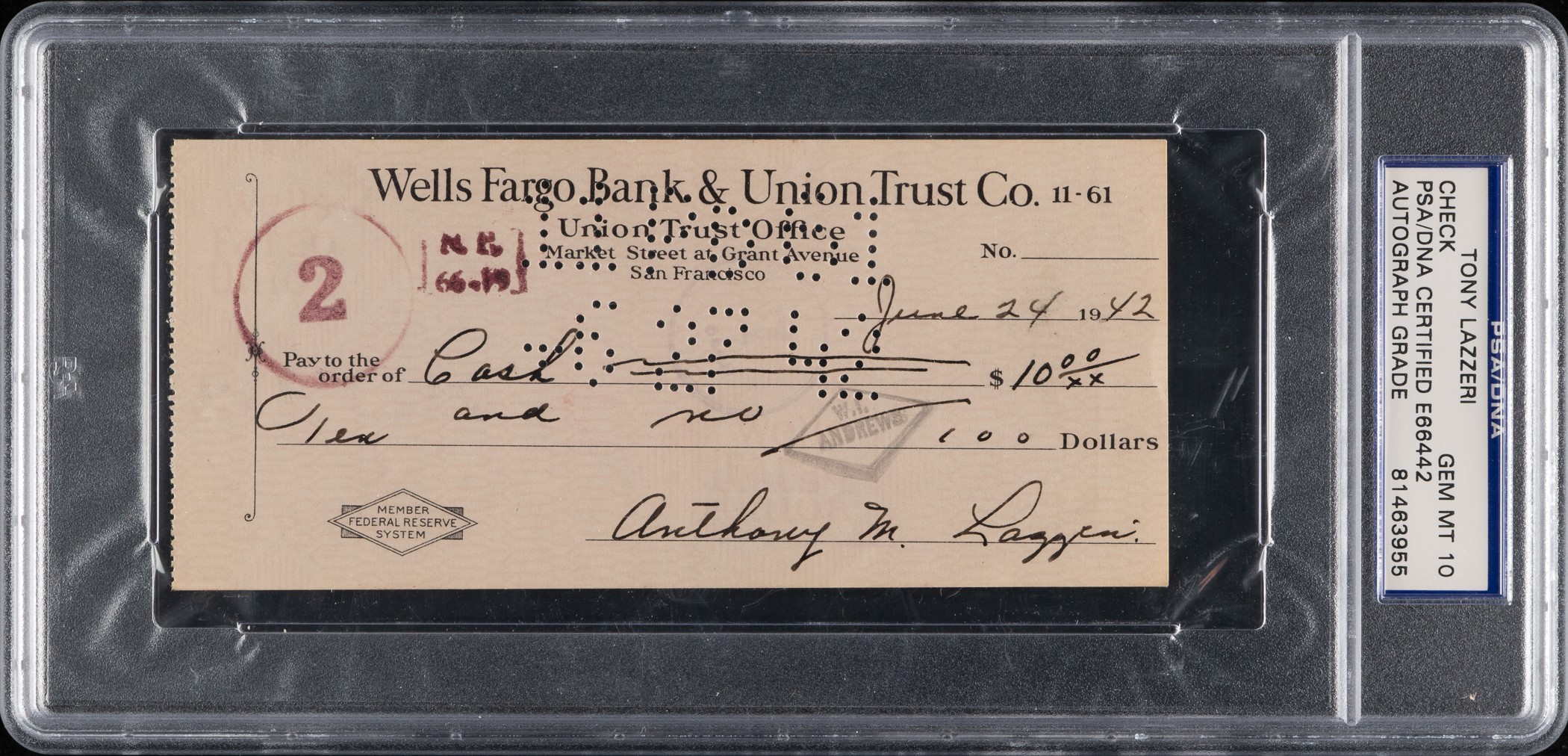 Bank check, dated June 24, 1942, signed in black fountain pen by Hall of Fame second baseman Tony Lazzeri. PSA/DNA has encapsulated the check and graded the signature GEM MINT 10. The check, drawn on the Wells Fargo Bank & Union Trust Co. of San Francisco, California, is made out to “Cash” in the amount of $10.00. Signed “Anthony M. Lazzeri” along the base. Endorsed by “J. M. Castles, Auditor” on the reverse. The check (6 x 2.75 inches), which has normal bank cancellation stamps and holes (none of which touch upon the signature) remains in Excellent to Mint condition. Reserve $300. Estimate (open).