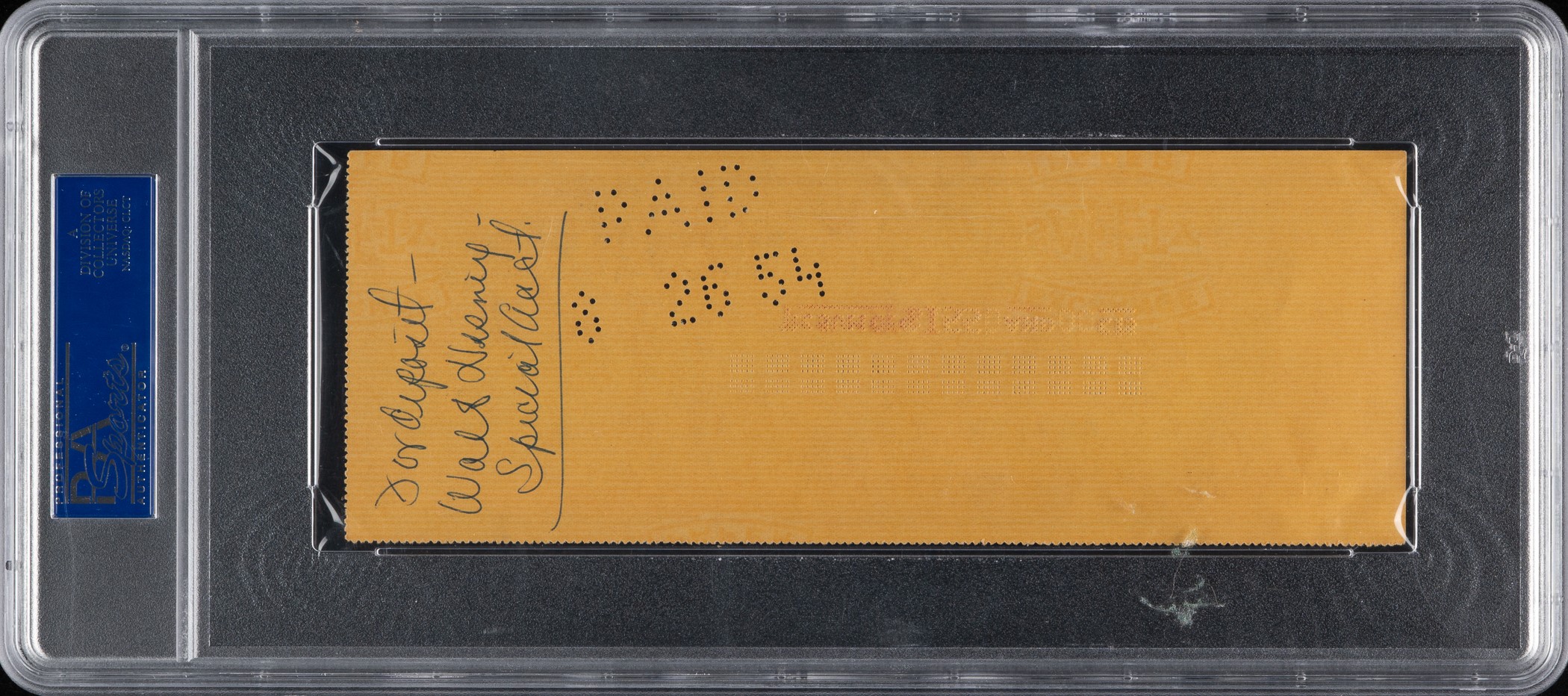 Personal check, dated August 26, 1954, boldly signed in blue fountain pen by famed animation pioneer Walt Disney. PSA/DNA has encapsulated the check and graded the signature MINT 9. The check, made out to "Walt Disney-Special Acct." in the amount of $1,550 has been beautifully signed "Walter E. Disney" along the base. Disney's signature, scripted in his flourishing, artistic style measures over four inches in length and represents an outstanding example. Despite his celebrity status, authentic Walt Disney signatures remain quite scarce, as many of the examples found today are secretarial. For that reason, Walt Disney signed checks, due to their inherent authenticity, are especially prized by collectors. This is a particularly interesting check in terms of its date in that construction for Disneyland began on July 21, 1954, just one month before this check was written. The check (8.25 x 3 inches) bears Disney's name printed along the top and displays normal bank cancellation stamps and holes (none of which touch upon the signature). Excellent to Mint condition. Reserve $500. Estimate (open).