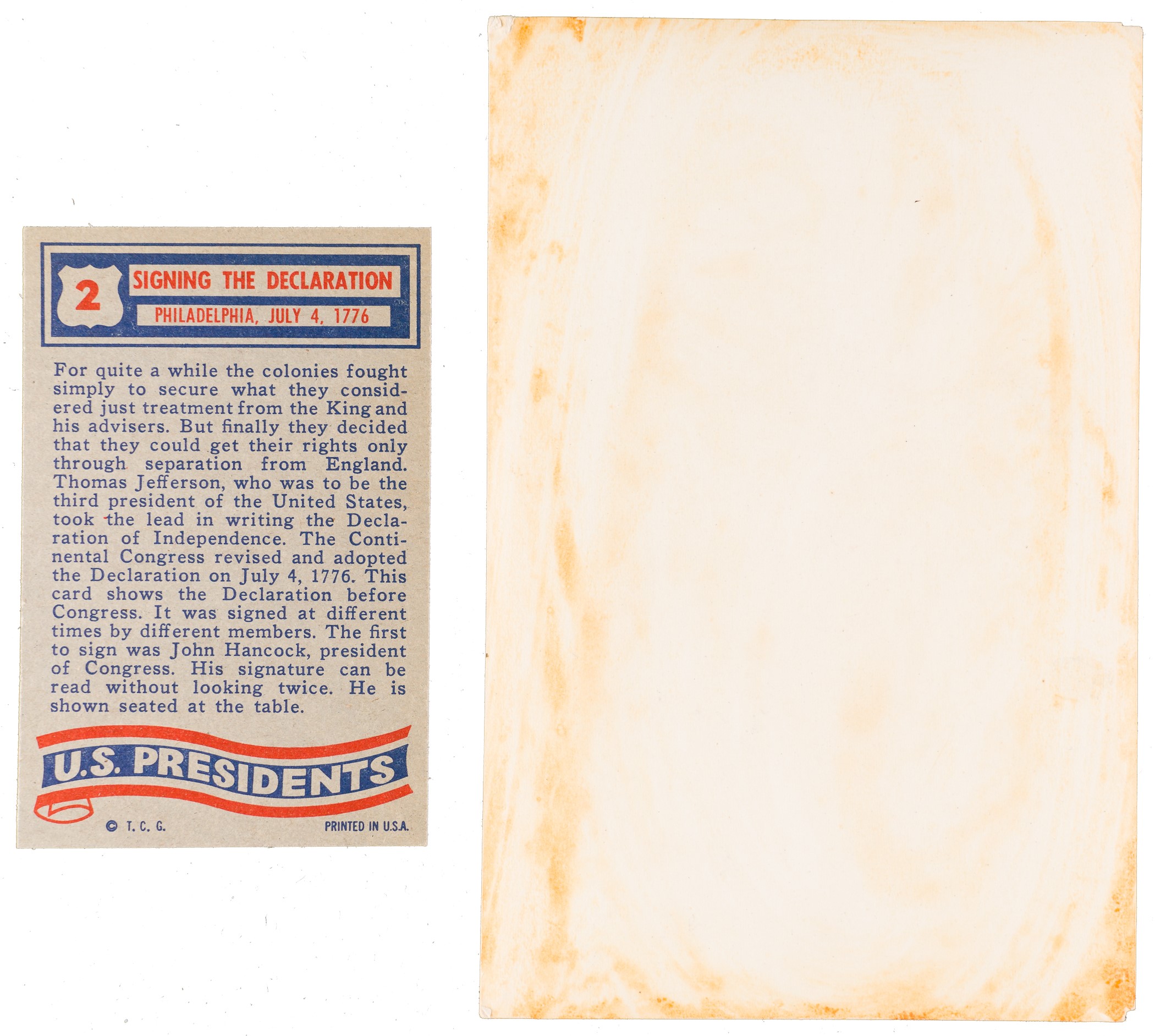 Original 1956 Topps "U.S. Presidents" card artwork used to produce card #2 Declaration of Independence from this extremely popular set which features full-color images of all the U.S. Presidents to that point. This particular artwork features a very detailed image of the signing of the Declaration of Independence. This is one of the most important and striking cards from this classic nonsport set. Measuring approximately 4 by 6 inches, the artwork is in Excellent condition with light glue residue present on the reverse. The artwork includes additional image area that was cropped out by Topps on the issued card. This is an exceptional original artwork from one of the 1950s most popular nonsport sets. Accompanied by an example of the issued card which this work appears on. Reserve $500. Estimate (open).