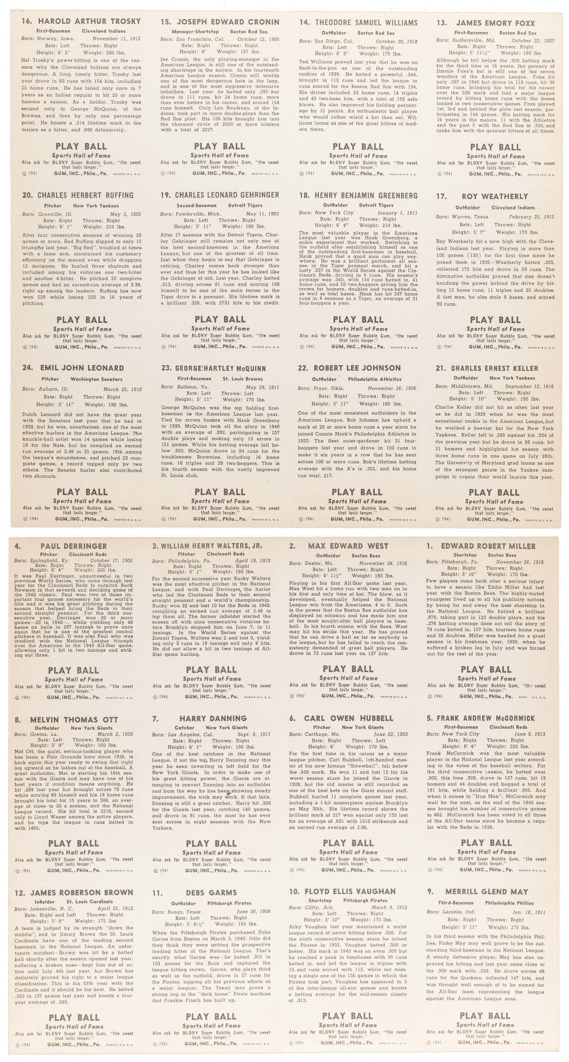 The 1941 Play Ball paper set was issued in uncut sheets of twelve cards per sheet. Two sheets comprise the complete set, representing twenty-four different card designs. The cards on the two paper sheets correspond to Nos. 1 through 24 of the regular 1941 Play Ball set. This is a strong series in terms of stars, including Hall of Famers Carl Hubbell, Mel Ott, Arky Vaughn, Jimmie Foxx, Ted Williams, Joe Cronin, Hank Greenberg, Charlie Gehringer, and Red Ruffing. The cards are identical in all respects to the regular 1941 Play Ball cards but are printed on paper-thin stock. Originally sold for a penny a sheet, they were intended to be hand-cut into individual cards by youngsters. Play Ball issued cards in this manner for a very short time, as an experiment in response to the scarcity of paper supplies during WWII. The need to conserve scarce resources such as paper during the war soon resulted in Gum, Inc., ceasing card production during the balance of the war years. Two 12-card sheets, representing a complete set of this unusual and rare war-time series, in their original uncut form. Both sheets are bright, crisp, and clean. Both technically in Excellent condition due to light corner wear. Total: 2 sheets. Reserve $500. Estimate (open).