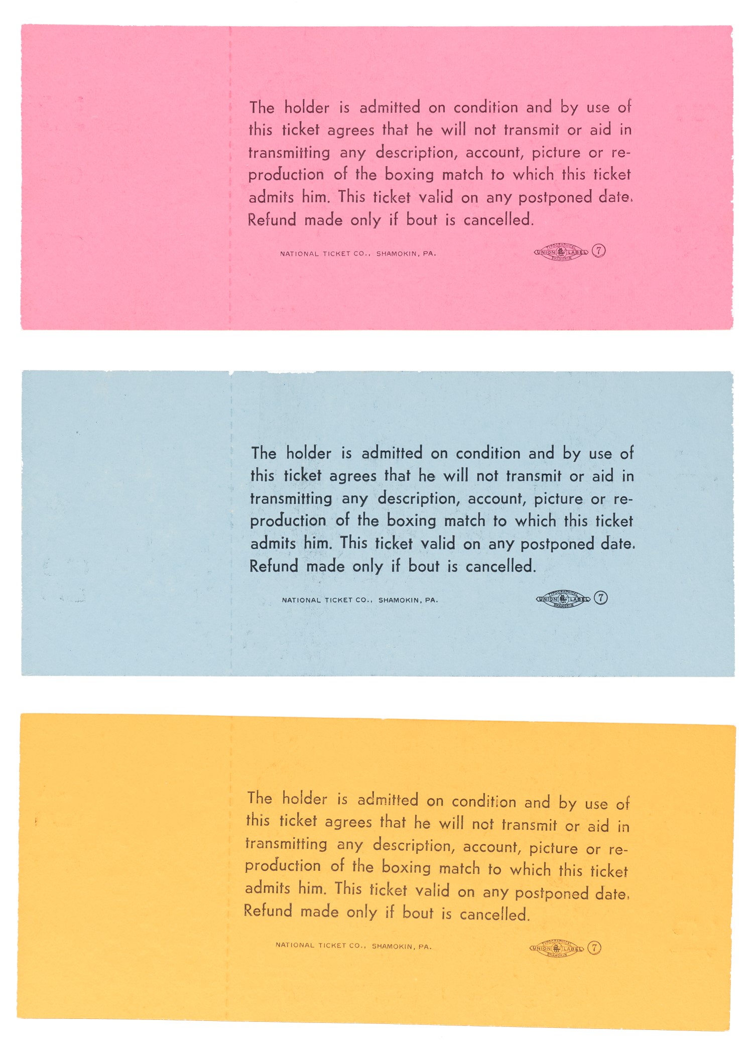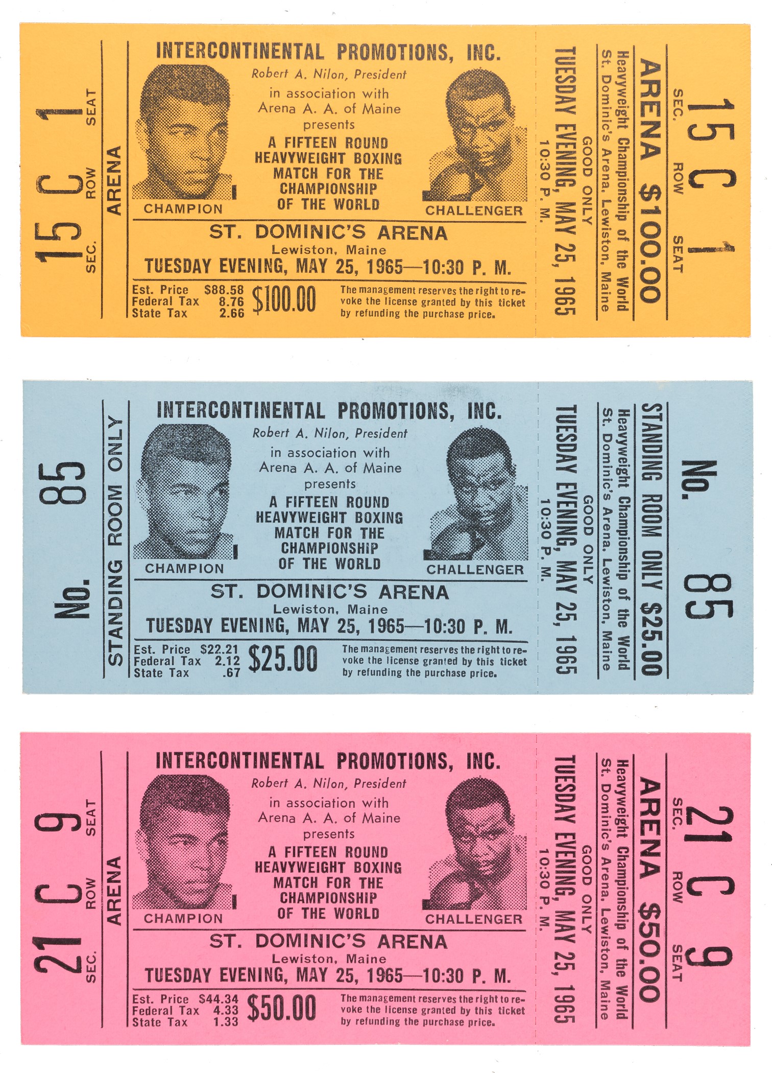 Three full tickets to the heavyweight championship boxing match between champion Muhammad Ali and challenger Sonny Liston held at St. Dominic's Arena in Lewiston, Maine, on May 25, 1965. This collection represents three of the four color variations produced for the bout (missing the orange variation). Each ticket features photos of the respective fighters, with two labeled "Arena" and one (blue variation) labeled "Standing Room Only." This was the controversial rematch that ended in a first-round knockout by Ali after he downed Liston with what is known today as "the phantom punch." It is also the bout that produced one of the most iconic photographs in all of sports: Neil Leifer's image of Ali standing triumphantly over the fallen Liston. Each of the tickets (5.25 x 2.25 inches) remains in Near Mint condition. Total: 3 tickets. Reserve $100. Estimate (open).