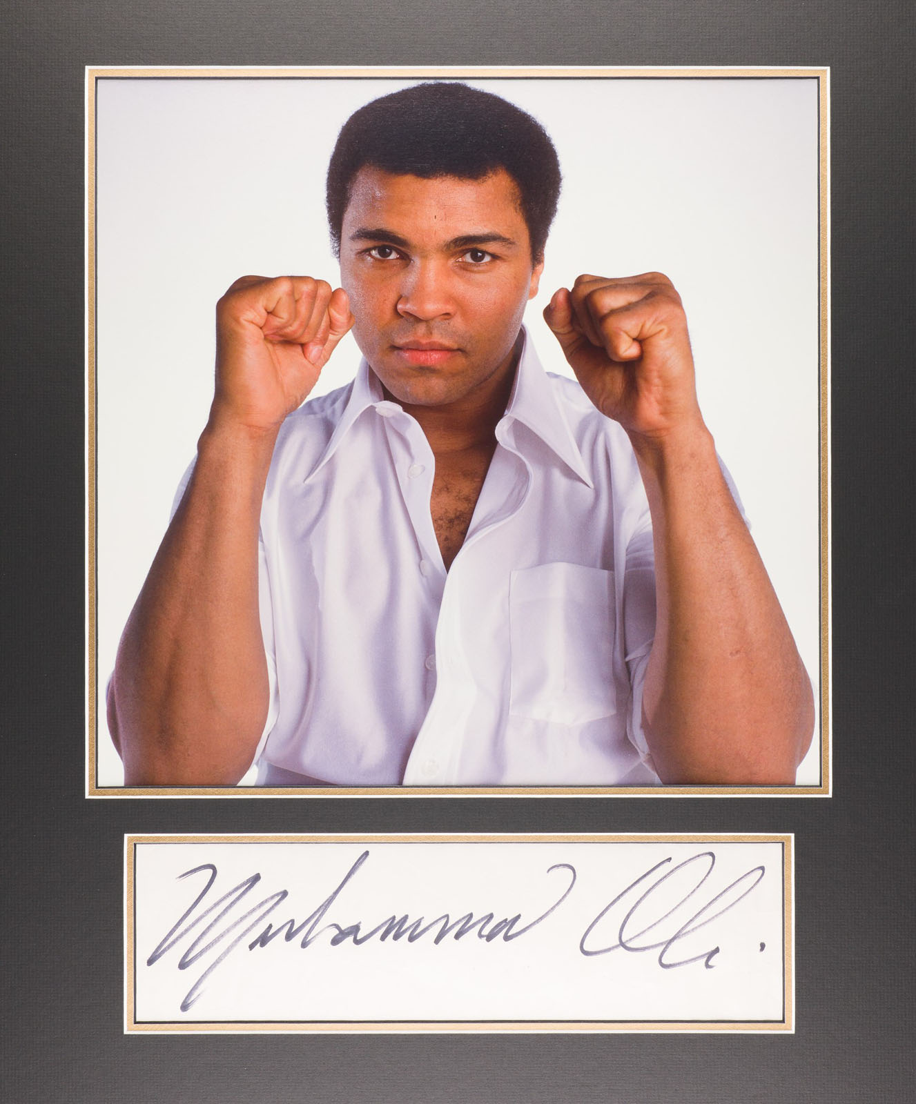 Enormous Muhammad Ali signature example professionally matted together with a large color photo (15.25 x 15 inches; visible dimensions) of Ali taken by John Stewart (produced from the original negative). Ali scripted this large signature example in 1977 for an unspecified promotional project that never came to fruition. Ali's signature, rendered in black marker, grades "9" and measures 13.5 inches in length, making it one of the largest Ali signatures in the hobby. The sheet (13.75 x 3.75 inches; visible dimensions) displays several light creases and is in apparent Very Good to Excellent condition. The photo is in apparent Near Mint condition. Total dimensions: 20 x 24 inches. Full LOA from Steve Grad and Brian Sobrero/Beckett Authentication Services. The size/weight of this item requires that there will be an additional shipping charge for this lot. Reserve $300. Estimate (open).