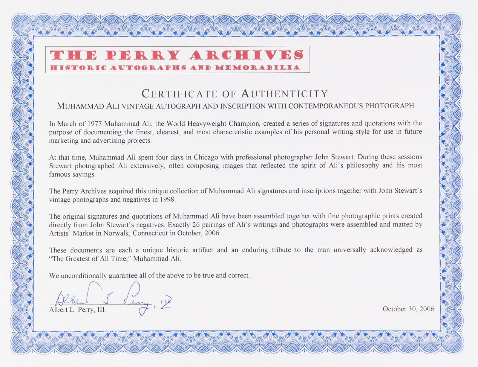In March 1977, Muhammad Ali created a series of signatures and quotations with the purpose of documenting the finest, clearest, and most characteristic examples of his personal writing style for use in future marketing and advertising projects. To that end, he was given large sheets of white paper upon which he proceeded to create the signatures and passages offered here. For the signatures, Ali scripted his name numerous times on a single sheet, much like ballplayers did on their Hillerich & Bradsby bat contracts, so that the finest example(s) could later be chosen for the intended project(s). He then did the same for certain words and "trademark" sayings. The larger, more extensive passages are unique and reflect his personal sentiments with regard to life and religion. In conjunction with the signing session, Ali was paired with John Stewart, who was one of the field's top commercial photographers. During that four-day period Stewart photographed Ali extensively, often composing images that reflected the spirit of Ali's philosophy and most famous sayings. Unfortunately, whatever project(s) the signatures, passages, and photographs were intended for never came to fruition. As a result, all of the material produced at the time was kept in storage and did not reappear until over twenty years later, when it was sold at public auction. It was at that time that our consignor purchased not only the sheets containing the numerous Ali signatures, words, and sayings, but the original John Stewart photographs of Ali and all of the negatives. Ali was still boxing champion of the world when he completed this project, and his penmanship shows no evidence of the debilitating physical problems that would greatly diminish the quality of both his speech and handwriting a few short years later. These are unquestionably the premier Ali signature displays in the hobby today and Robert Edward Auctions is proud to have been chosen by our consignor to offer them in this ideal form to the collecting community.