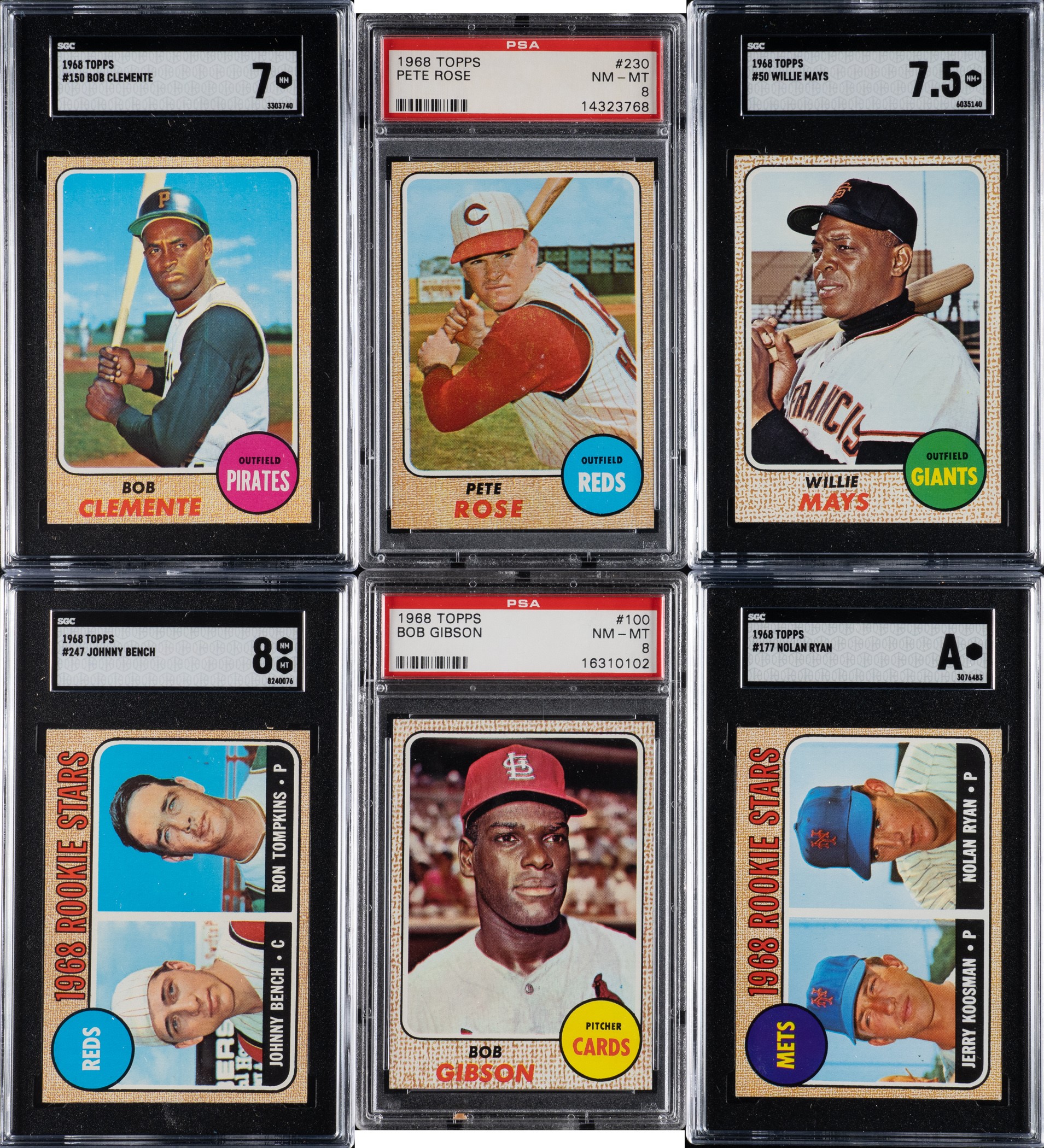 Presented is a crisp and clean near-complete set of 1968 Topps consisting of 596 different cards (out of 598 in the set). Missing only #80 Carew and 280 Mantle for completion. The 1968 Topps set includes the extremely popular “combo” cards featuring more than one player with #480 Managers Dream (with Roberto Clemente), #490 Superstars (Harmon Killebrew, Mickey Mantle, and Willie Mays), and #530 Bird Belters (Frank and Brooks Robinson). Condition is 62% Nr/Mt to Nr/Mt-Mt (including a few Mint), 33% Ex to Ex-Mt, and 5% slightly lesser (including a few with a possible slight trim). Twenty-seven cards are graded and encapsulated by PSA (21) and SGC (6). Keys: #20 B. Robinson (NM-MT 8), 45 Seaver (Ex-Mt+), 50 Mays (SGC NM+ 7.5), 100 Gibson (NM-MT 8), 110 Aaron (Vg-Ex), 150 Clemente (SGC NM 7), 177 Ryan RC (SGC Authentic), 230 Rose (NM-MT 8), 240 Kaline (Nr/Mt), 247 Bench RC (SGC NM/MT 8), 250 Yastrzemski (Ex-Mt), 330 Maris (Nr/Mt), 355 Banks (Nr/Mt+), 370 Aaron AS (Ex-Mt), 374 Clemente AS (Nr/Mt), 408 Carlton (Nr/Mt), 480 Manager's Dream (Vg), 490 Superstars (NM-MT 8), 500 F. Robinson (Nr/Mt), 520 Brock (Ex-Mt+), 530 Bird Belters (NM-MT 8), and 575 Palmer (Ex). Additional graded: MINT 9 (3 cards): #193, 234, and 531. NM-MT+ 8.5 (1 card): #381 (SGC). NM-MT 8 (18 cards): #159, 180, 186, 285, 308, 310, 321, 334, 350 (SGC), 356, 360, 390, 464, 467, 493, 557, 569, and 598. This is an outstanding high-grade near-complete set (minus two) of one of the great 1960s Topps issues, loaded with Hall of Famers. The total SMR value for just the 27 graded cards (factoring in the one half grade at the lower whole-grade level) is $1,103. Total: 596 cards. The size/weight of this item requires that there will be an additional shipping charge for this lot. Reserve $1,000.
