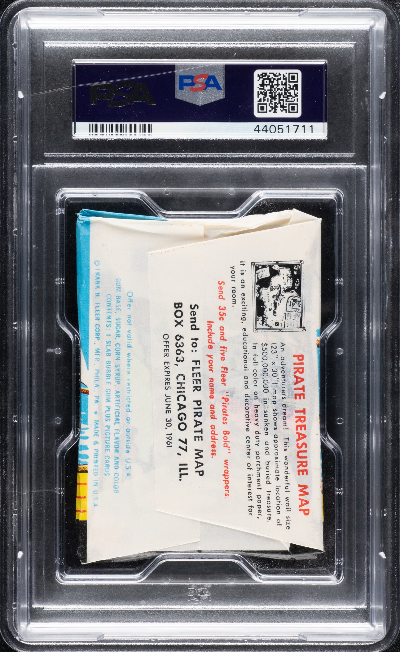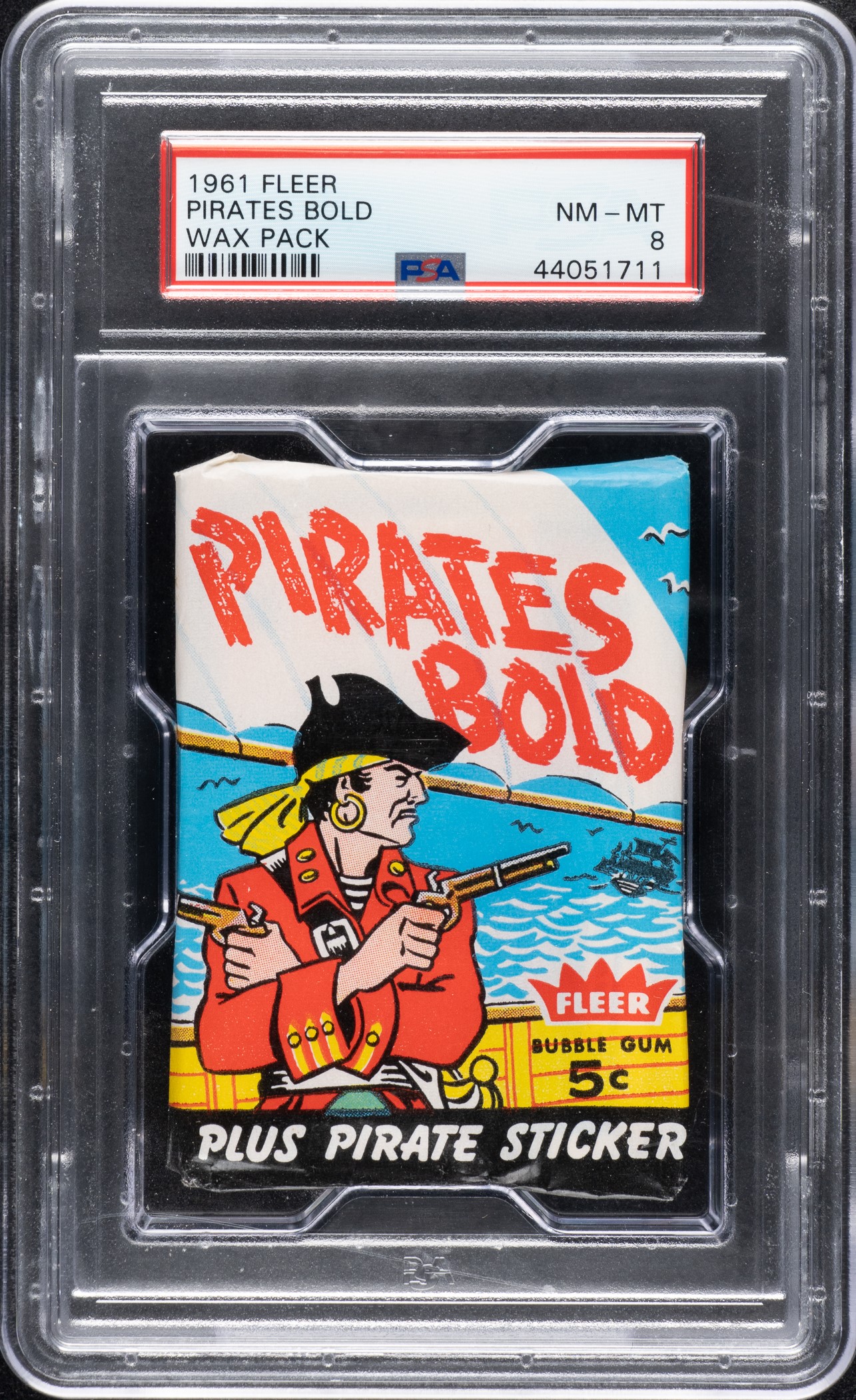 Graded NM-MT 8 by PSA. Offered is an original, unopened five-cent wax pack of 1961 Fleer "Pirates Bold" cards graded and encapsulated NM-MT 8 by PSA. The wax pack is clean with a tight seal along the back and very minor wear at the corners (tiny tear on bottom left mentioned for accuracy). While it is impossible to provide guarantees with reference to grading of unopened material, there is the very real possibility that within this pack are high-grade cards. The pack would make an ideal addition to any advanced nonsport or unopened pack collection. Reserve $300.