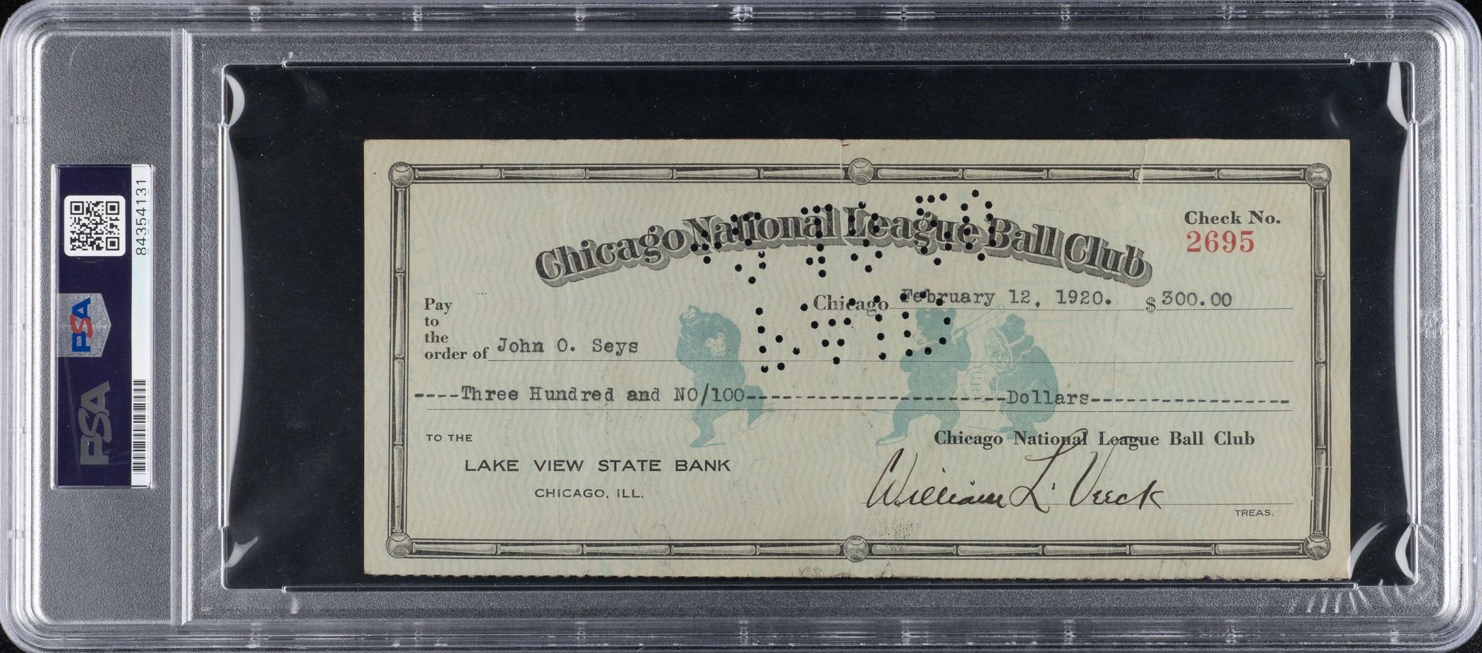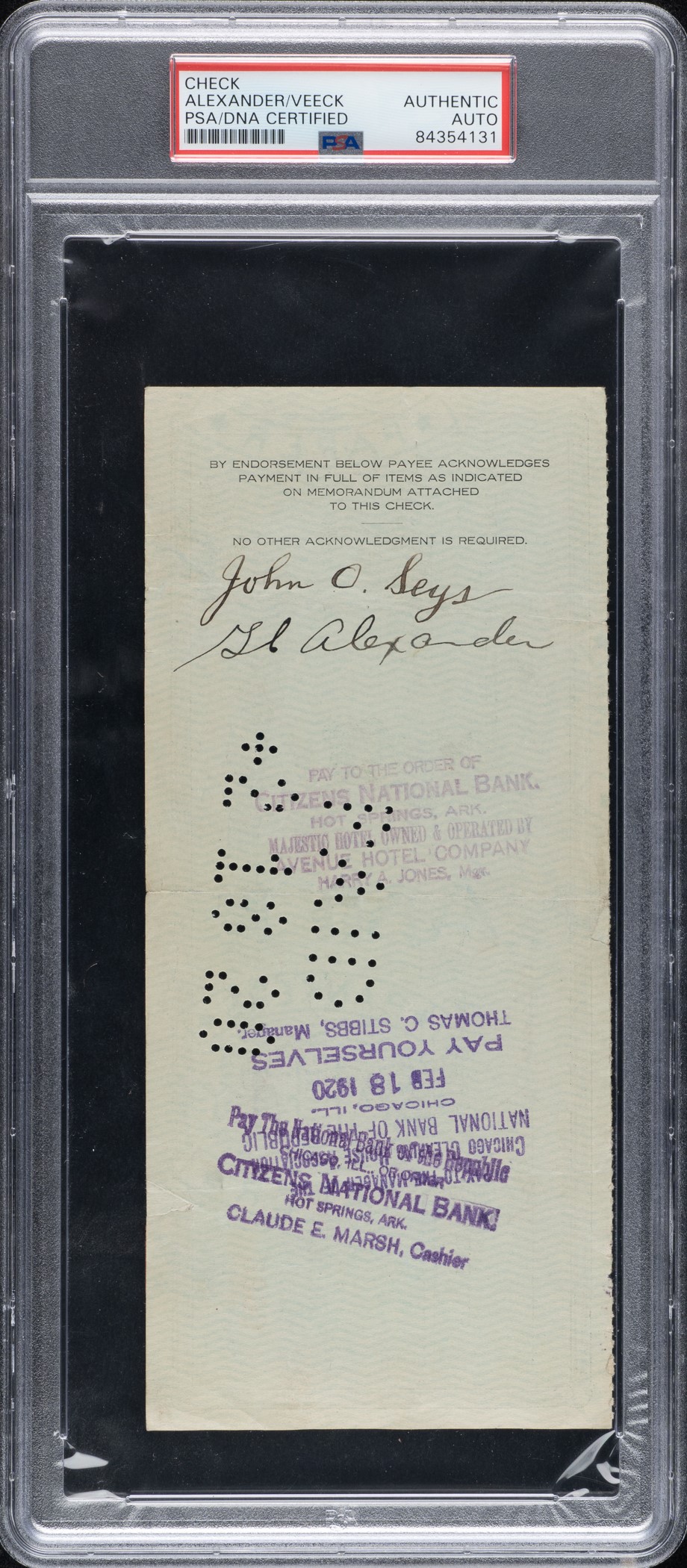 Chicago Cubs payroll check, dated February 12, 1920, issued to John O. Seys (vice-president of Cubs) and endorsed by Hall of Fame pitcher Grover Alexander. PSA/DNA has encapsulated the check and certified the signature as "Authentic." The check, drawn on the Lake View State Bank of Chicago, Illinois, is made out in the amount of $300.00. Signed by team president William L. Veeck (father of Hall of Fame owner Bill Veeck) in the lower-right corner. Endorsed by "GC. Alexander" in black ink on the reverse. Also endorsed in black fountain pen by John O. Seys directly above Alexander's signature. This is an exceptionally early Hall of Famer payroll check, and it comes with a unique provenance. This lot originates from the extraordinary collection of a longtime Chicago Cubs executive, Eldred "Salty" Saltwell, which is consigned to this auction by his family. The collection, which includes a remarkable array of contracts, checks, and other related documents and mementos, will be presented over a series of auctions and will offer publicly for the first time many significant items spanning decades of Chicago baseball.