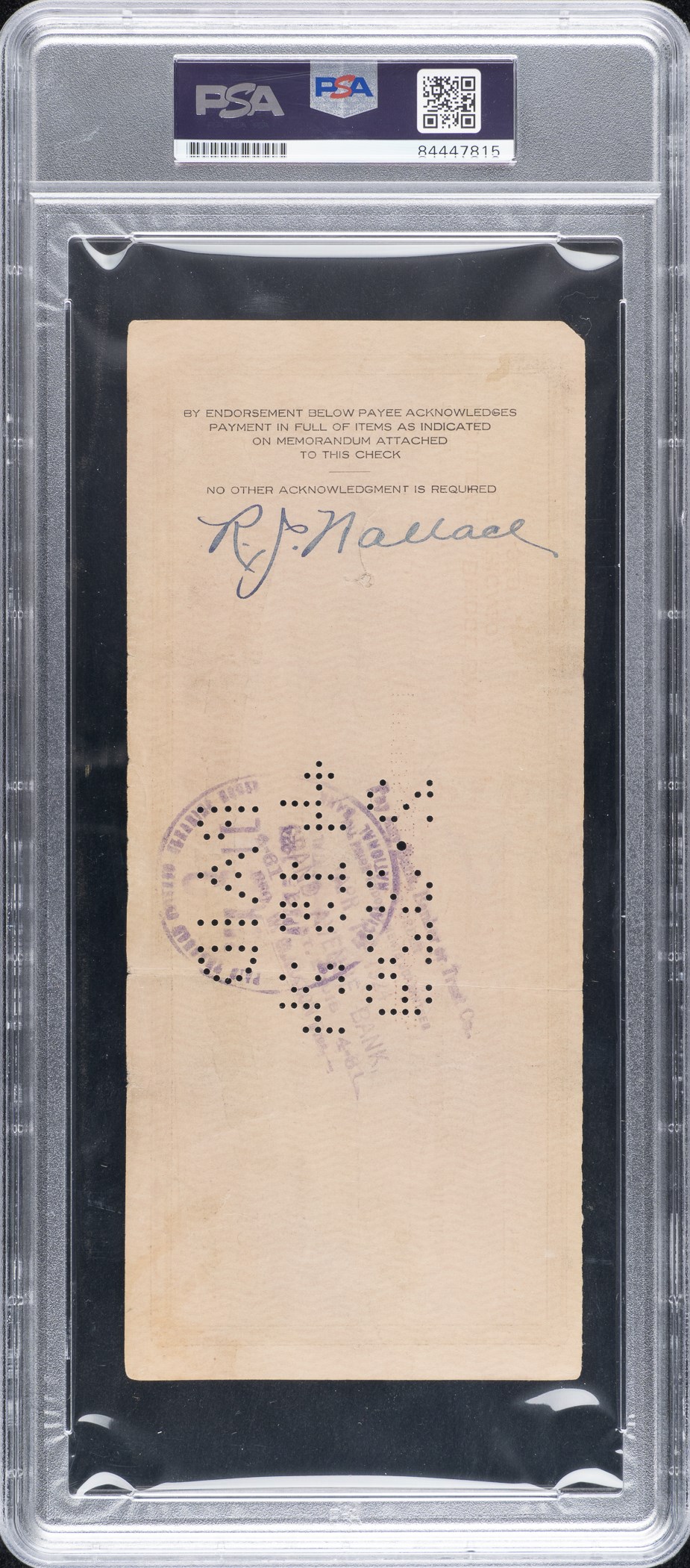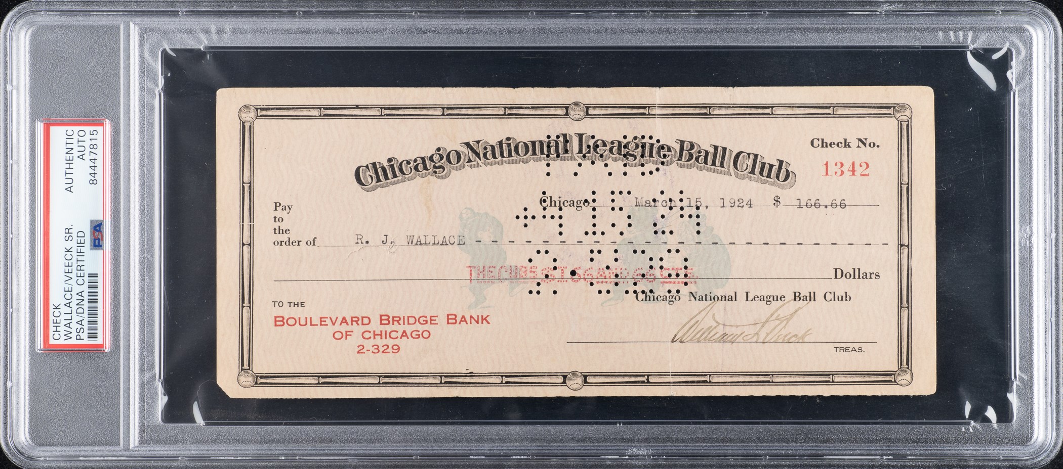 Chicago Cubs payroll check dated March 15, 1924, issued to Hall of Fame shortstop Bobby Wallace, who has endorsed it on the reverse. PSA/DNA has encapsulated the check and certified the signature as Authentic. Bobby Wallace signed personal or bank checks (with Wallace as the issuer) are unknown. This is one of only two Wallace endorsed checks we have handled, both of which are Cubs payroll checks (the other dates from 1923). Wallace, whose playing career ended in 1918, was working for the Cubs as a scout during the 1920s. The check, drawn on the Boulevard Bridge Bank of Chicago, Illinois, is made out to “R. J. Wallace” in the amount of $166.66. Signed by team owner “William L. Veeck” in black fountain pen (grading “7”) along the base (Veeck was the father of Hall of Fame owner Bill Veeck). Wallace has endorsed the check “R. J. Wallace” in blue fountain pen on the reverse (grading "9"). The check (8.5 x 3.75 inches), which has normal bank cancellation stamps and holes (none affect either signature), displays a vertical fold line and is otherwise in Excellent condition. Estimate $300.
