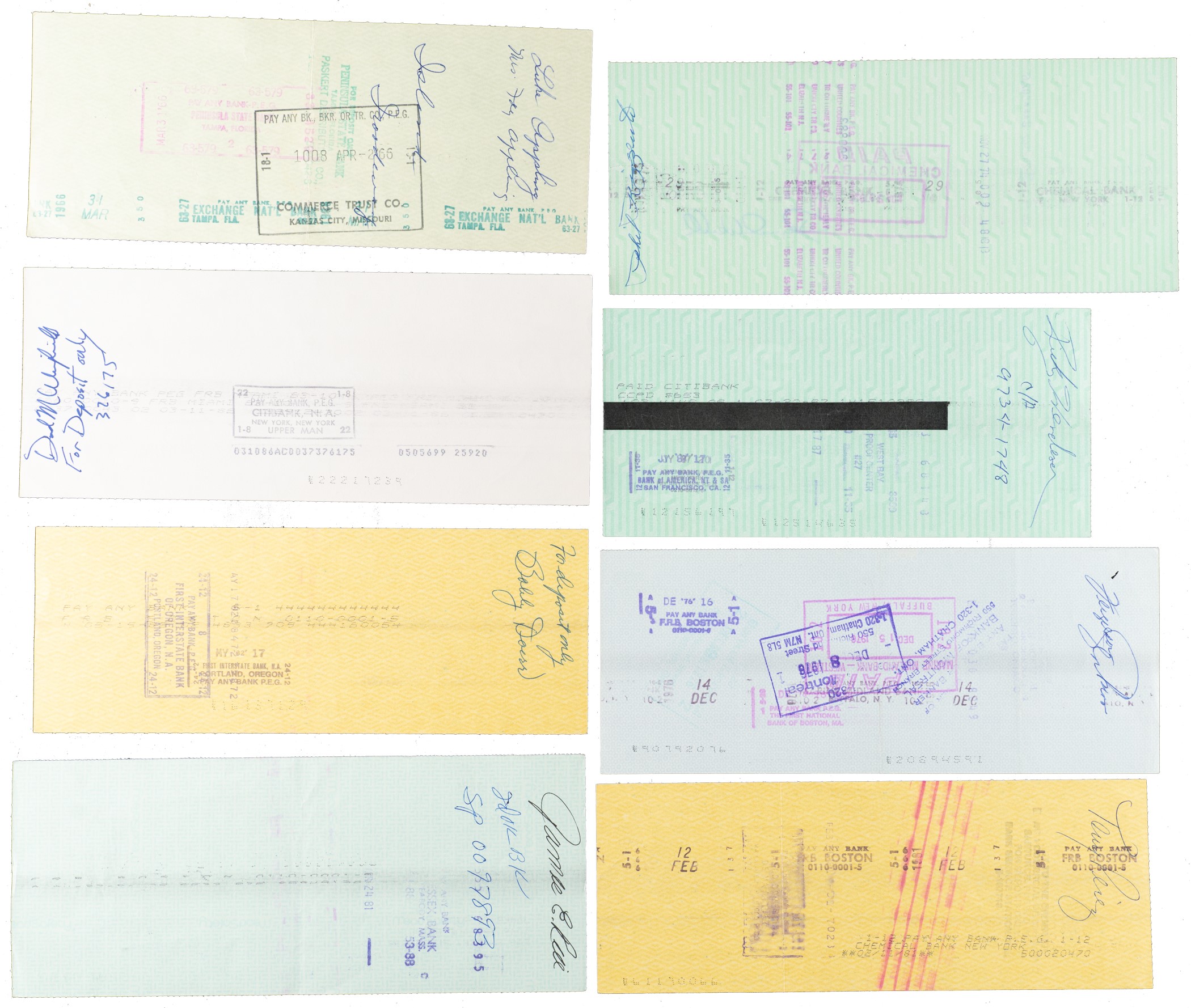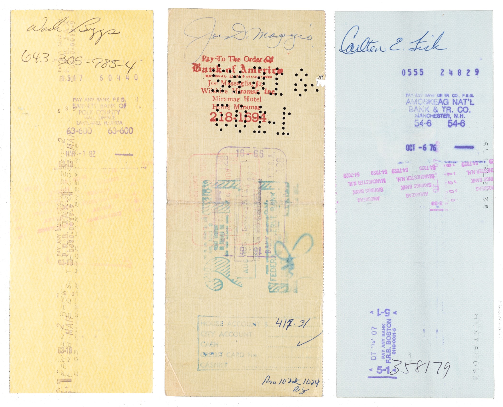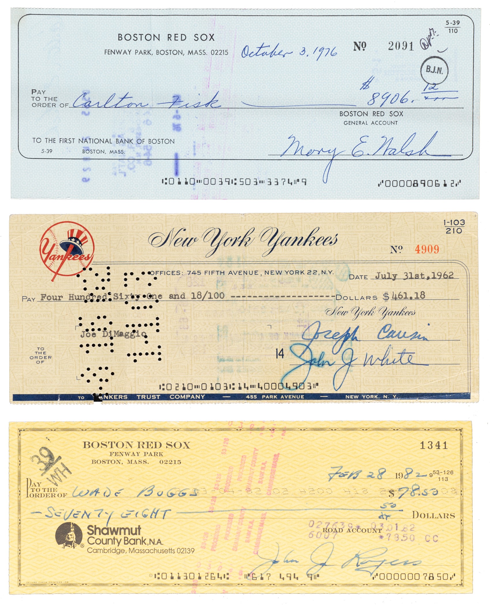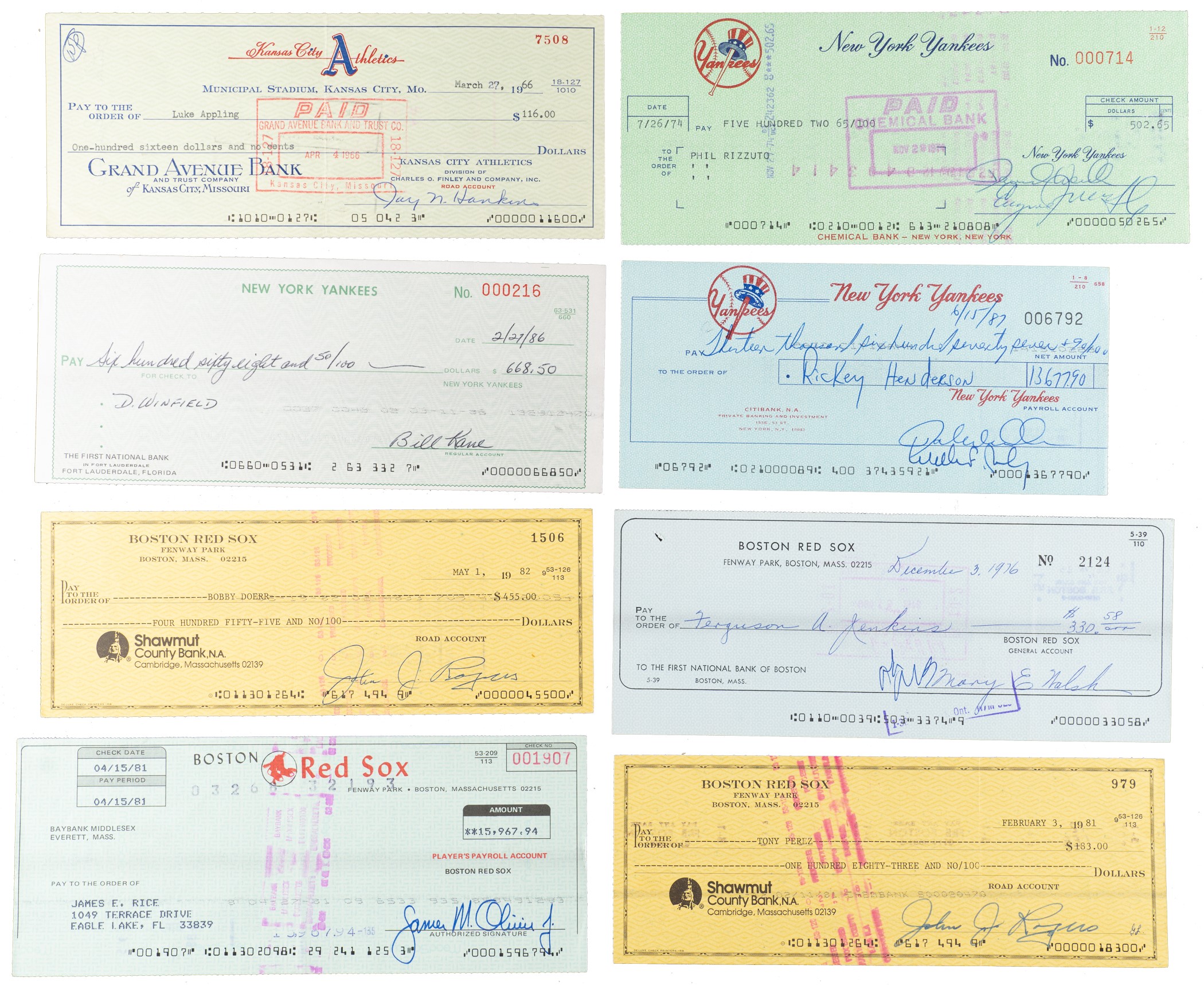 Collection of eleven payroll checks representing three different Major League teams (New York Yankees, Boston Red Sox, and Kansas City Athletics), each made payable and endorsed by a different Hall of Fame player and spanning the years 1962 through 1987. All of the signatures, scripted in a variety of inks, appear on the reverse and range in grade from "8" to "10," averaging "9." Unless otherwise noted, all of the checks display normal bank cancellation stamps. Vertical folds are the most common flaws, and the group is in Excellent condition overall. The players represented here are as follows: Luke Appling (3/27/66), Wade Boggs (2/28/82), Joe DiMaggio (7/31/62), Bobby Doerr (5/1/82), Carlton Fisk (10/3/76), Rickey Henderson (6/15/87), Fergie Jenkins (12/3/76), Tony Perez (2/3/81), Jim Rice (4/15/81), Phil Rizzuto (7/26/74), and Dave Winfield (2/27/86). Total: 11 checks. Reserve $200.