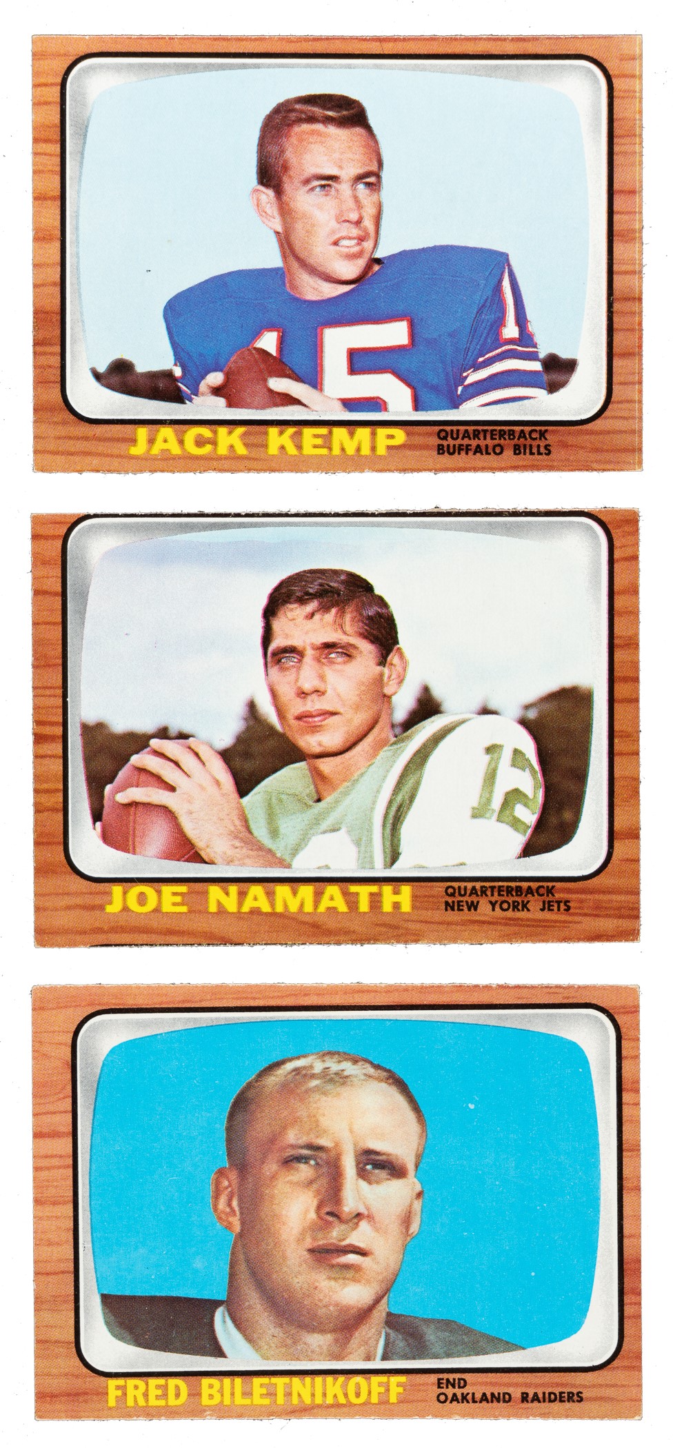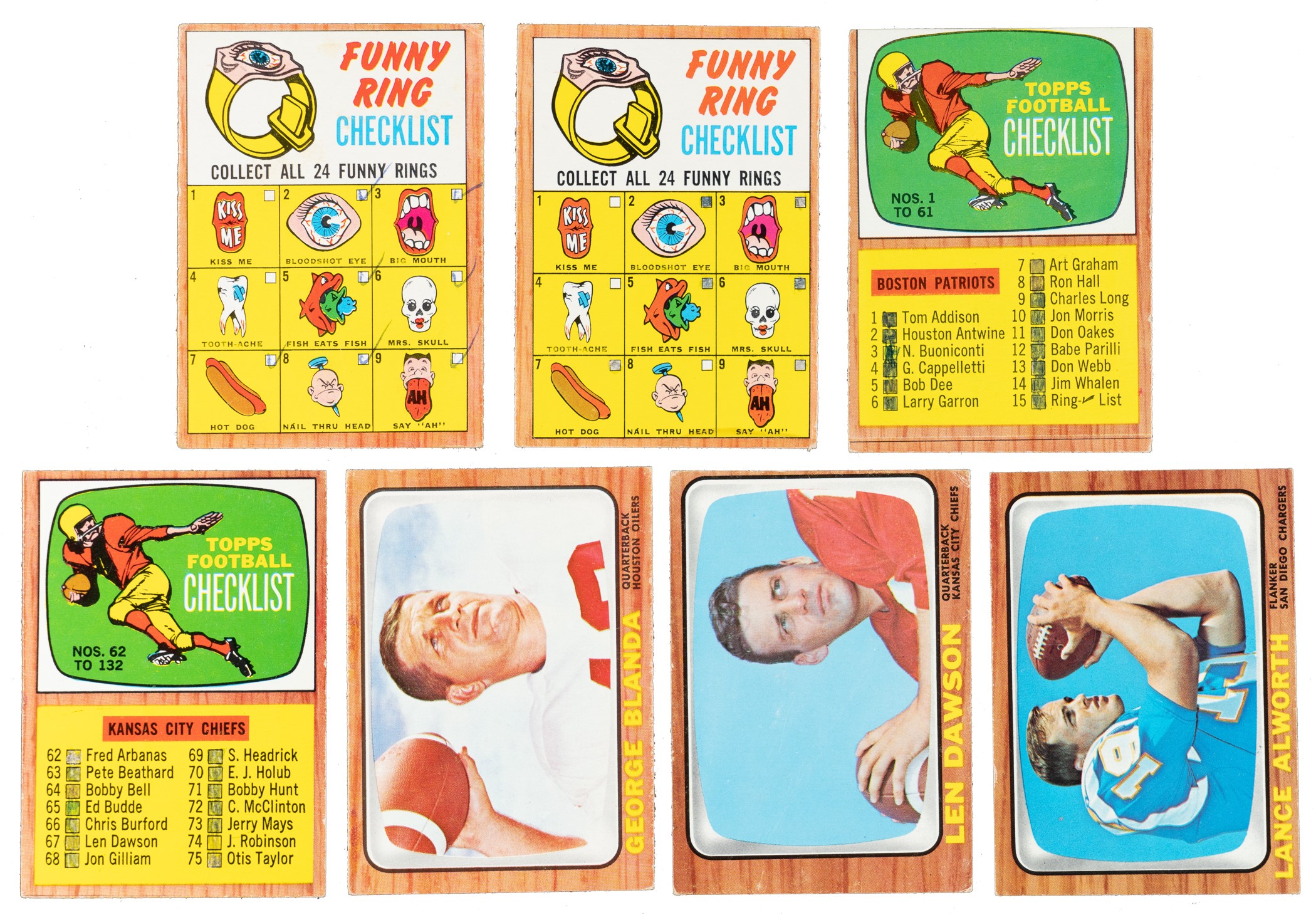 Complete 132-card set of 1966 Topps football highlighted by Hall of Famers Joe Namath, George Blanda, Fred Biletnikoff, and Len Dawson. Included is a duplicate example of #15 Funny Ring Checklist. The condition is 19% Ex-Mt to Nr/Mt (mostly Ex-Mt), 48% Vg-Ex to Ex, and 33% Gd to Vg (mostly due to moisture stains on the left borders and including a few lesser). Keys: Two #15 Funny Ring Checklist (both marked, otherwise Vg and Gd+), 26 Kemp (Nr/Mt), 48 Blanda (Ex), 61 Checklist (marked, otherwise Gd+), 67 Dawson (Vg), 96 Namath (0/100 T/B, otherwise Ex), 104 Biletnikoff (Vg-Ex), 119 Alworth (Ex-Mt), and 132 Checklist (marked, otherwise Vg-Ex). Very attractive complete Topps football set, including many Hall of Famers and stars of the era. Total: 133 cards (set of 132 plus a duplicate). Reserve $200.