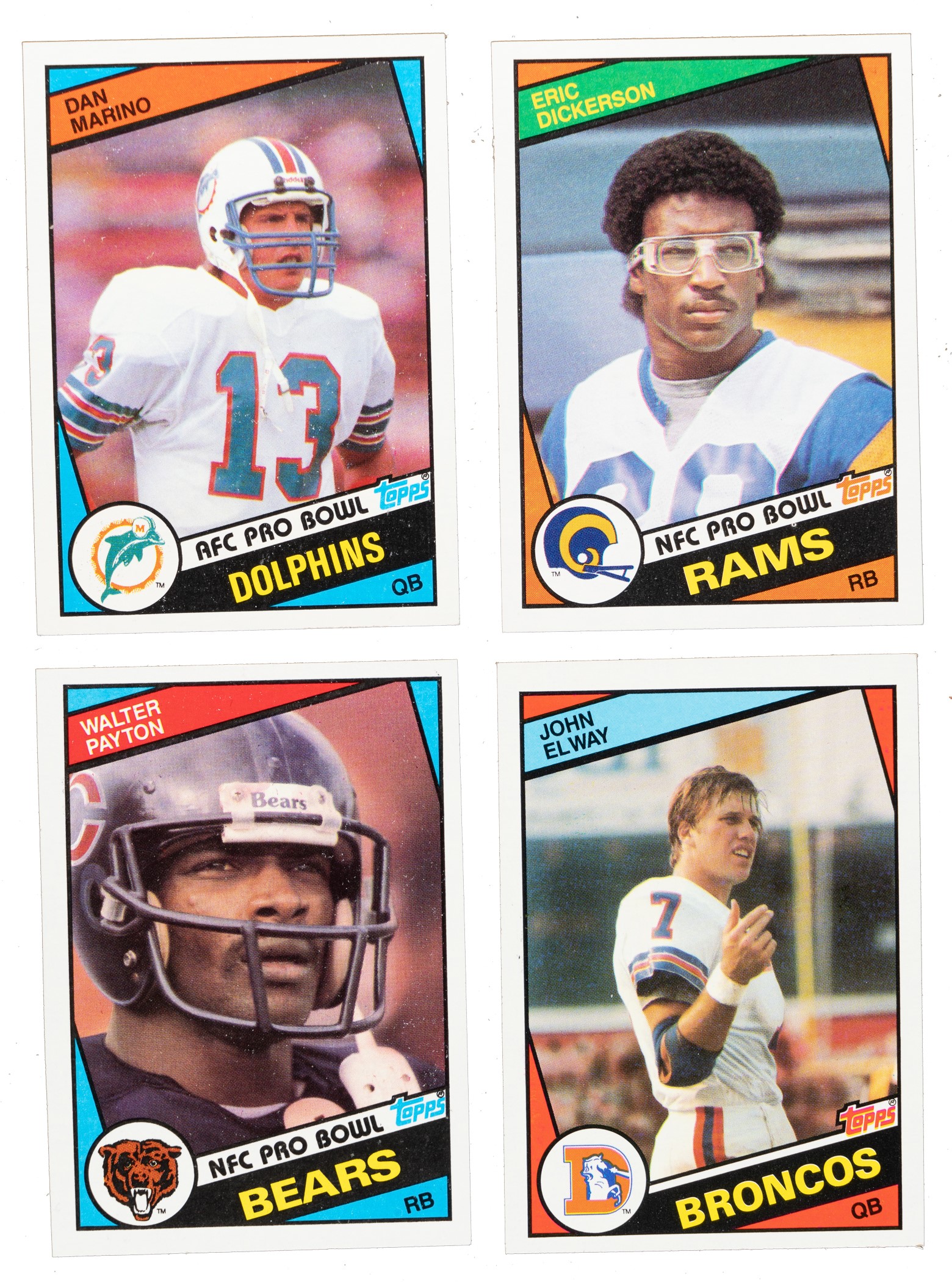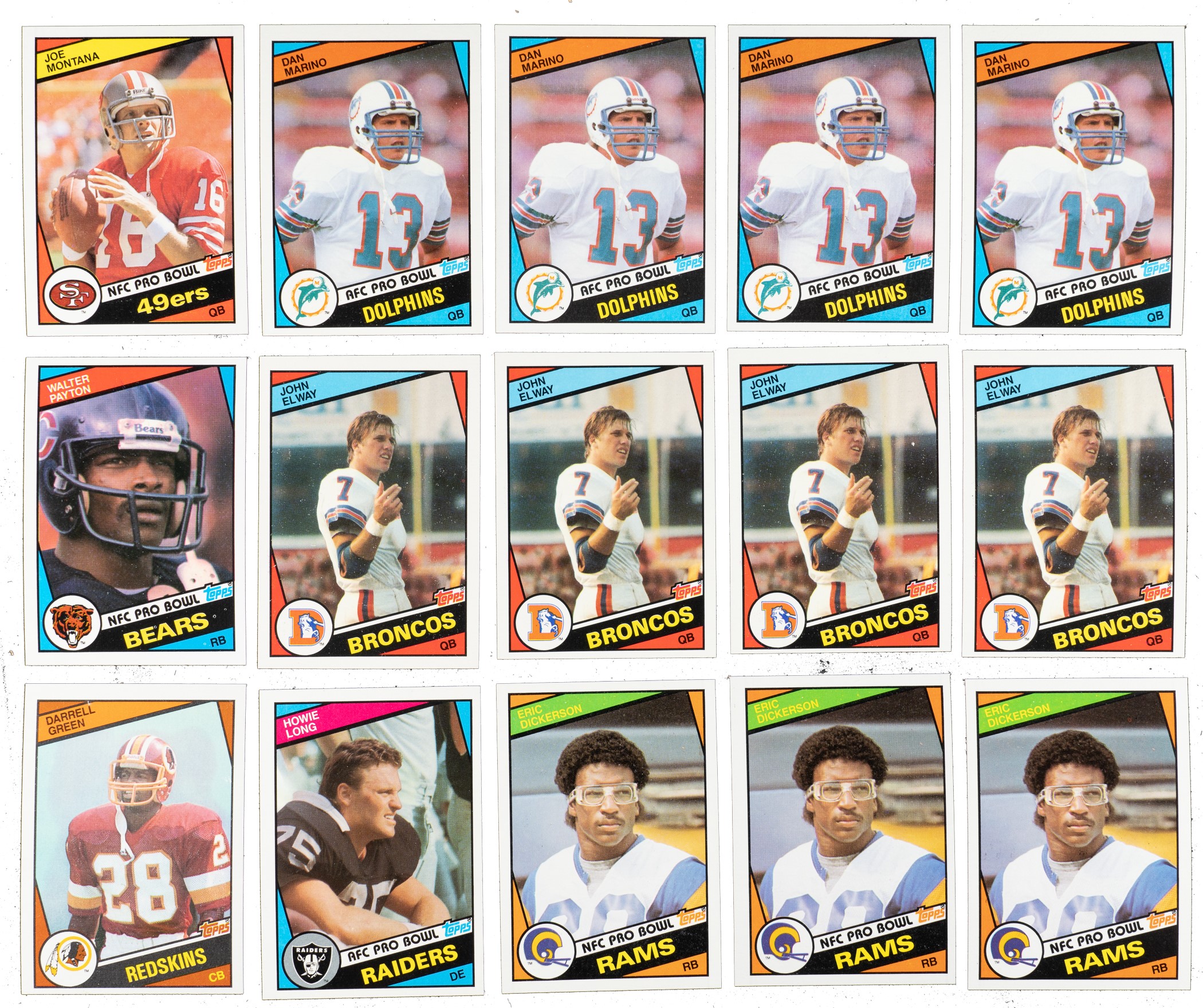Presented are fourteen mostly high-grade complete 396-card sets of 1984 Topps football. These stunning complete sets have bright colors, strong corners, and an overall pack-fresh quality. The 1984 Topps set includes an impressive twelve different rookie cards of Hall of Famers, highlighted by Dan Marino, John Elway, and Eric Dickerson. Condition is 35% Nr/Mt-Mt (including some Mint), 36% Nr/Mt, and 29% Ex to Ex-Mt (mostly due to centering and including 2% lesser). Keys: Fourteen #63 Elway RC (three Nr/Mt-Mt, four Nr/Mt, five Ex-Mt, and two Ex), fourteen 111 Long RC (two Nr/Mt-Mt, three Nr/Mt, nine Ex-Mt [due to centering], and Ex), fourteen 123 Marino RC (five Nr/Mt-Mt, five Nr/Mt, two Ex-Mt, Ex, and Vg+), fourteen 228 Payton (five Nr/Mt-Mt, eight Nr/Mt, and Ex-Mt), fourteen 280 Dickerson RC (six Nr/Mt-Mt and eight Nr/Mt), fourteen 358 Montana (two Nr/Mt-Mt, ten Nr/Mt, Ex-Mt, and Vg), and fourteen 380 Green RC (four Nr/Mt-Mt, three Nr/Mt, and seven Ex-Mt). This is a very attractive high-grade collection of complete sets of 1984 Topps Football cards, with many impressive highlights. Total: 14 complete sets, 5,544 cards. The size/weight of this item requires that there will be an additional shipping charge for this lot. Reserve $300.