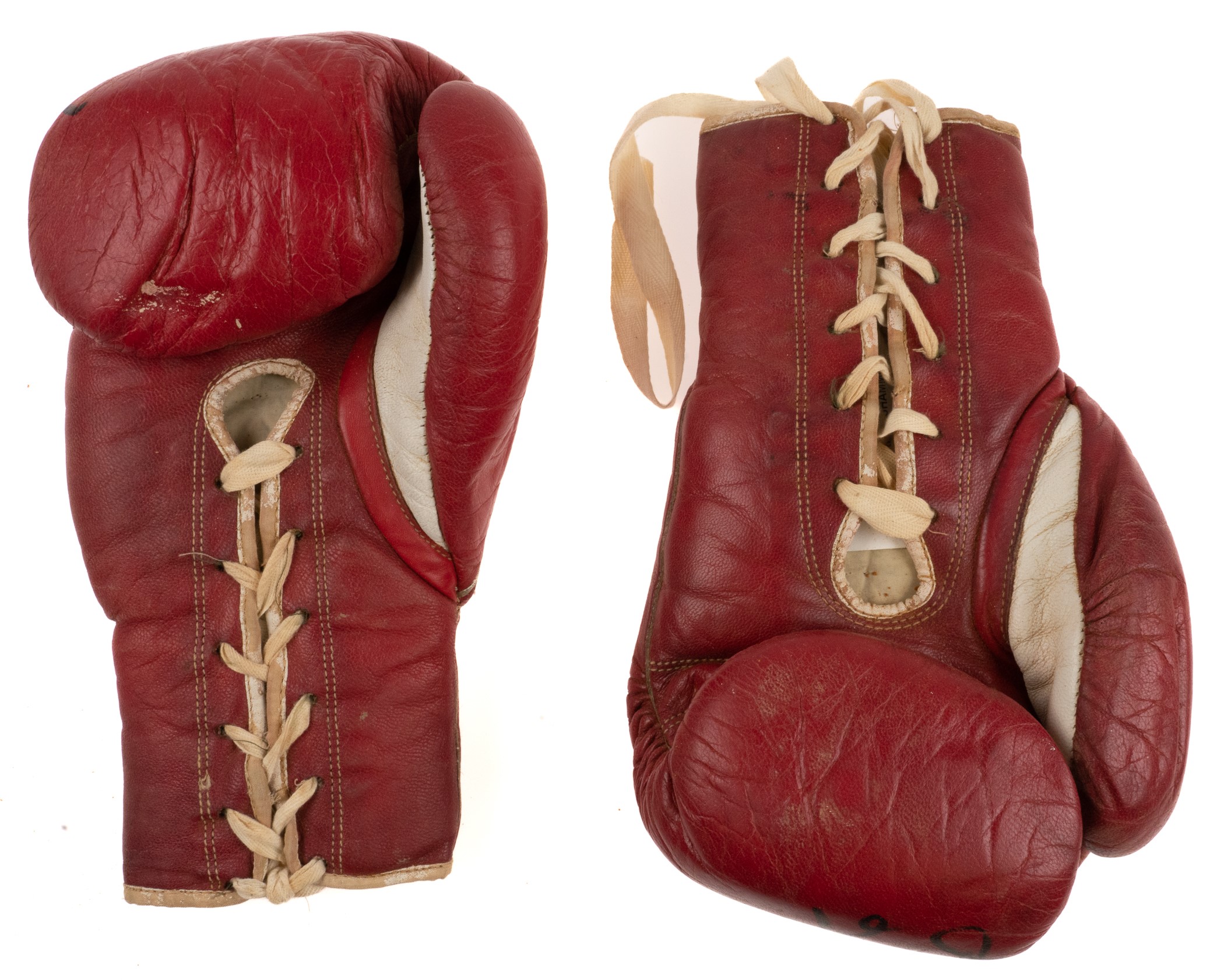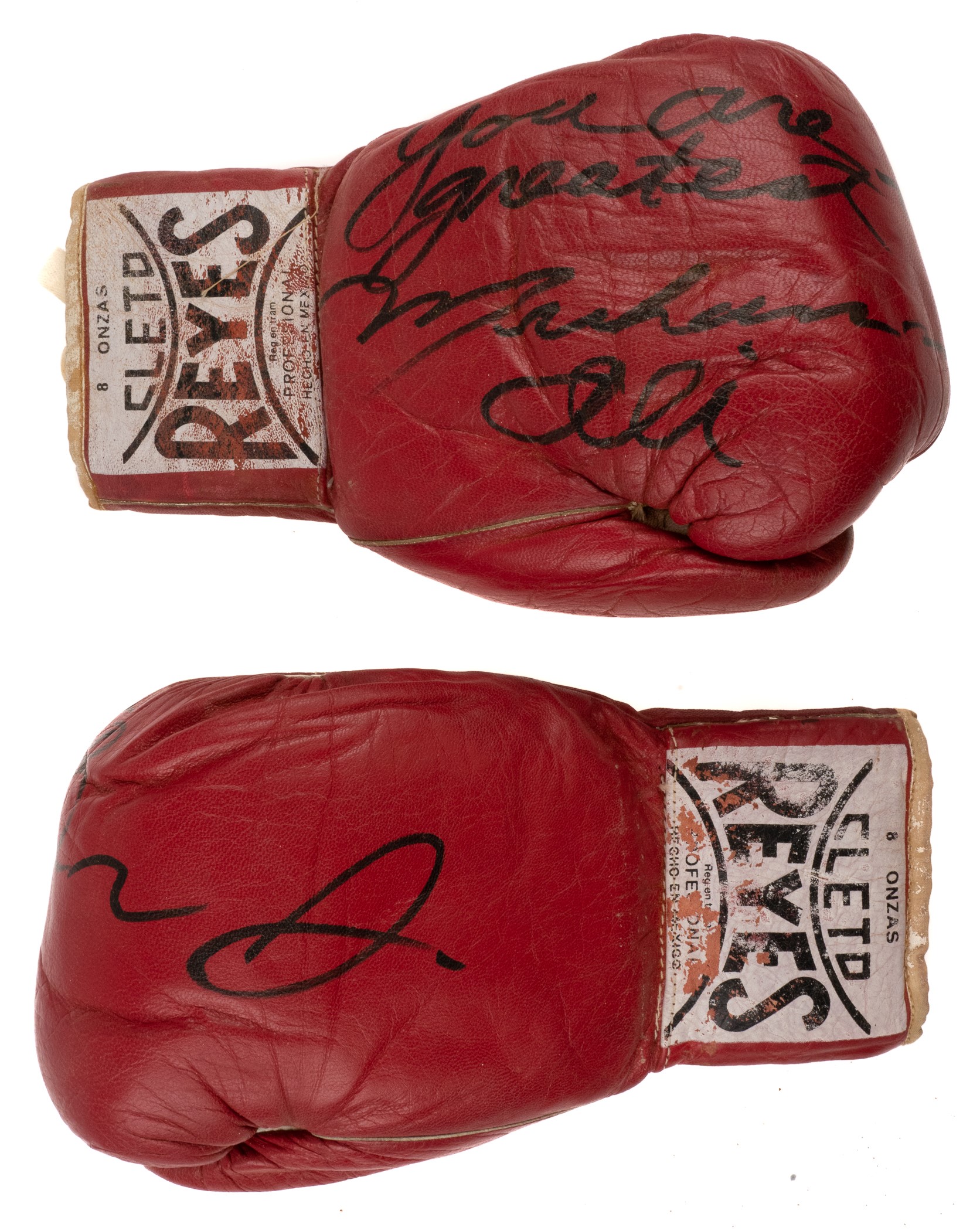 Presented is a pair of red Cleto Reyes boxing gloves worn by Muhammad Ali during training in the 1970s. What makes these gloves special is they were inscribed by Ali and presented to basketball icon Julius Erving. Penned in black sharpie, Ali has inscribed on the right glove, "To Dr. J." On the left glove, Ali has inscribed "You are the Greatest/Muhammad Ali." The signature grades "9." The gloves display light wear indicative of being used during training. This is a fantastic crossover piece featuring two of the greatest athletes of their respective sports. Please note that JSA has declined to issue a LOA on this item. Full LOA from Steve Grad and Brian Sobrero/Beckett Authentication Services. Reserve $2,500.