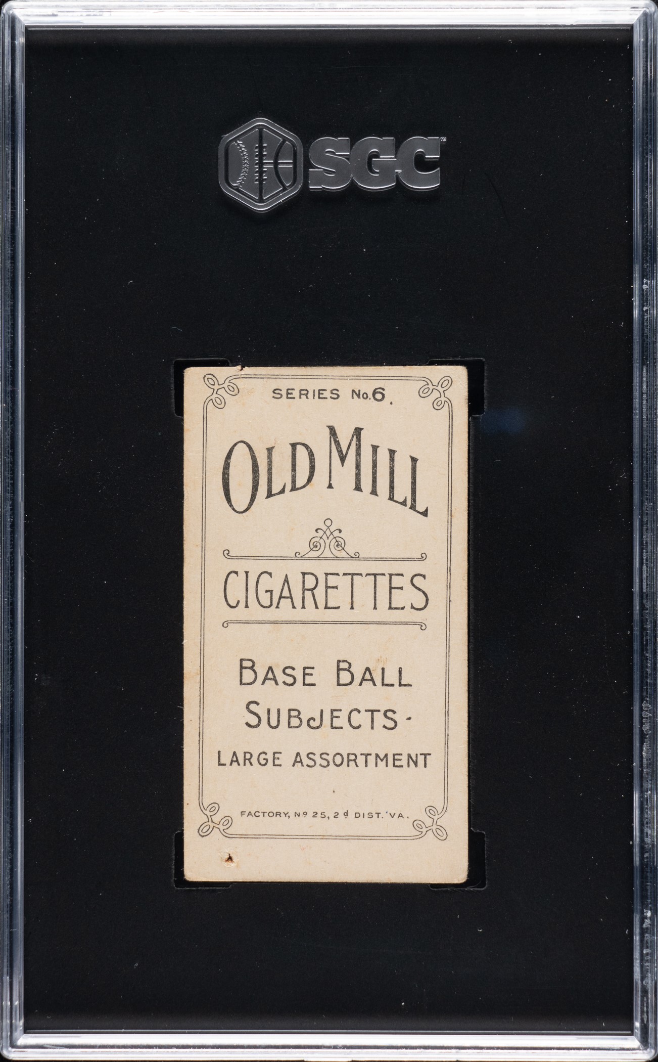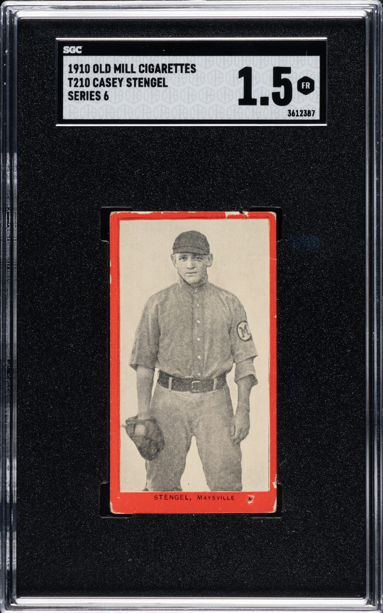Graded FAIR 1.5 by SGC (submitted by REA). Outstanding, newly discovered example of key T210 Red Border Casey Stengel. Stengel is featured as an outfielder with Maysville of the Blue Grass League at the very beginning of his professional baseball career. This is one of card collecting's most interesting and noteworthy tobacco-card rarities. Stengel (from Series 6) is one of the two key cards in the T210 Old Mill Tobacco card set (the other being Joe Jackson from Series 8). Like the T210 Joe Jackson, Stengel is an extremely rare card (both are far rarer than a T206 Wagner) with fewer than twenty examples known. To date, SGC has graded only nine examples: two EX 5, one VG 3, two GOOD 2, two FAIR 1.5, one POOR 1, and one Authentic. PSA has graded nine: one EX-MT 6, two VG-EX 4, two VG 3, one GOOD 2, and three PR 1. Jackson and Stengel, in addition to being the two most famous cards from the T210 series, each are among the rarest and most highly prized of all tobacco cards. The offered example is an extremely attractive card, far better than most T210 Old Mill cards (which with their bright-red borders are so susceptible to corner and edge wear). Bright and clean with even corner wear, a light crease on the top right, and minor chipping to the fragile red borders. Downgraded from Vg due to a pinhole on the bottom border. The reverse is bright and clean with strong, crisp printing of the advertisement for Old Mill Cigarettes centered to the top. This is a very attractive, newly discovered T210 Old Mill Tobacco example of Casey Stengel, one of the premier Hall of Fame rarities in all of 1910-era tobacco-card collecting. Reserve $1,000.