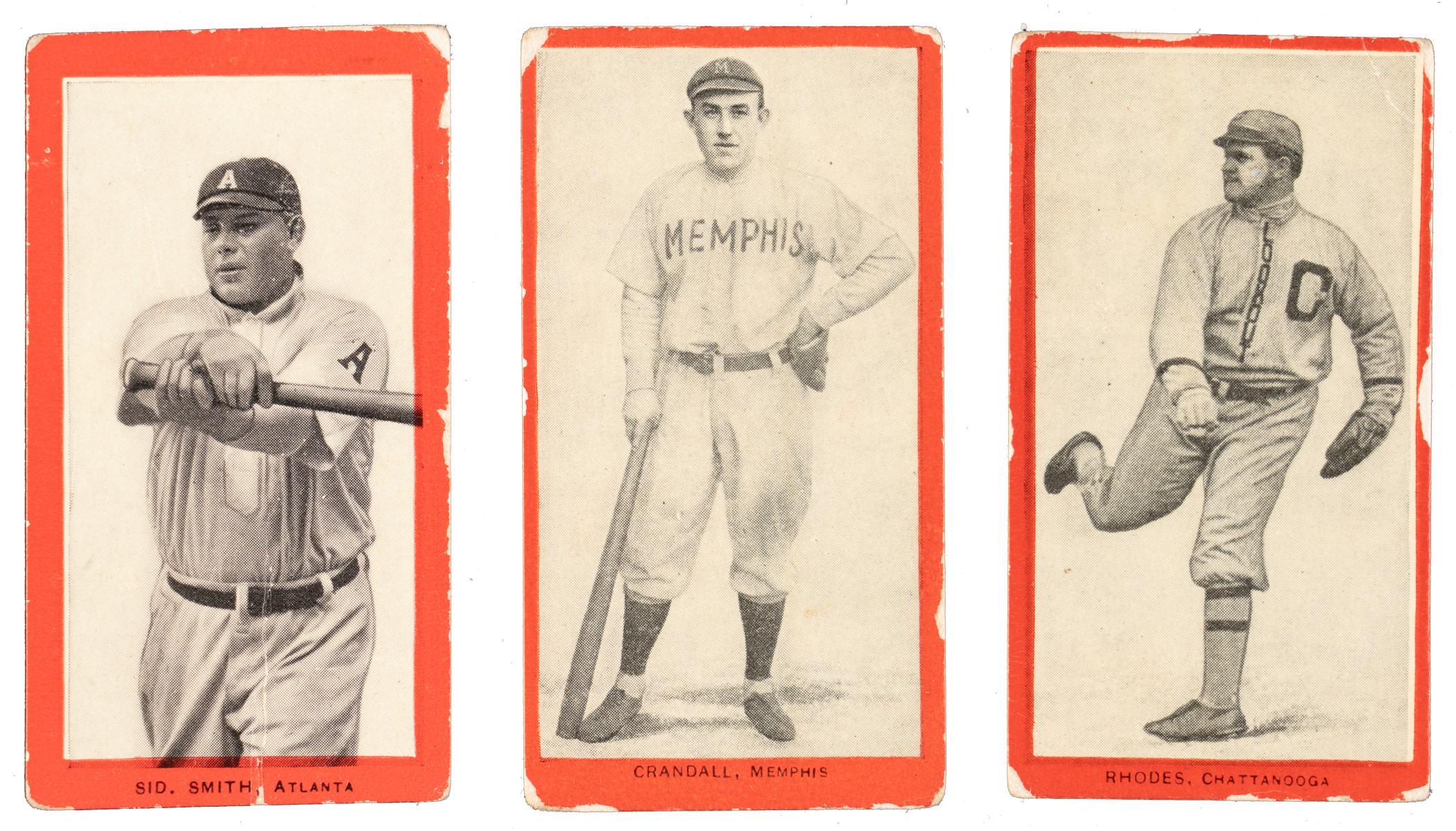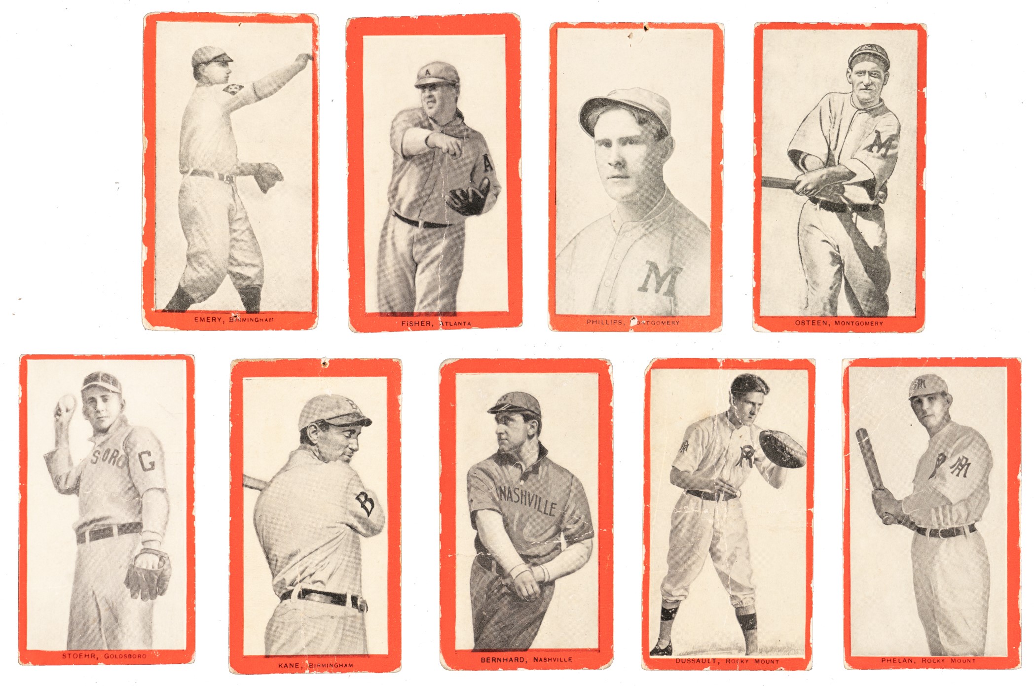 Collection of twelve different 1910 T210 Old Mill Tobacco cards. These cards are part of an exciting, fresh-to-the-hobby collection consigned to this auction by the family of the original owner. All of these cards are from the two rarest series of the set: Three cards are from "Series 7" and nine cards are from "Series 8." The T210 set is composed of eight different series, each representing a different minor league. The collection consists of the following: Series 7 (Eastern Carolina League): Dussault (Pr), Phelan (Fr), and Stoehr (Fr). Series 8 (Southern Association): Bernhard (Fr), Crandall (Vg), Emery (Pr, with two pinholes), Fisher (Gd), Kane (Pr, with pinhole), Osteen (Fr), Phillips (Pr, with two pinholes), Rhodes (Gd), and S. Smith (Gd+, Atlanta). While not large in number, this group remains extremely desirable for collectors attempting to complete the elusive "Series 7" and "Series 8" subsets of the T210 Red Border set. Total: 12 cards. Reserve $300.