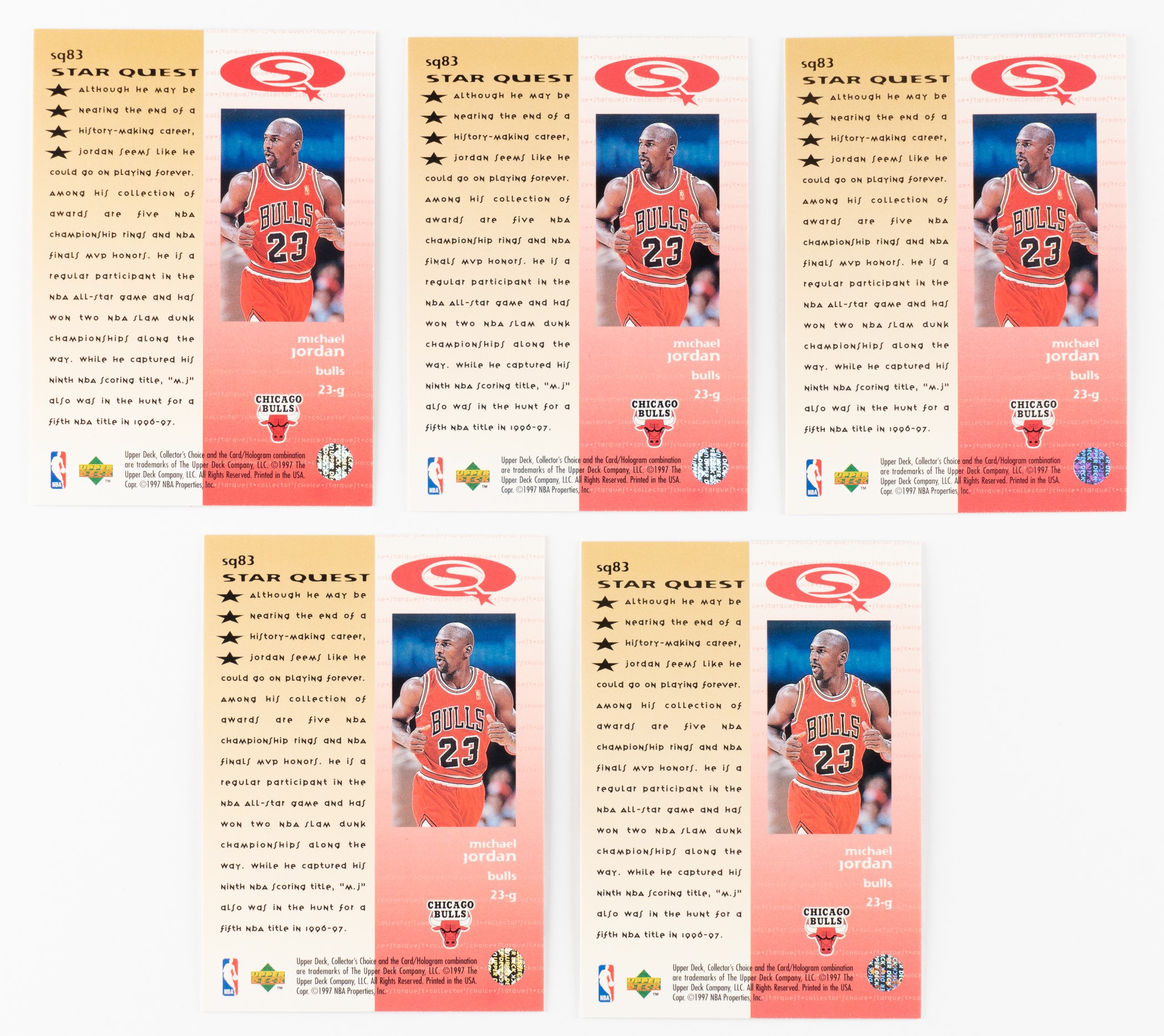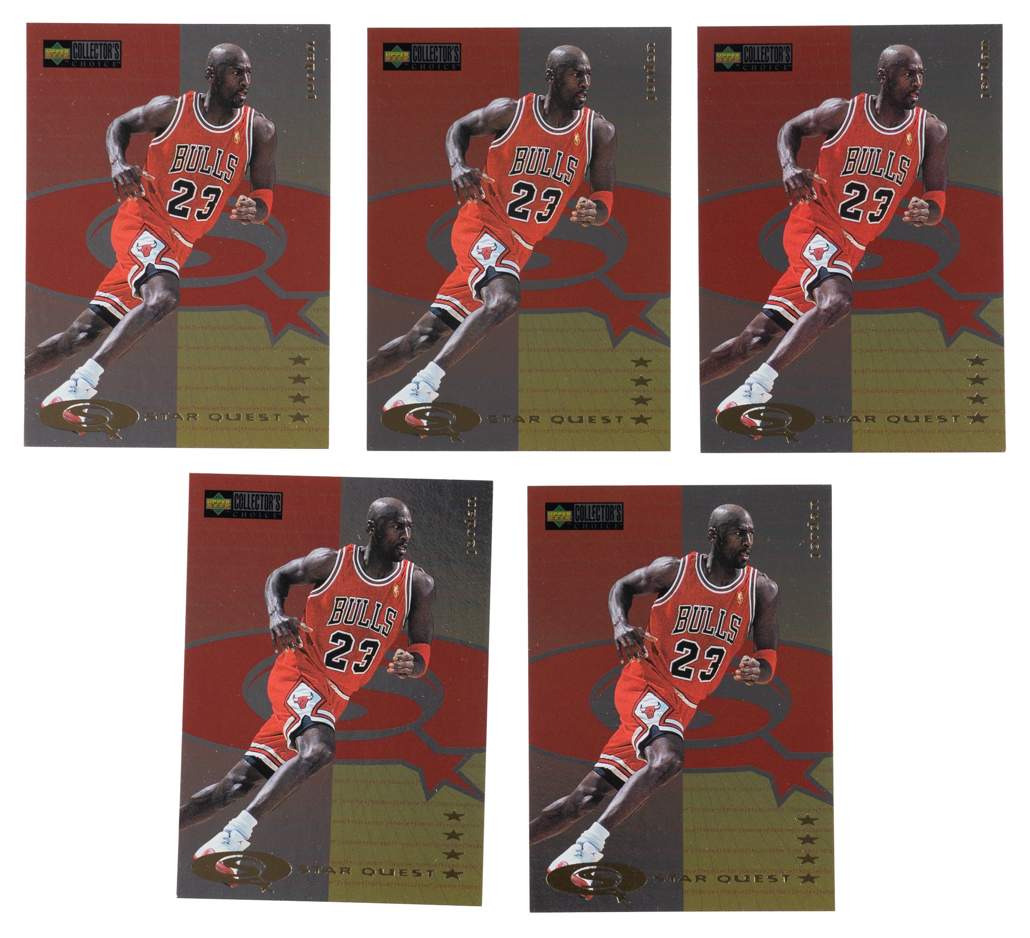 Presented is a 1997-1998 Upper Deck Collector's Choice Basketball Starquest Gold 4-Star complete subset collection. This collection consists of five 1997-1998 Upper Deck Collector's Choice Starquest Gold 4-Star complete subsets (#SQ81-SQ90), including Michael Jordan, Kevin Garnett, and Shaquille O'Neal. Condition ranges from Nr/Mt to Mint, averaging Nr/Mt-Mt. The condition of the five #SQ83 Michael Jordan cards is two Mint, two Nr/Mt-Mt+, and Nr/Mt. Total: 50 cards. Reserve $10.