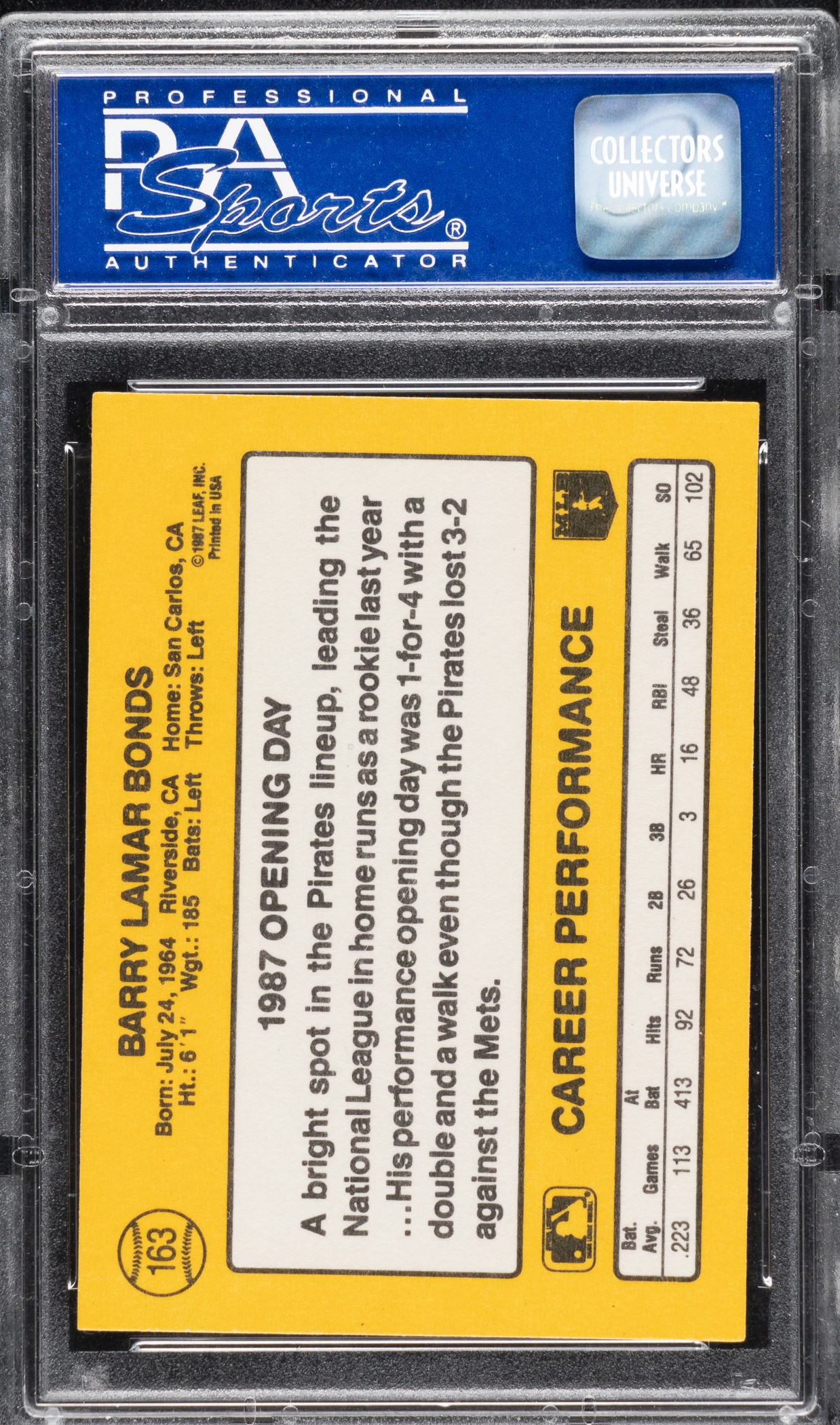 1987 Donruss Opening Day #163 Barry Bonds Rookie PSA NM-MT 8 - Johnny Ray Error!