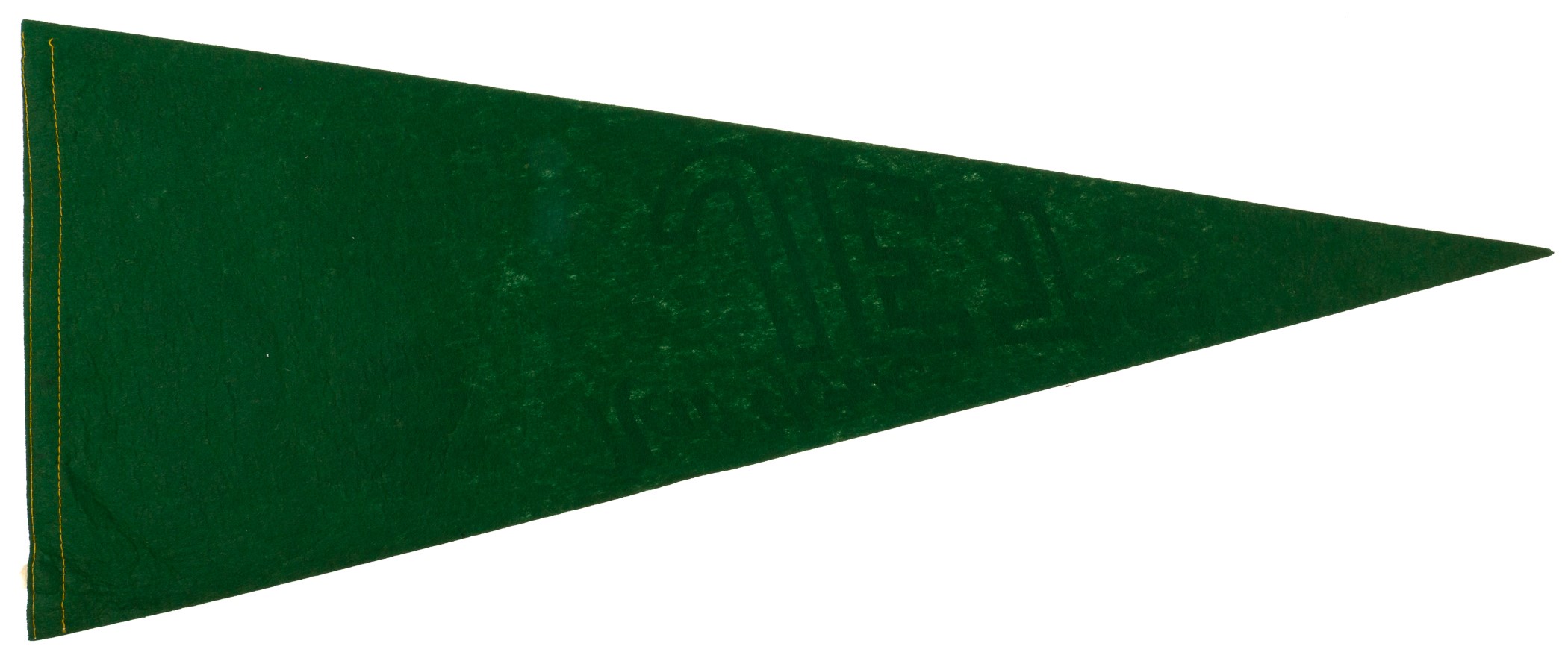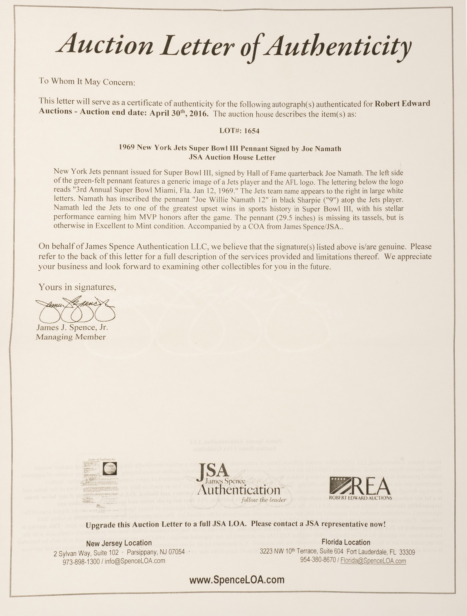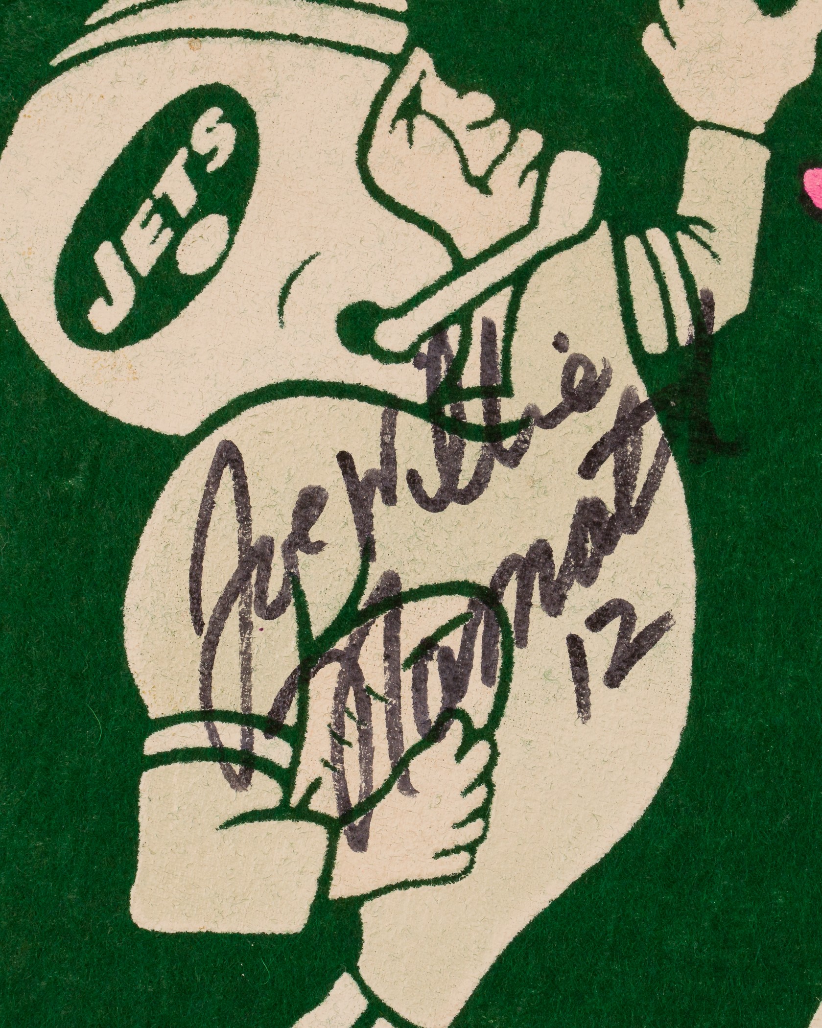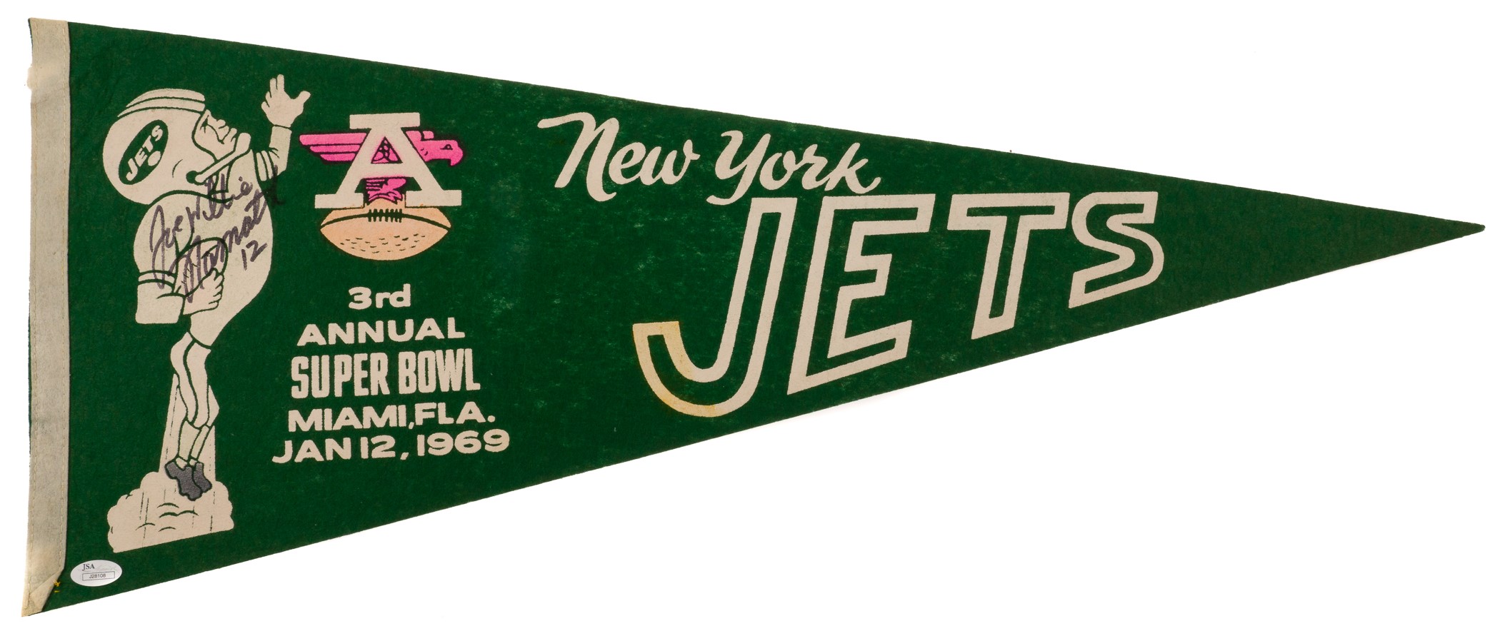 New York Jets pennant issued for Super Bowl III, signed by Hall of Fame quarterback Joe Namath. The left side of the green-felt pennant features a generic image of a Jets player and the AFL logo. The lettering below the logo reads "3rd Annual Super Bowl Miami, Fla. Jan 12, 1969." The Jets team name appears to the right in large white letters. Namath has inscribed the pennant "Joe Willie Namath 12" in black Sharpie ("9") atop the Jets player. Namath led the Jets to one of the greatest upset wins in sports history in Super Bowl III, with his stellar performance earning him MVP honors after the game. The pennant (29.5 inches) is missing its tassels, but is otherwise in Excellent to Mint condition. Accompanied by a COA from James Spence/JSA. Reserve $200. Estimate (open).
