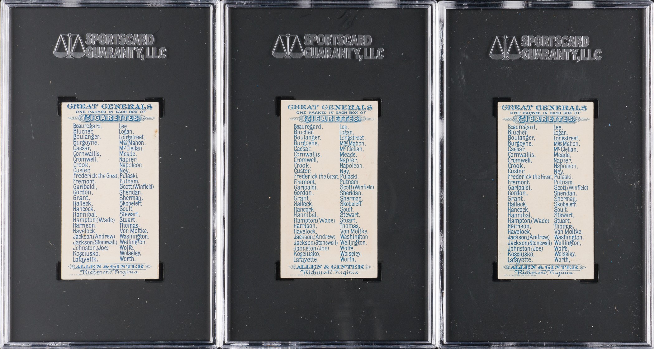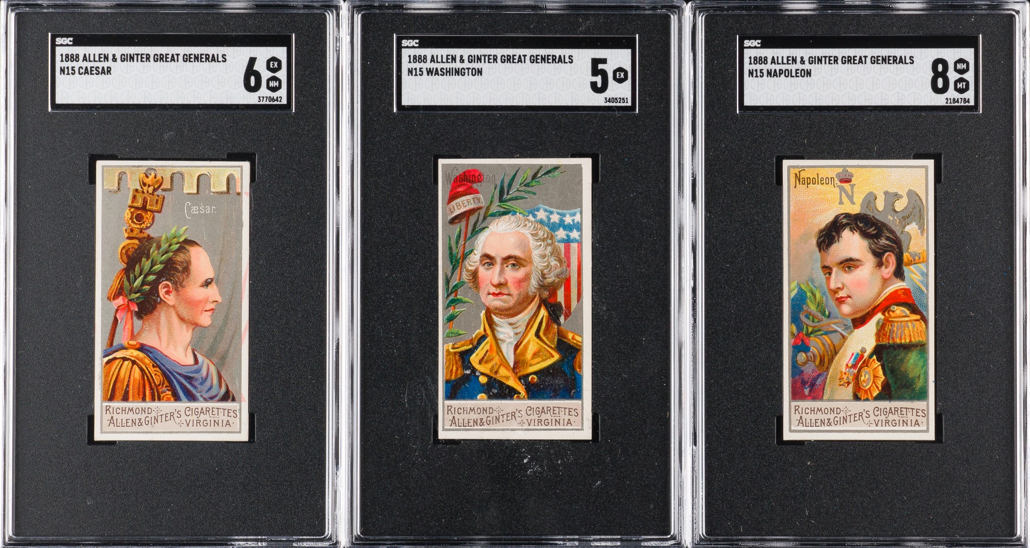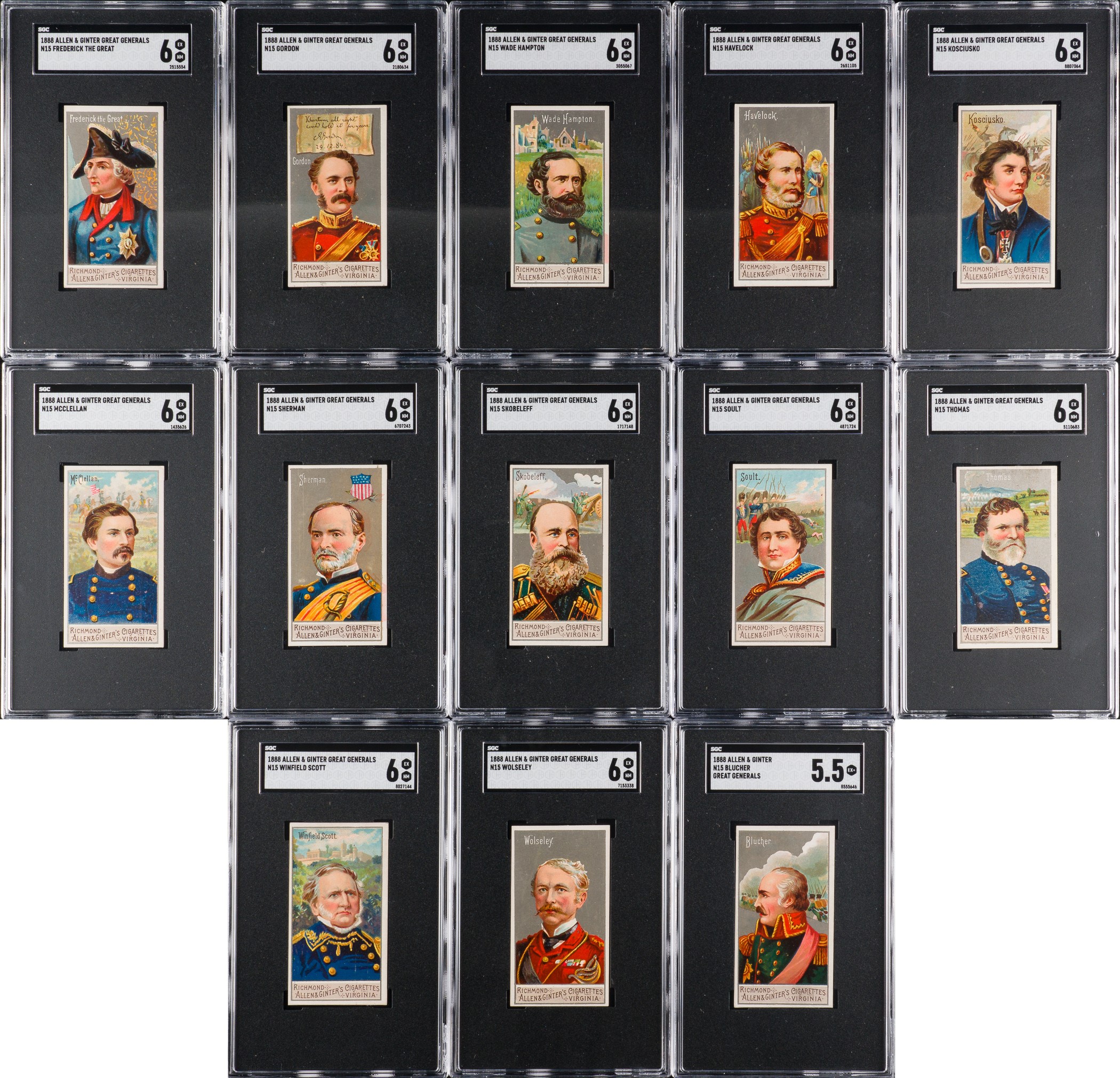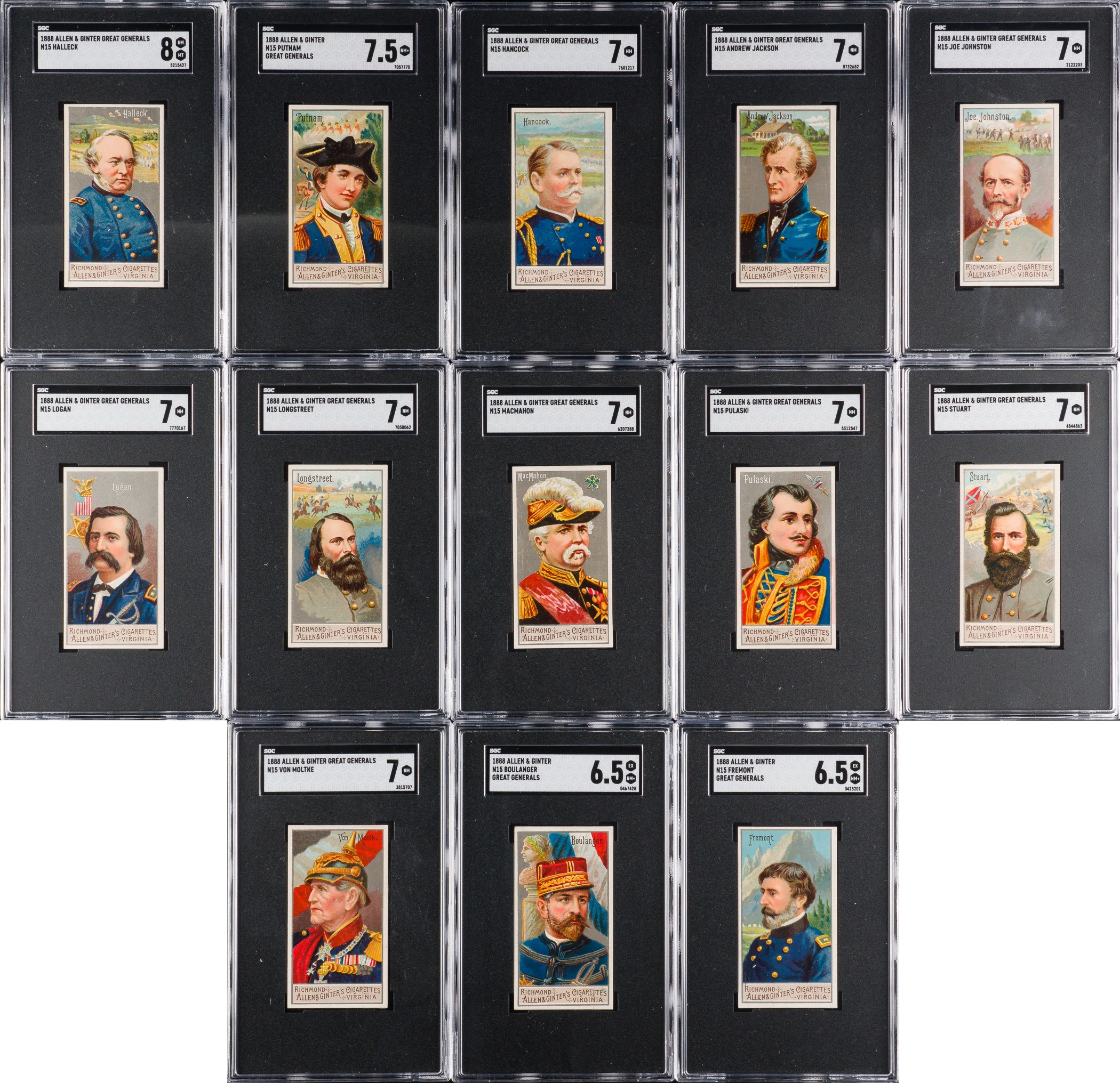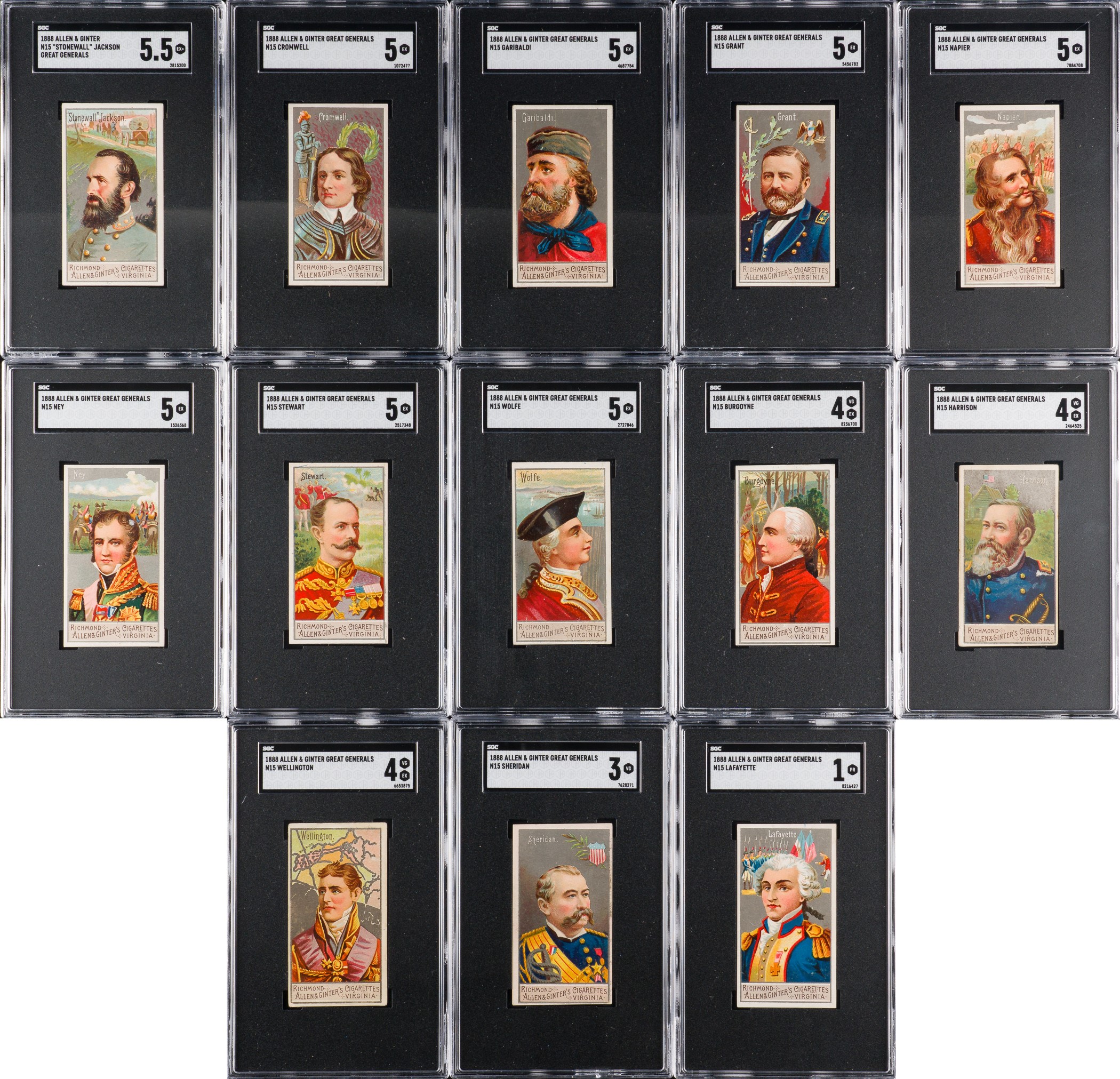 Presented is a near-complete set of forty-two different (out of fifty) 1888 N15 Allen & Ginter "Great Generals” cards, all graded and encapsulated by SGC (submitted by REA). Missing only Beauregard, Cornwallis, Crook, Custer, Hannibal, Lee, Meade, and Worth for completion. This is a very strong near-set of these extremely striking nineteenth-century tobacco cards, with twelve cards ranging from Nr/Mt to Nr/Mt-Mt, twenty-five ranging from Ex to Ex-Mt+, four ranging from Vg to Vg-Ex, and one grading lesser (Pr). In the following condition composite, cards are identified by the numbers provided by the American Tobacco Cards Price Guide checklist. SGC Grading Composite: NM/MT 8 (2 cards): #15 and 33 Napoleon. NM+ 7.5 (1 card): #36. NM 7 (9 cards): #16, 21, 23, 27, 28, 29, 35, 43, and 45. EX/NM+ 6.5 (2 cards): #3 and 11. EX/NM 6 (13 cards): #5 Caesar, 10, 13, 18, 20, 24, 30, 37, 39, 40, 41, 44, and 49. EX+ 5.5 (2 cards): #2 and 22. EX 5 (8 cards): #7, 12, 14 Grant, 32, 34, 42, 46 Washington, and 48. VG/EX 4 (3 cards): #4, 19, and 47. VG 3 (1 card): #28. POOR 1 (1 card): #25 Lafayette. Issued with Allen & Ginter's Cigarettes, the set is entitled "Great Generals," and as the set title implies, these cards feature great generals from all walks of life. Each insert card measures 2.75 x 1.5 inches and features a portrait image of a historical figure (such as George Washington, U.S. Grant, Robert E. Lee, Napoleon Bonaparte, Julius Caesar, etc.) on the front with a checklist presented on the reverse. This is an extremely attractive near-complete set with outstanding eye-appeal. Allen & Ginter's "Great Generals" are rarely offered as a complete set (in fact we have sold only one complete set in the last eighteen years), and are highly prized by historical collectors and nineteenth-century nonsport tobacco-card collectors. Total: 42 cards. Reserve $1,000. Estimate (open).