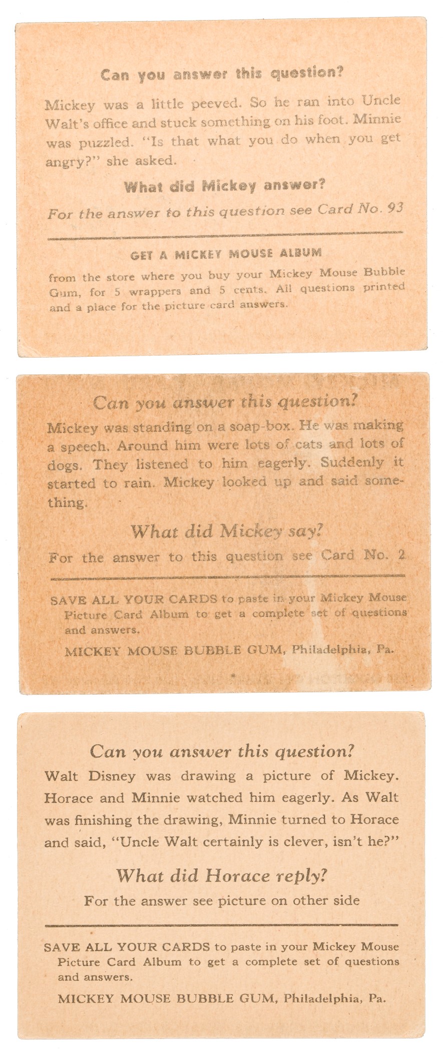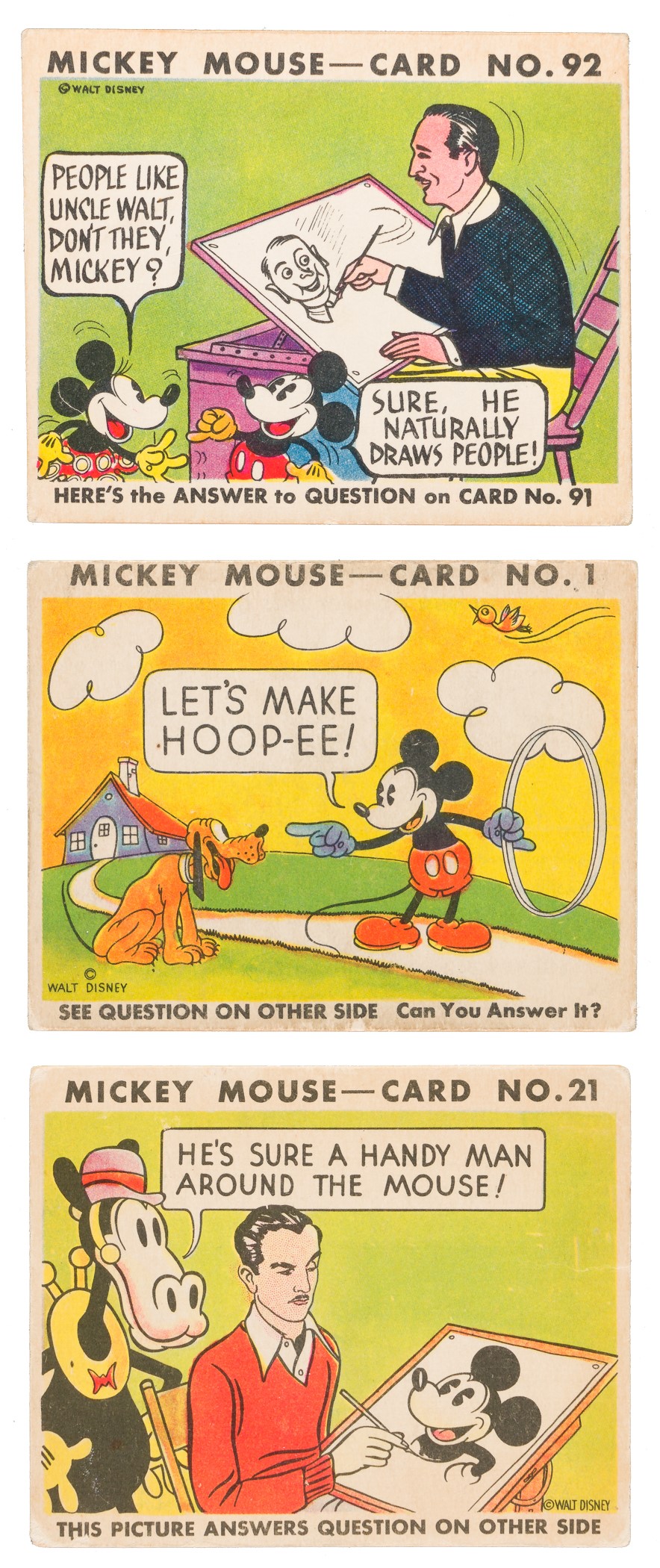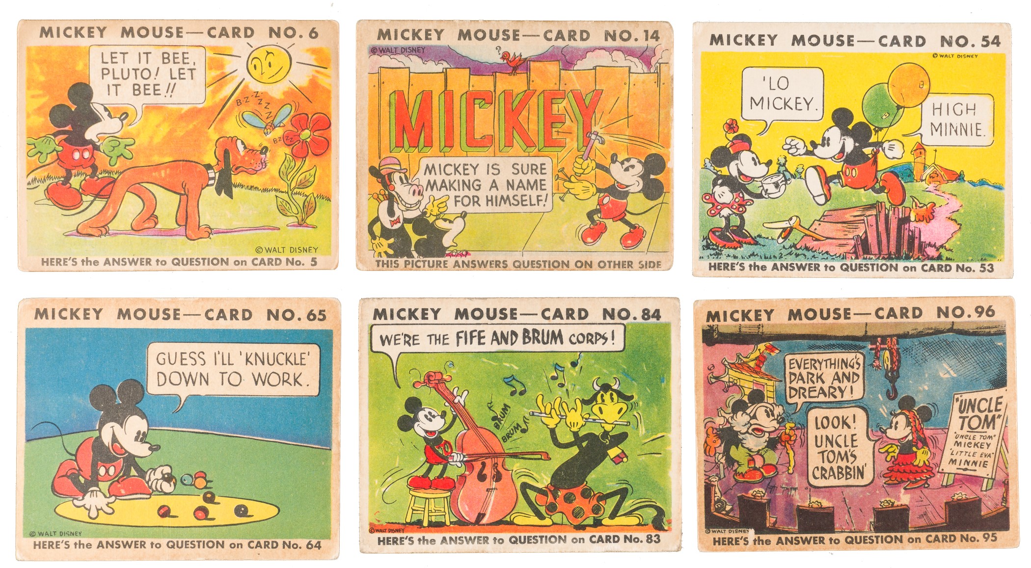 Complete 96-card set of the classic 1935 R89 "Mickey Mouse" Bubble Gum cards issued by Gum., Inc. Condition is 23% Vg-Ex to Ex, 45% Gd to Vg, and 36% lower (including a couple with a slight trim, one with color added, and a few which measure small). Keys: #1 "Let's Make Hoop-ee" (measures a bit small, otherwise Vg), 21 "He's Sure a Handy..." w/ Walt Disney (Gd), and 92 "People Like Uncle Walt..." w/ Walt Disney (slightly tilted miscut, otherwise Vg-Ex). Mickey Mouse Bubble Gum cards are considered by many to be the single most classic 1930s nonsport bubble-gum card set. The brilliant colors, high-quality artwork, and popular subject matter have always made this set a favorite with collectors. It is also worth noting that cards from this set are much scarcer than most collectors realize, and far more difficult to find than most baseball cards of the era (such as Goudeys, National Chicles, Play Balls, etc.). This is a very presentable medium- to lower-grade complete set of one of the most popular of all 1930s gum card sets, with tremendous crossover appeal to both card collectors and Mickey Mouse collectors. Total: 96 cards. Reserve $500. Estimate (open).