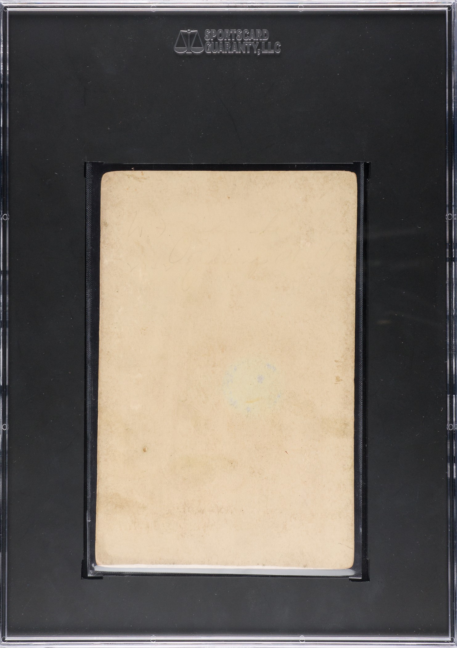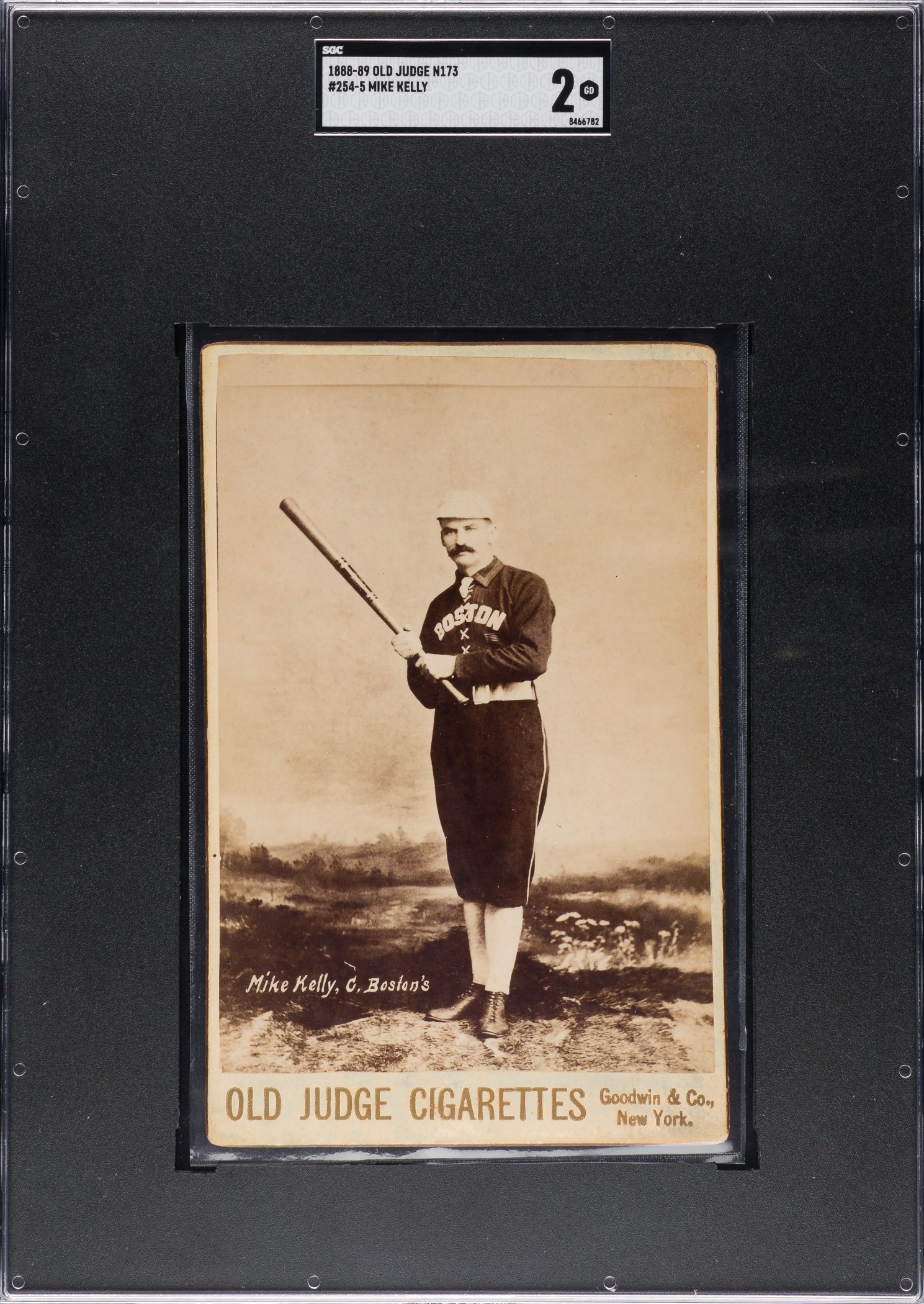 Graded GOOD 2 by SGC (submitted by REA). Extremely striking N173 Goodwin Old Judge cabinet card of Hall of Famer Mike "King" Kelly with Boston (batting pose #254-5). This is an ideal example of one of the all-time classic nineteenth-century cabinet cards and one of the most impressive of all "King" Kelly cards. All Old Judge cabinets are extremely desirable, as are all examples of Hall of Famers, and Mike "King" Kelly is one of the most prominent of all nineteenth-century Hall of Famers. He was also nicknamed "$10,000 Kelly" after Chicago sold his contract for that amount to Boston following the 1886 season. At the time, $10,000 was an unheard-of sum for a player, but Kelly was so great and such a popular draw with fans that he was worth it. This is a stunning card! The image on this card is very bold. Spectacular contrast (far superior to what is normally found on this card). Light soiling and pencil writing on the reverse of the card are responsible for the modest grade. Reserve $1,000. Estimate (open).