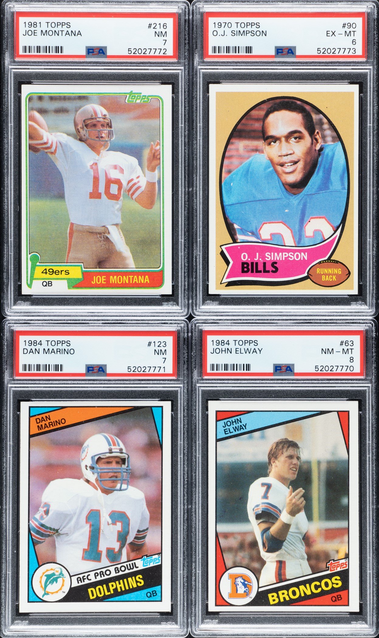 5) 1974 Topps Complete Set (528): Condition is 24% Nr/Mt to Nr/Mt-Mt (including a few Mint), 50% Ex to Ex-Mt (mostly due to centering), and 26% Vg to Vg-Ex (mostly due to centering). Keys: #1 Simpson (10/90 L/R, otherwise Ex+), 105 Rashad RC (5/95 L/R, otherwise Nr/Mt-Mt), 121 Carmichael RC (Ex due to centering), 150 Unitas (20/80 L/R, otherwise Nr/Mt-Mt), 219 Guy RC (Ex+ due to centering), 220 Harris (20/80 L/R, otherwise Nr/Mt-Mt), 383 Hannah RC (20/80 L/R, otherwise Nr/Mt-Mt), 470 Bradshaw (Vg+ due to centering) and 500 Staubach (Vg-Ex due to centering).