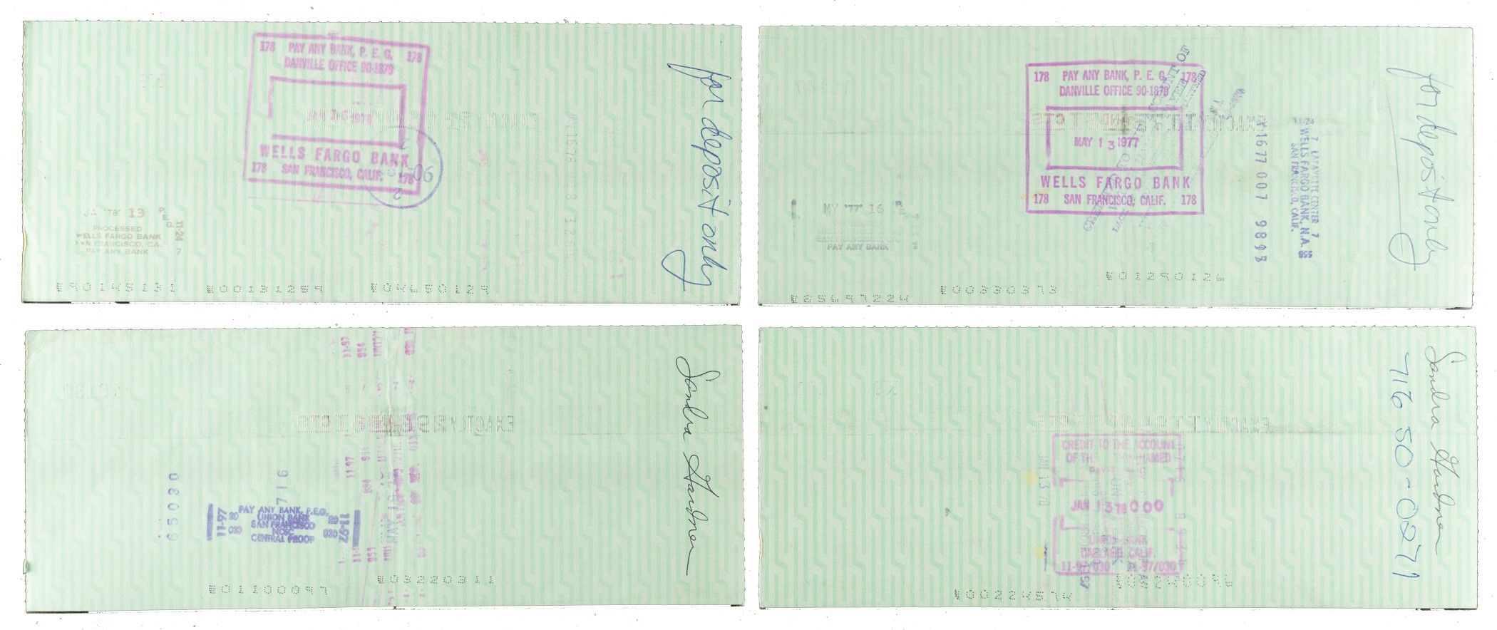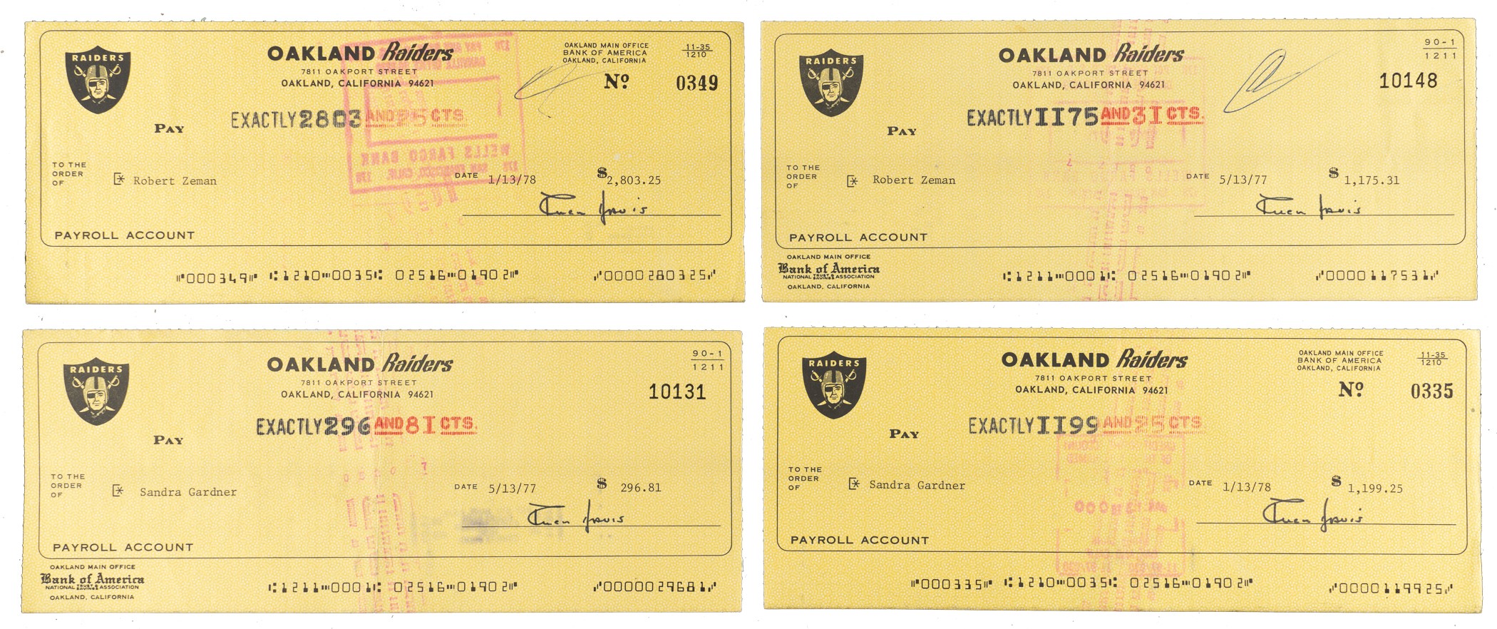 Collection of four Oakland Raiders payroll checks signed by longtime owner Al Davis between the years 1977 and 1978. A three-time Super Bowl champion, Davis is best remembered today for his motto "Just win, baby." The signatures, scripted in black ink, average "9/10." The check dates are as follows: 1977 (2): both dated from May 13; 1978 (2): both dated from January 13th. The checks (8.5 x 3.5 inches) all display normal bank cancellation stamps and a vertical fold line down the middle. Each check has some light creasing, but are in otherwise Excellent condition overall. Total: 4 checks. Auction LOA from James Spence/JSA. Reserve $200.