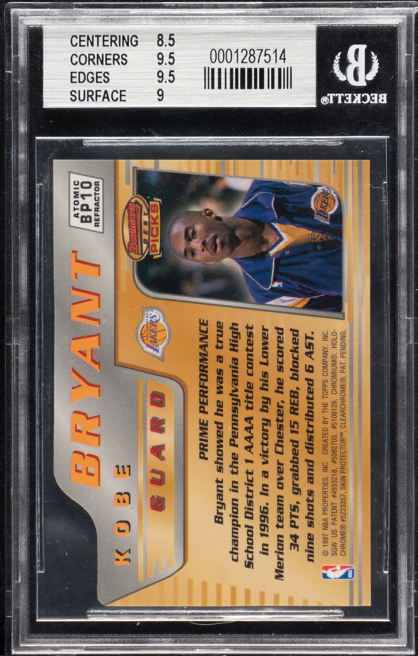 1996-1997 Bowman's Best Picks Basketball #BP10 Kobe Bryant Rookie Atomic Refractor BGS MINT 9