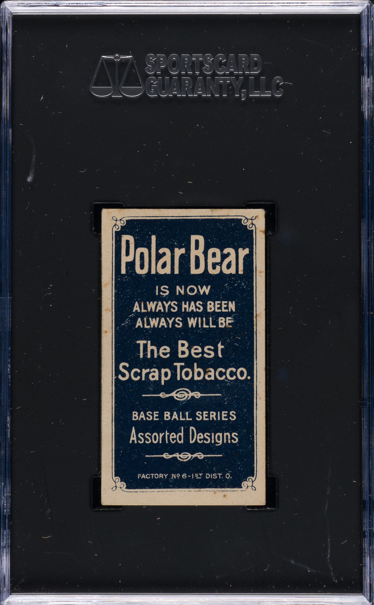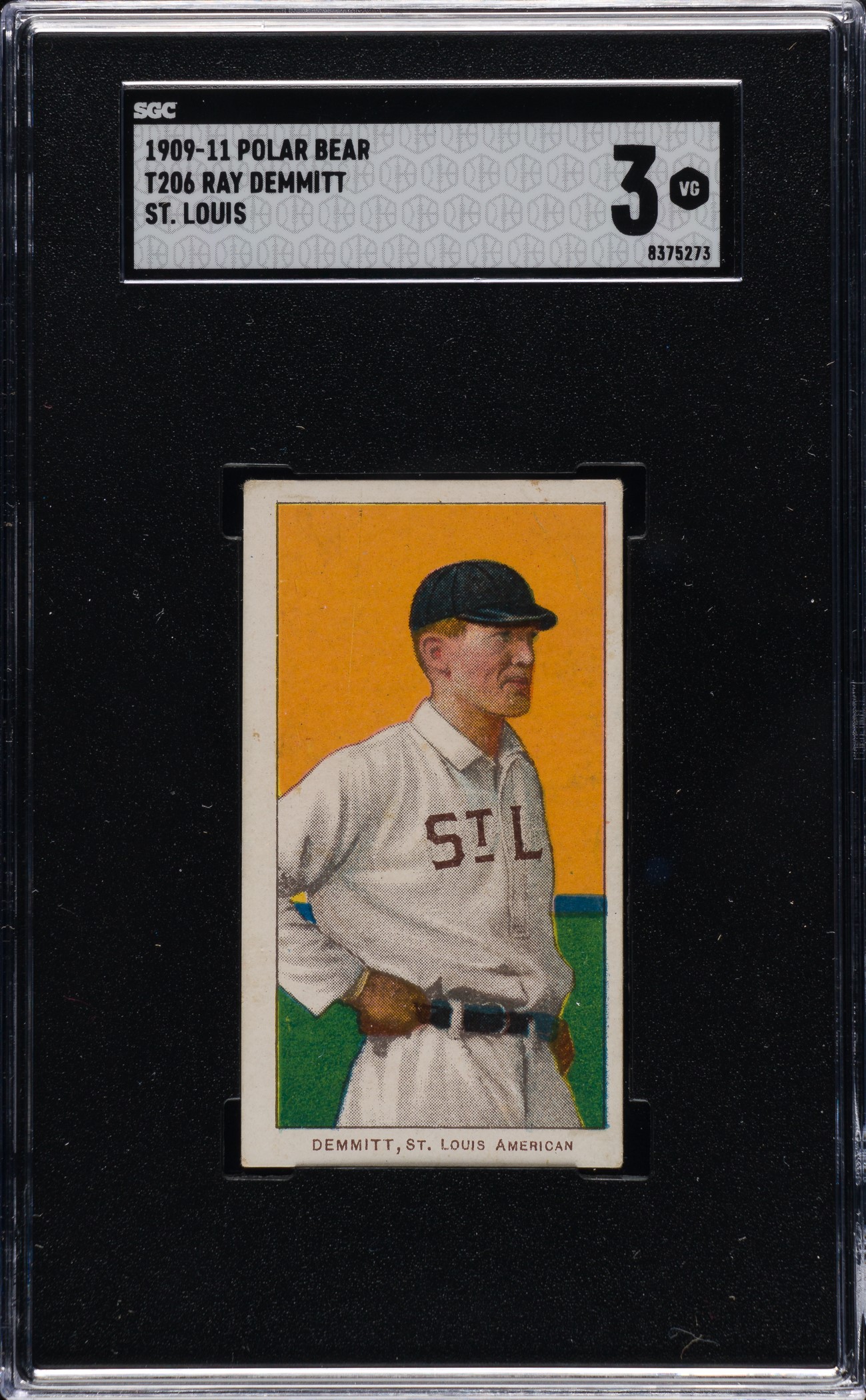 Graded VG 3 by SGC. Extremely pleasing example of the rare Demmitt, St. Louis Browns T206 variation. Polar Bear was the only company to issue this T206 variation, thus no doubt contributing to its significant rarity. T206 cards issued with Polar Bear tobacco were not well protected from the accompanying product, thus almost all Demmitts have significant condition problems, including at least some tobacco staining. This example has an overall clean reverse with little to no staining, centering slightly to the right, and fresh colors. Only a crease in the upper right corner is responsible for the assigned grade. This is a very attractive example of one of the rarest and most condition-sensitive cards in the classic T206 White Border set. Originating from the extraordinary collection of legendary collector Paul Pollard. Submitted by REA.