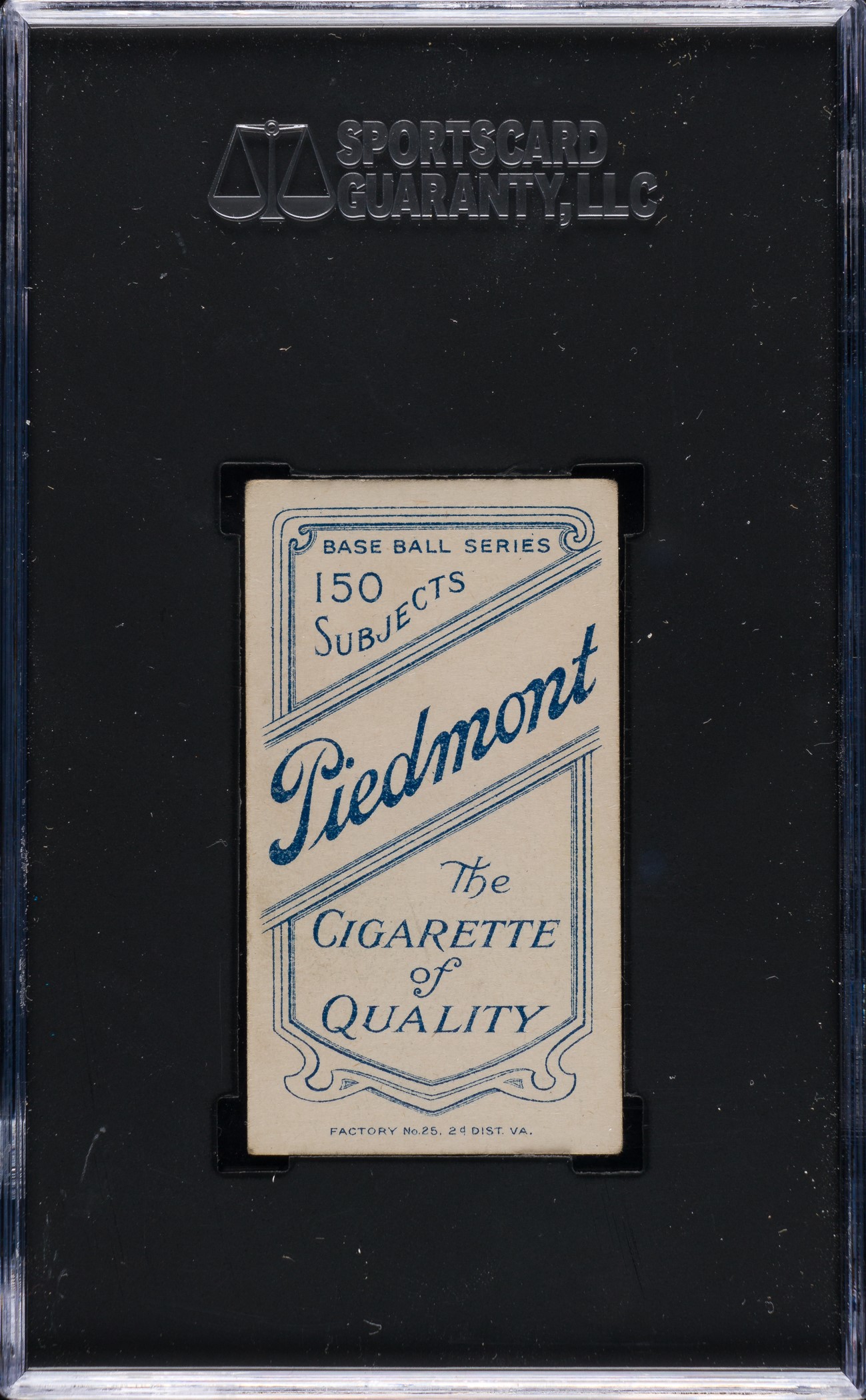 Graded VG-EX 4 by SGC. Extremely attractive example of this classic tobacco card of Hall of Famer Ty Cobb (Detroit). The Green Background pose has long been considered the rarest of the four poses of Cobb in the T206 set. Cobb's portrait contrasts sharply against the flawless green background. Perfect registration, no creases, clean both front and back, and four strong corners. The Piedmont reverse is perfectly clean. A very striking example of one Cobb's most popular cards from the premier tobacco issue of the 1910 era. Originating from the extraordinary collection of legendary collector Paul Pollard. Submitted by REA.