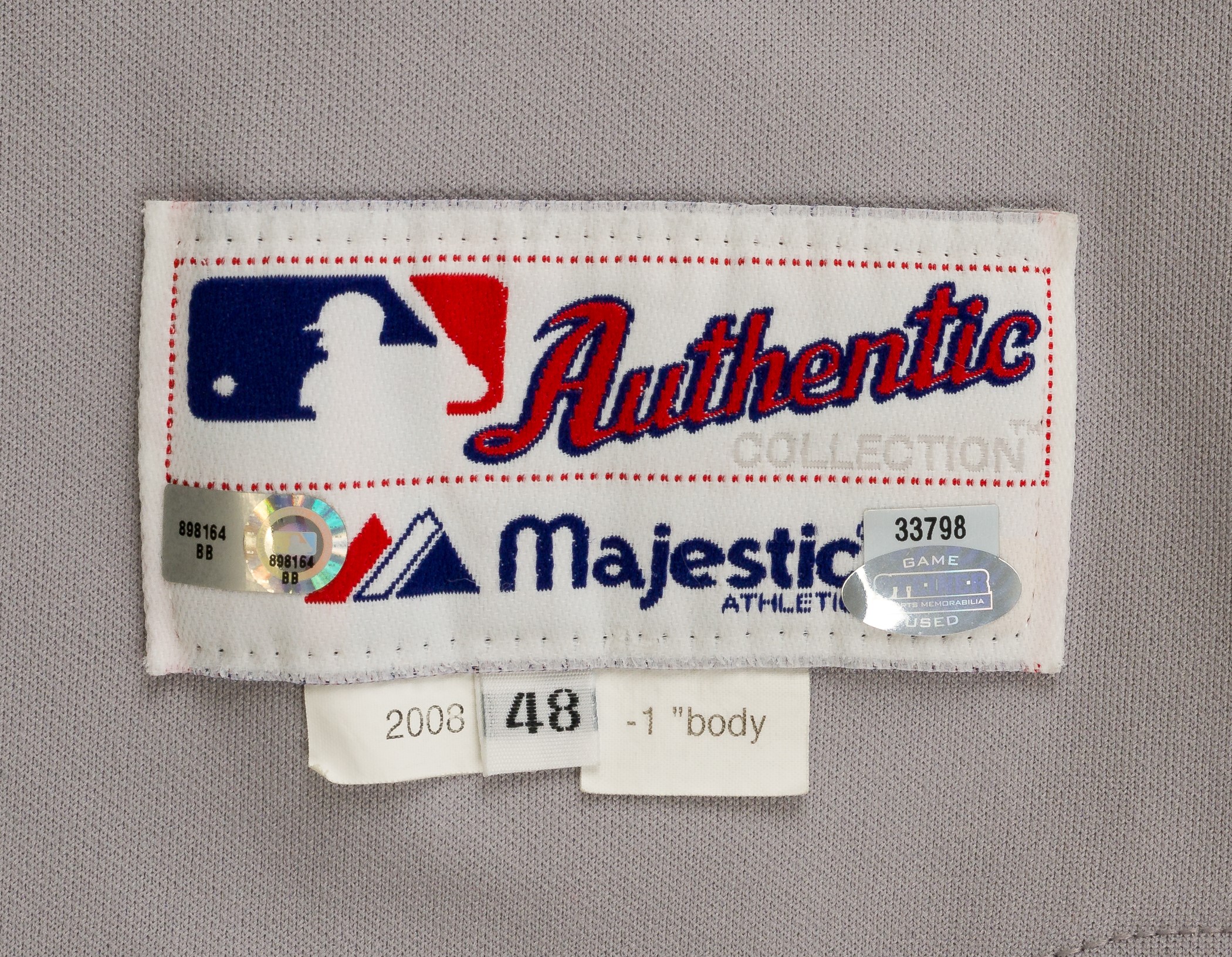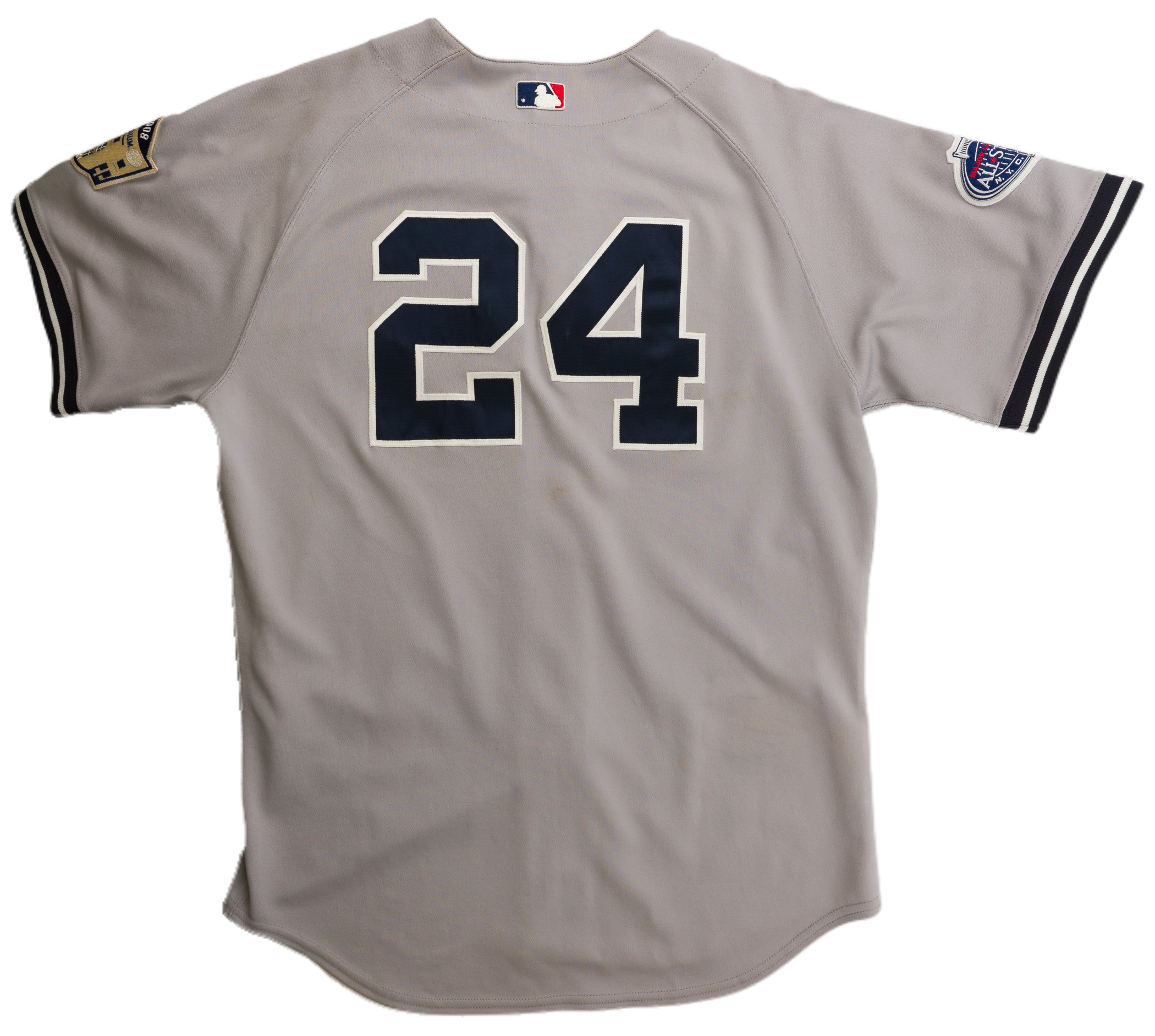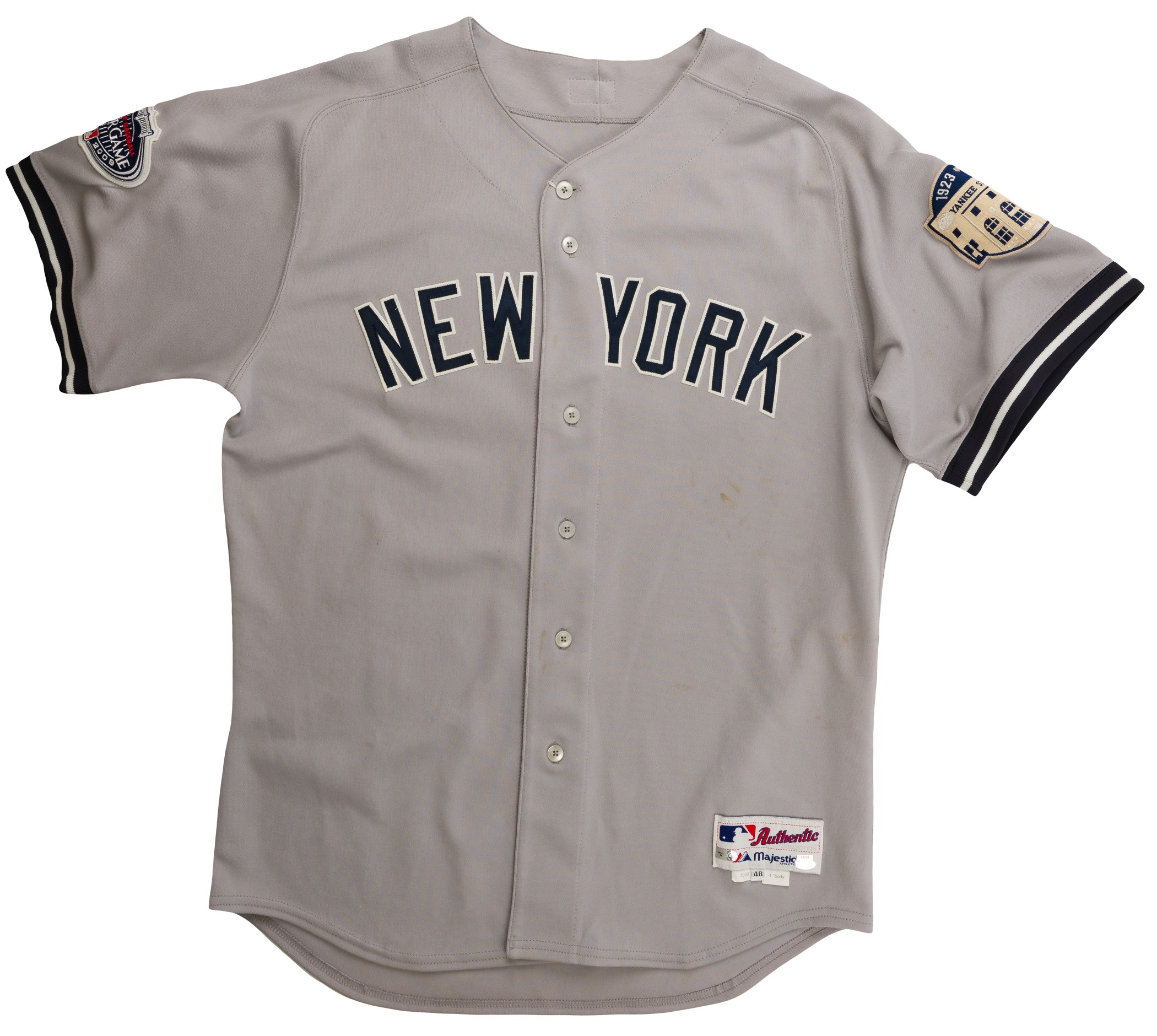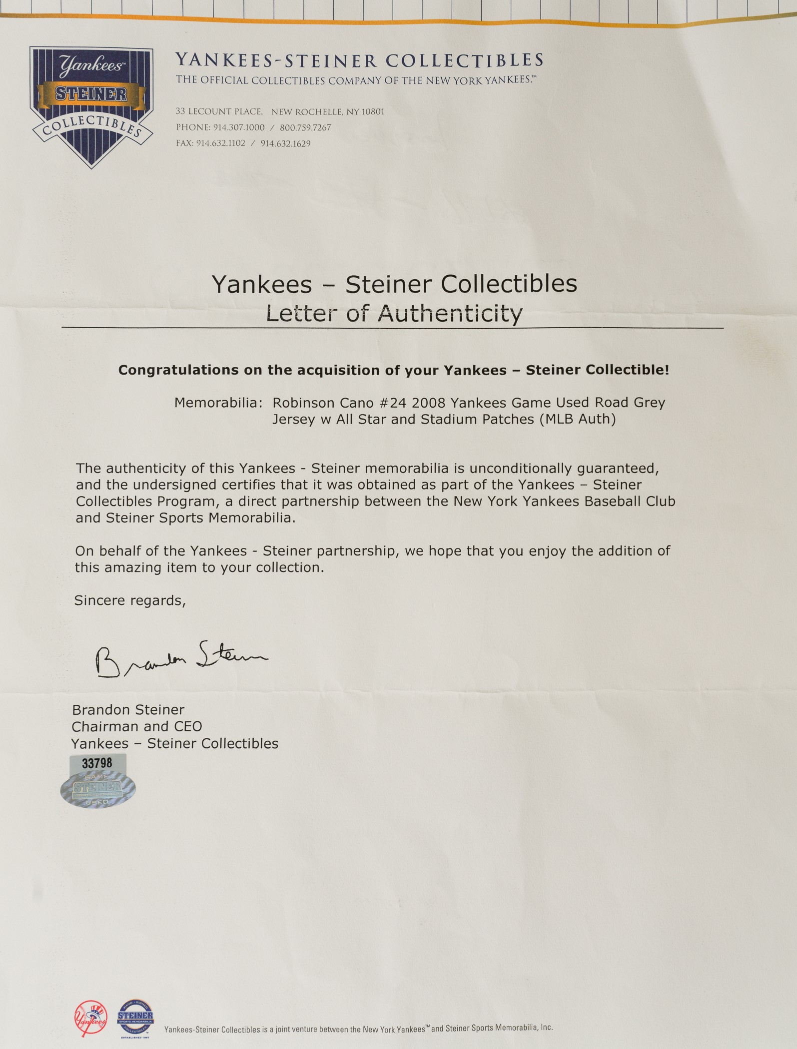 New York Yankees road jersey worn by outfielder Robinson Canó during the 2008 season, which was the last year the team played in the original Yankee Stadium. The jersey is accompanied by both a LOA from Steiner Sports and a Major League Baseball Authentication label (affixed to garment). According to the MLB database, Canó wore this jersey on April 14, 2008, in a game against the Tampa Bay Rays at Tropicana. The gray knit jersey features the "New York" logo across the chest and features the number "24" on the reverse. Both the logo and the numerals are appliquéd in navy tackle twill. A special Yankee Stadium commemorative patch appears on the left sleeve. Because 2008 was the club's final season at the original Yankee Stadium, Major League Baseball arranged for the 2008 All-Star Game to held at the famed "House That Ruth Built." Accordingly, a 2008 "All-Star" Game patch adorns the right sleeve. A "Majestic" label is located on the left front tail, as are a "48" size tag and "2008" year tag. The jersey is original as issued, with no alterations, and displays moderate wear, including a number of soil stains on the front. Canó entered the game as a pinch-hitter in the top of the Eighth inning April 14th. With the score tied 7-7, Canó hit a go-ahead, solo home run. That home run would prove to be decisive, as the Yankees would go onto to win 8-7. For the season, Canó batted .271 with 14 home runs and 72 RBI. Reserve $500. Estimate (open).