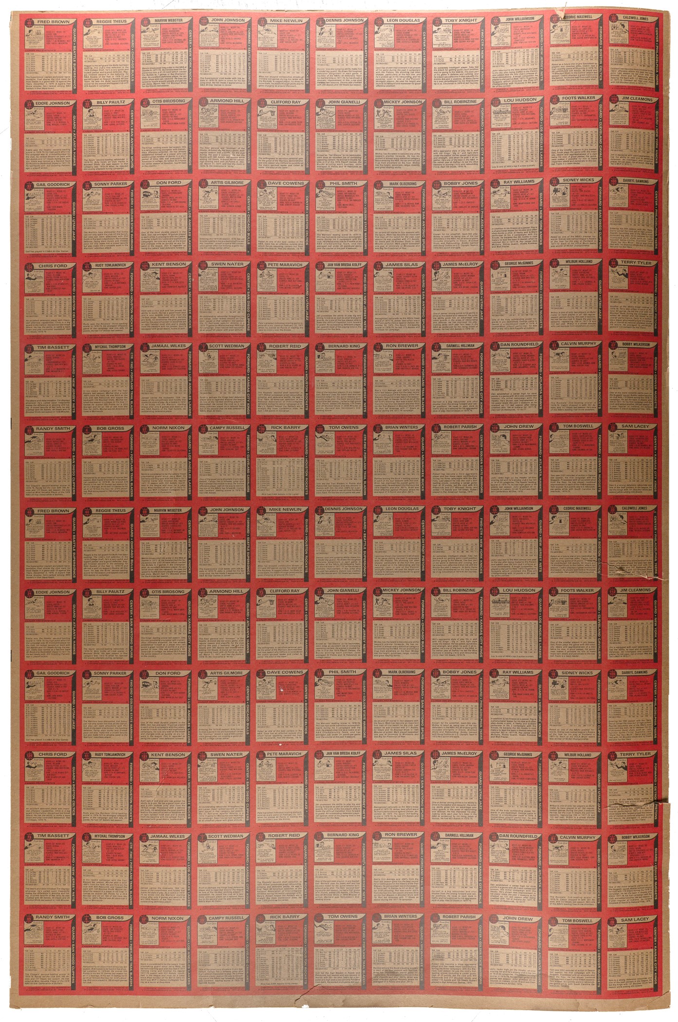 Original 1979-1980 Topps hockey uncut final production sheet consisting of 132 cards with fully printed reverses. In a very peculiar printing error, the reverse of the sheet displays upside down 1979-1980 Topps Basketball backs. The 1979-1980 Topps Hockey set includes the rookie card of Hall of Famer Wayne Gretzky, and many other Hall of Famers including Dryden, Howe, Hull, and Bossy. The offered sheet is arranged in twelve rows of eleven cards. The sheet has numerous condition flaws including creasing, large edge tears, light stains, and the upper right corner is torn off (but included). The sheet exhibits slightly off-register color alignment. The important Wayne Gretzky card shows no creasing, with a couple minor surface imperfections. Despite the technical flaws, the sheet is presentable, and would be a worthy addition to any advanced hockey, Wayne Gretzky, or uncut-sheet collection. Dimensions: 28-1/2 by 43 inches. Please note: This sheet has been stored rolled for many years and will be shipped as such. The size/weight of this item requires that there will be an additional shipping charge for this lot. Reserve $100. Estimate (open).