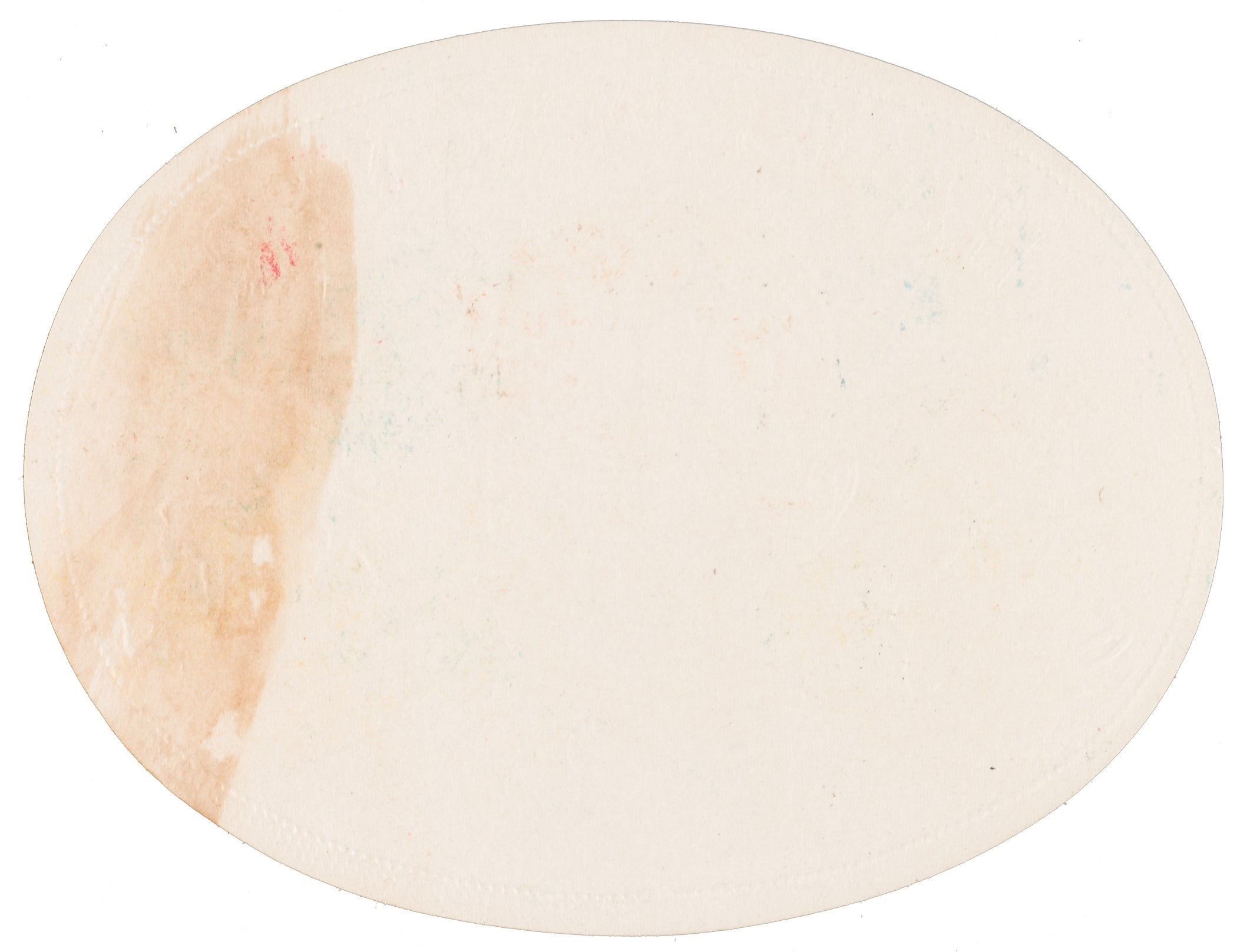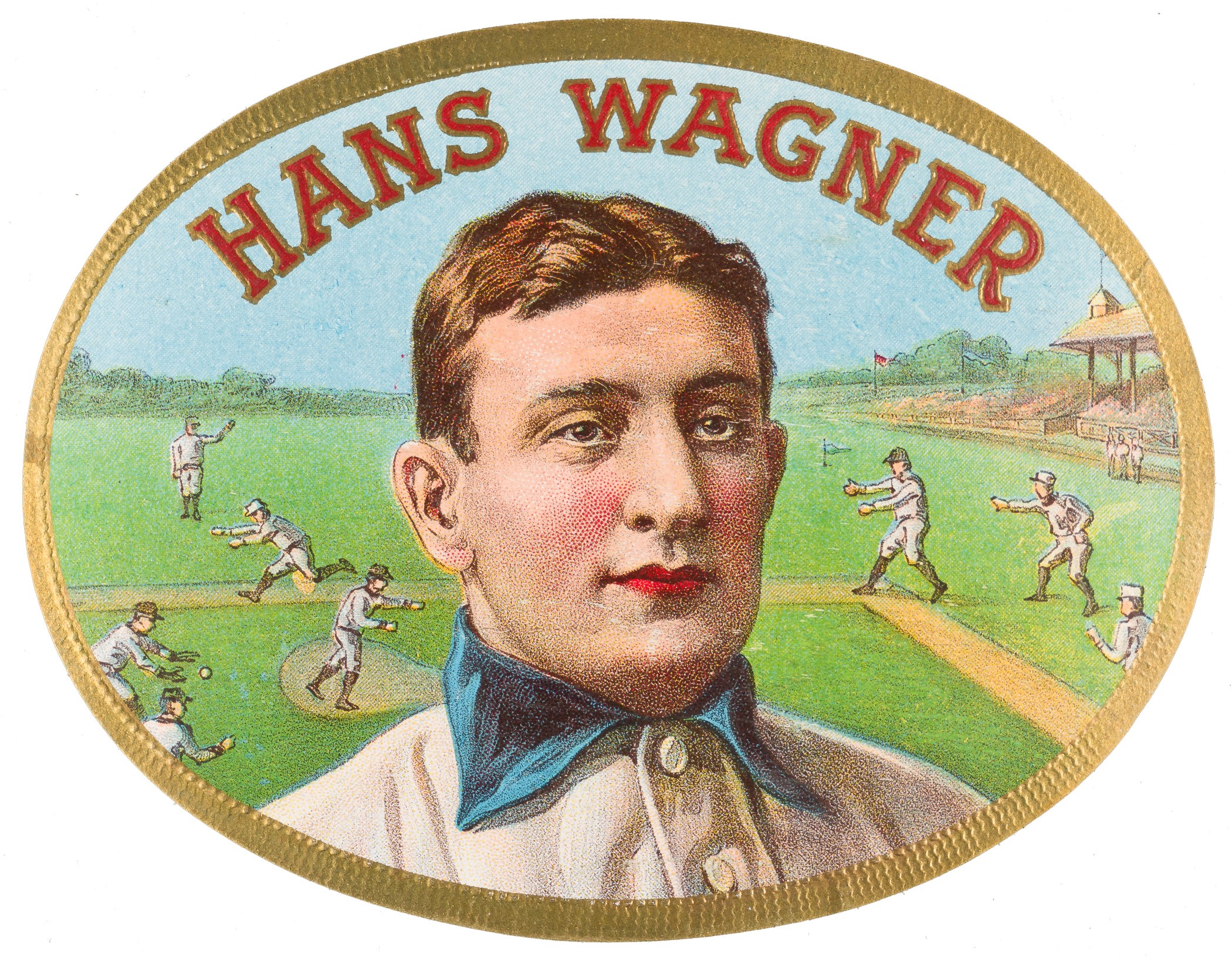 Exceedingly rare oval Honus Wagner cigar label featuring a portrait image of Wagner set against a colorful game-in-progress scene. This is one of only a few known Honus Wagner cigar labels, which were produced in either an oval or square format. What makes these labels so extraordinary, aside from their rarity, is their association with Wagner's legendary T206 tobacco card and the debate regarding Wagner's sponsorship/use of tobacco products. Over the years the legend of Honus Wagner and his relationship with tobacco has taken on a life of its own. Did he oppose tobacco? Is that why his T206 card is so rare? And if so, why is he shown in his coaching days with a plug of tobacco in his mouth on his 1948-1949 Leaf baseball card? Few items have poured more fuel on the fire than the few surviving circa 1909 cigar labels and cigar bands from "Hans Wagner Cigars." As most collectors will instantly recognize, the image of Wagner on this label is the same as that used on his T206 tobacco card. In addition to his image, the label includes a beautiful game-in-progress scene in the background, with "Hans Wagner" printed in large, red letters along the top border. Because we have yet to see any of these labels on a period cigar box, it is our belief that these labels were never actually used in the marketing of cigars. All known examples appear to be proofs saved as samples in the printer's files. The fact that they were produced at all, and obviously at great expense utilizing highest-quality stone litho production processes of the day, may actually lend all the more credibility to the legend that Wagner did not wish to be associated with the marketing of tobacco products (at least in the 1910 era). In any event, the offered example is not just a fascinating piece of the puzzle of the Honus Wagner legend, but also one of the most desirable and striking of all Honus Wagner tobacco related items. The label (4.25 x 3.25 inches) displays a light stain on the blank reverse and is otherwise in Excellent to Mint condition. Reserve $500. Estimate (open).