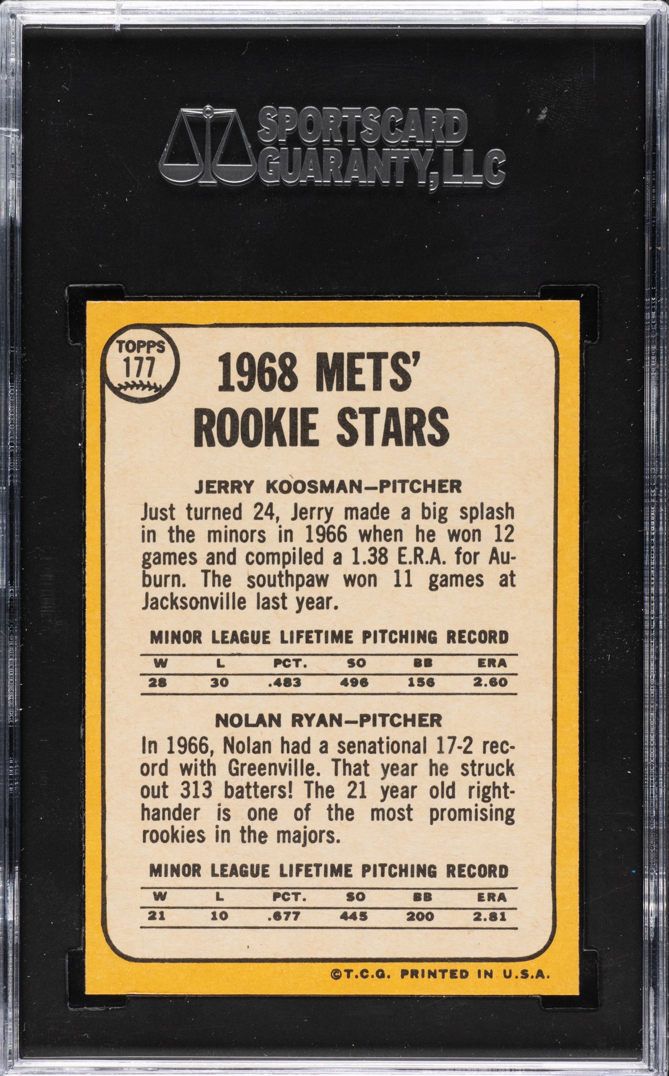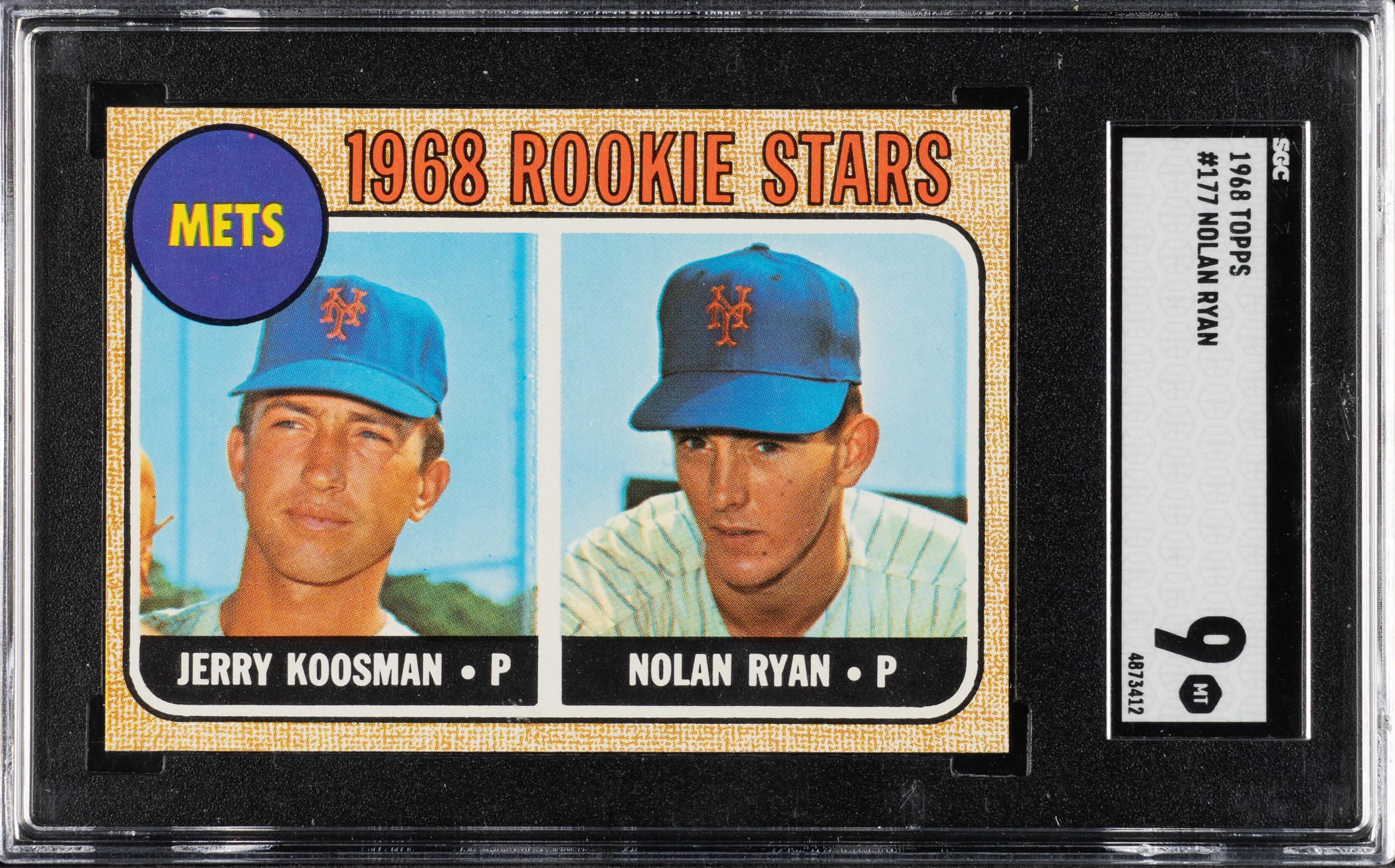Graded MINT 9 by SGC. Only six examples graded higher out of 2,422 cards evaluated by SGC to date! Stunning ultra-high-grade rookie example of Hall of Fame pitcher Nolan Ryan, one of the keys to the 1968 Topps set and one of the most famous of all Topps cards. Bright, crisp, and clean, with four razor-sharp corners, centering slightly left, and flawless image quality. The reverse is perfectly clean and well centered. This card would be at home in any world-class Hall of Fame or rookie-card collection and would be a significant upgrade to any high-grade set. This is a spectacular ultra-high-grade example of one of modern card collecting's great classics. Reserve $5,000.