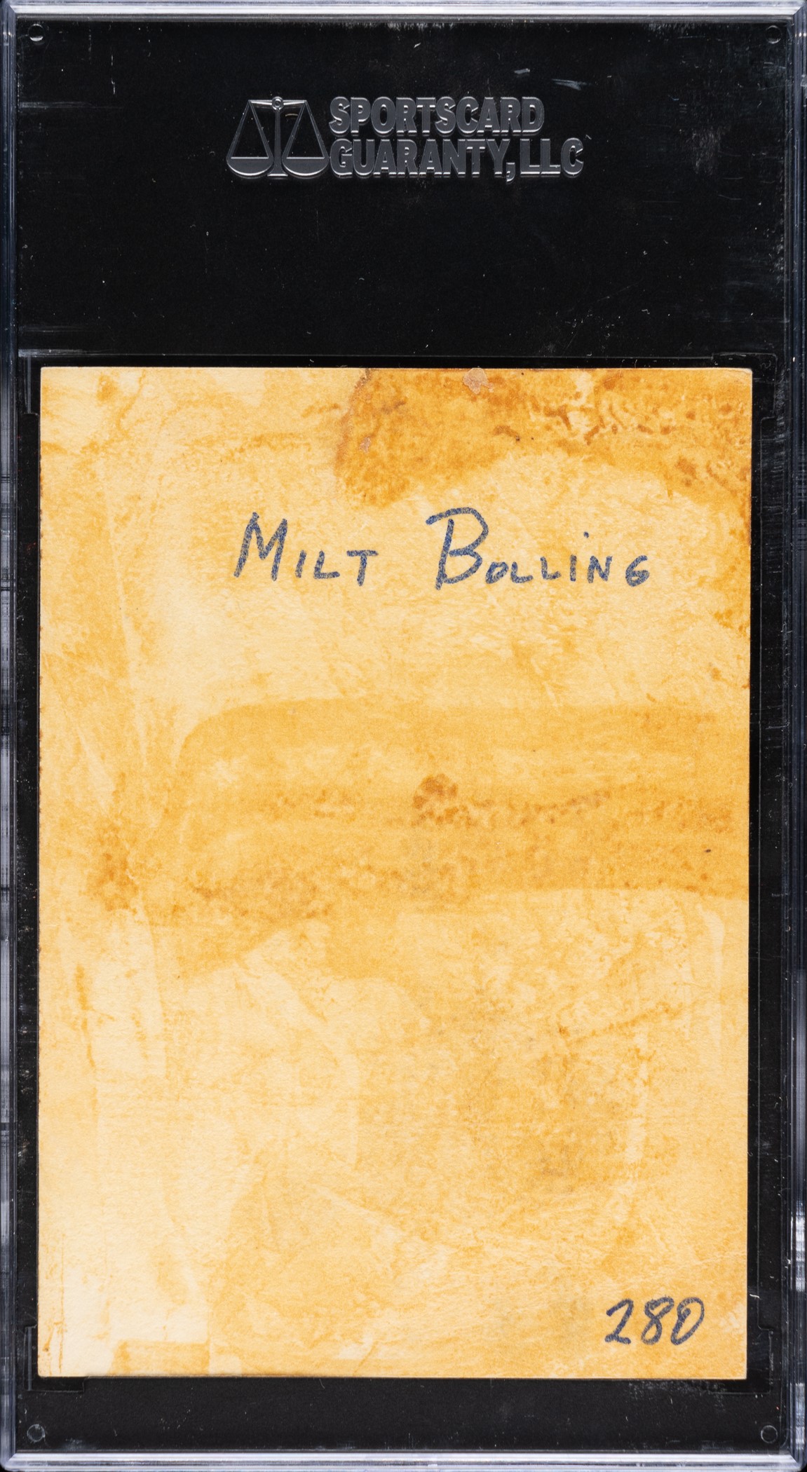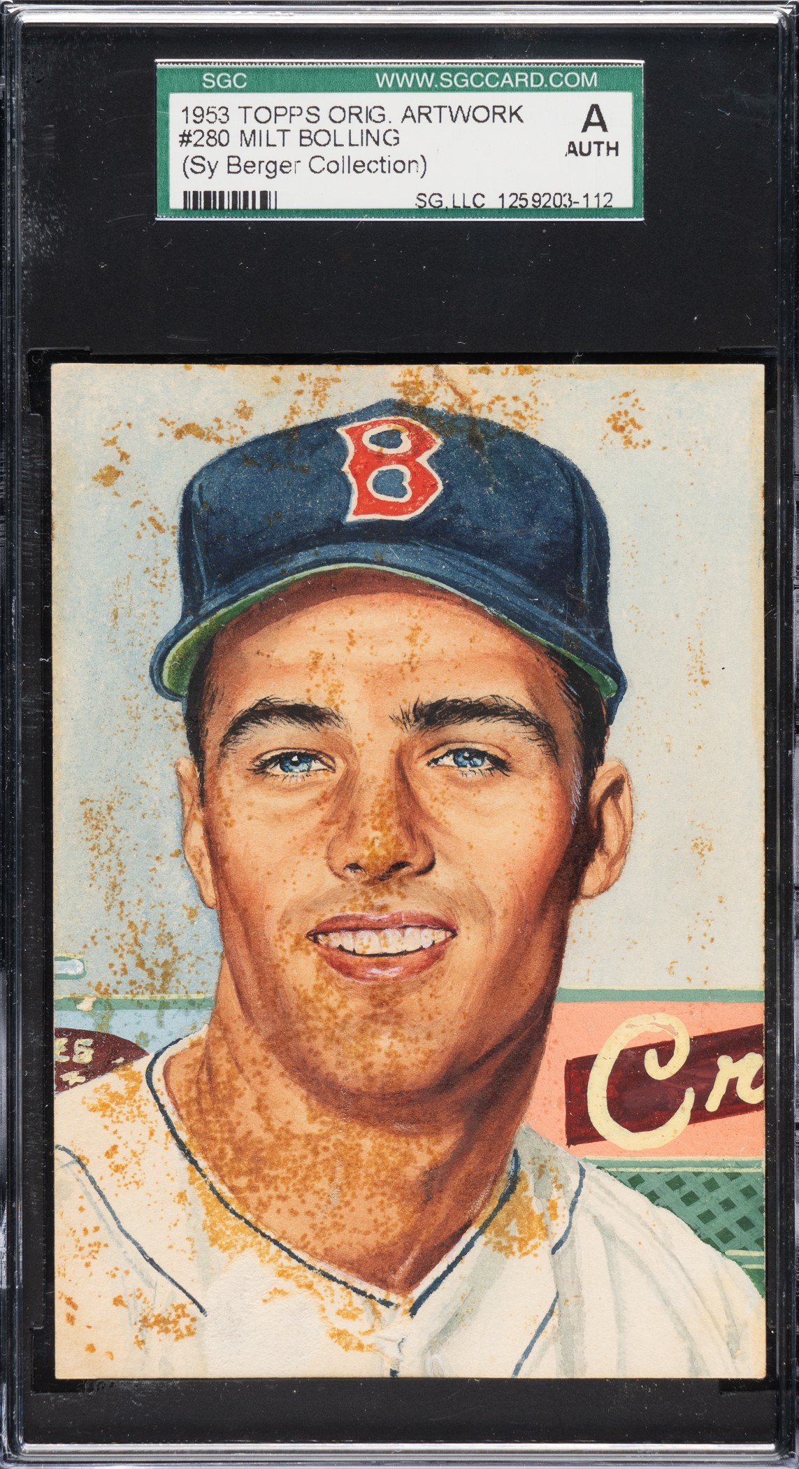 Presented is the actual original painting of Milt Bolling of the Boston Red Sox used to produce his card #280 (a short-print) in the 1953 Topps series. Originally from the collection of the legendary Sy Berger, this artwork was one of the 117 original 1953 Topps paintings personally consigned to REA in 2010 by "The Father of the Bubble Gum Card." This stunning artwork has been consigned directly from the original purchaser in the 2010 auction. 1953 Topps is one of the most popular sets ever issued and is the only 1950s set issued by Topps to utilize original paintings. The artwork measures 3.25 x 4.75 inches. Standard production-related glue remnants on the front and blank reverse. Excellent condition. Ex-Sy Berger Personal Collection. Encapsulated "Authentic" by SGC. Reserve $500.