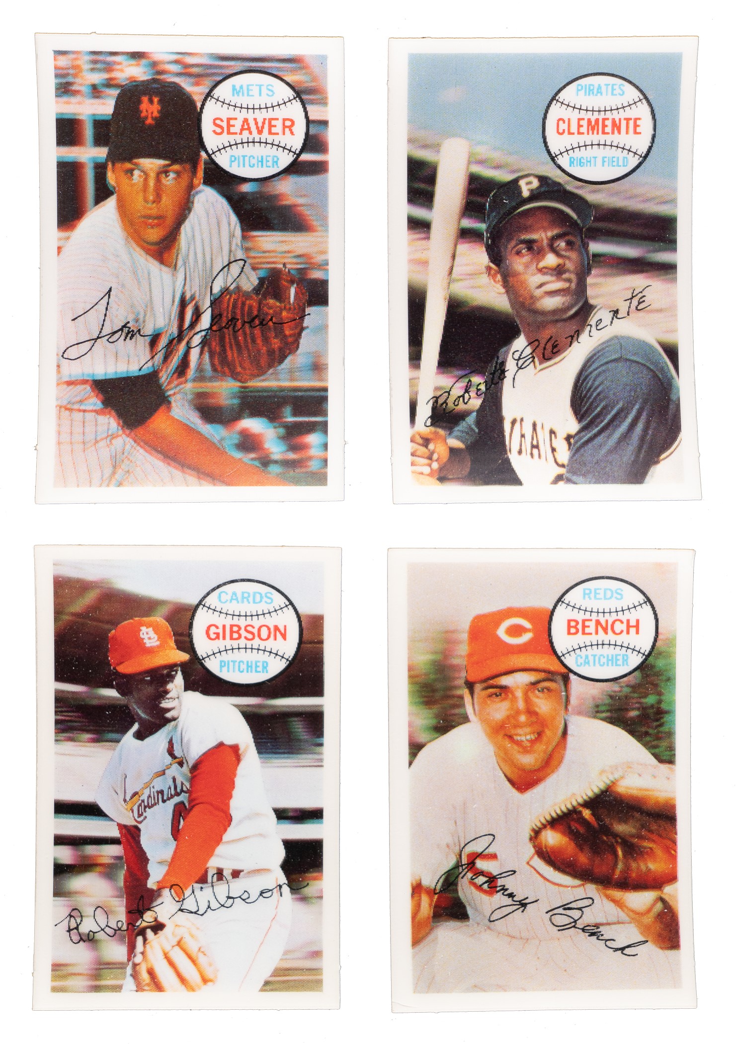 Throughout the 1970s and early 1980s, the Kellogg's cereal company was the only true competition for Topps in the baseball-card market. The 1970 issue, offered here, represents the first time in decades that Kellogg's included baseball cards in cereal boxes. It is well known for its three-dimensional design. These sets have always been of great interest to collectors as they offer affordable alternatives to standard-issue Topps cards of the many Hall of Famers and stars included in each set. An impressive twenty-three Hall of Famers are featured throughout this set, including Johnny Bench, Roberto Clemente, Willie Mays, and Ernie Banks, as well as the many other stars of the day, including Pete Rose. Condition is 60% Nr/Mt to Nr/Mt-Mt (including some Mint), 7% Ex to Ex-Mt, and 33% Vg to Vg-Ex (mostly due to minor cracking and including a couple lesser). Keys: #2 Rose (Vg-Ex), 7 Seaver (Ex), 12 Mays (Mint), 27 Clemente (Nr/Mt), 32 Jackson (Vg), 40 Banks (Vg-Ex), 58 Bench (Vg-Ex), and 71 Gibson (Mint). A very attractive and mostly high-grade complete set of this unusual 1970s baseball series. Total: 75 cards. Reserve $200.