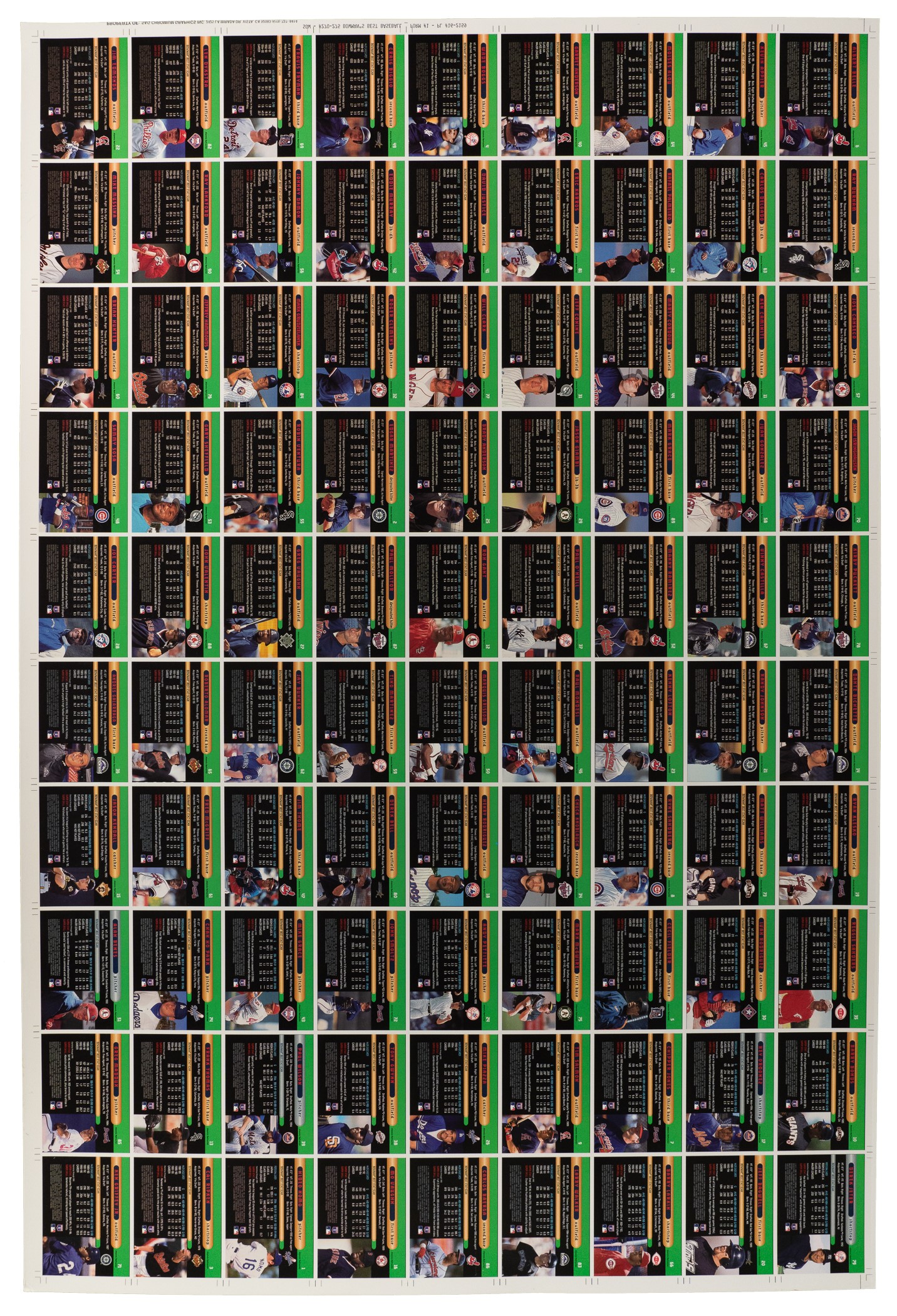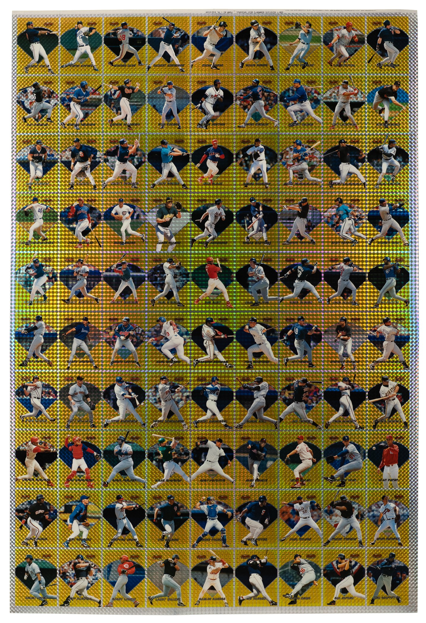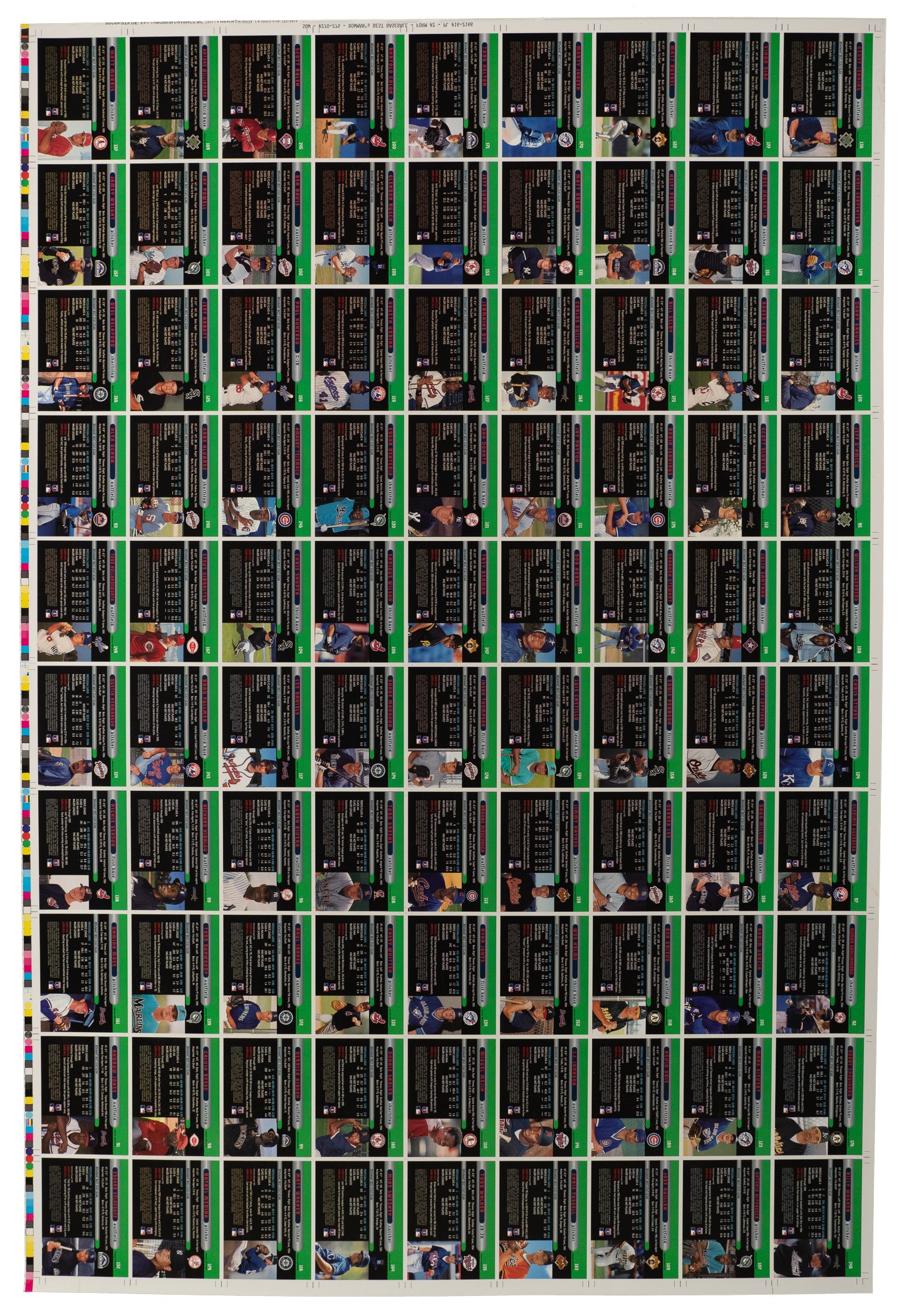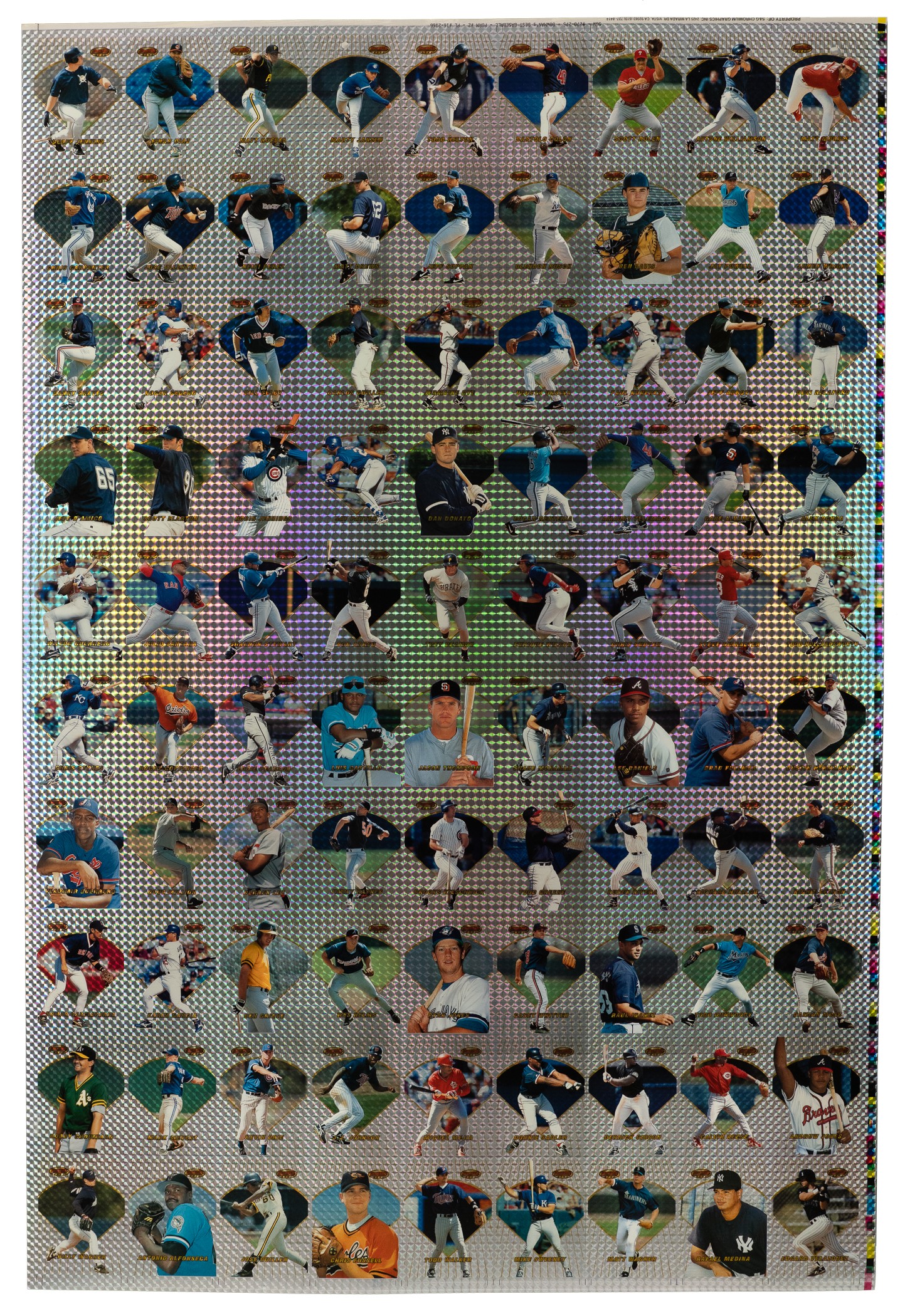 Presented is a pair of final-production, uncut sheets from the 1996 Bowman's Best Atomic Refractor issue. These sheets (27 x 40 inches), arranged in 10 rows of 9 cards, contain a complete set of 180 cards. The set is highlighted by the inclusion of a number of Hall of Famers and stars, including Derek Jeter, Randy Johnson, and Ken Griffey Jr. The sheets are in Excellent condition with light perimeter wear and scattered surface scratching. These striking uncut sheets would be ideal for framing and display. Total: 2 uncut sheets. The size/weight of this item requires that there will be an additional shipping charge for this lot. Reserve $200.