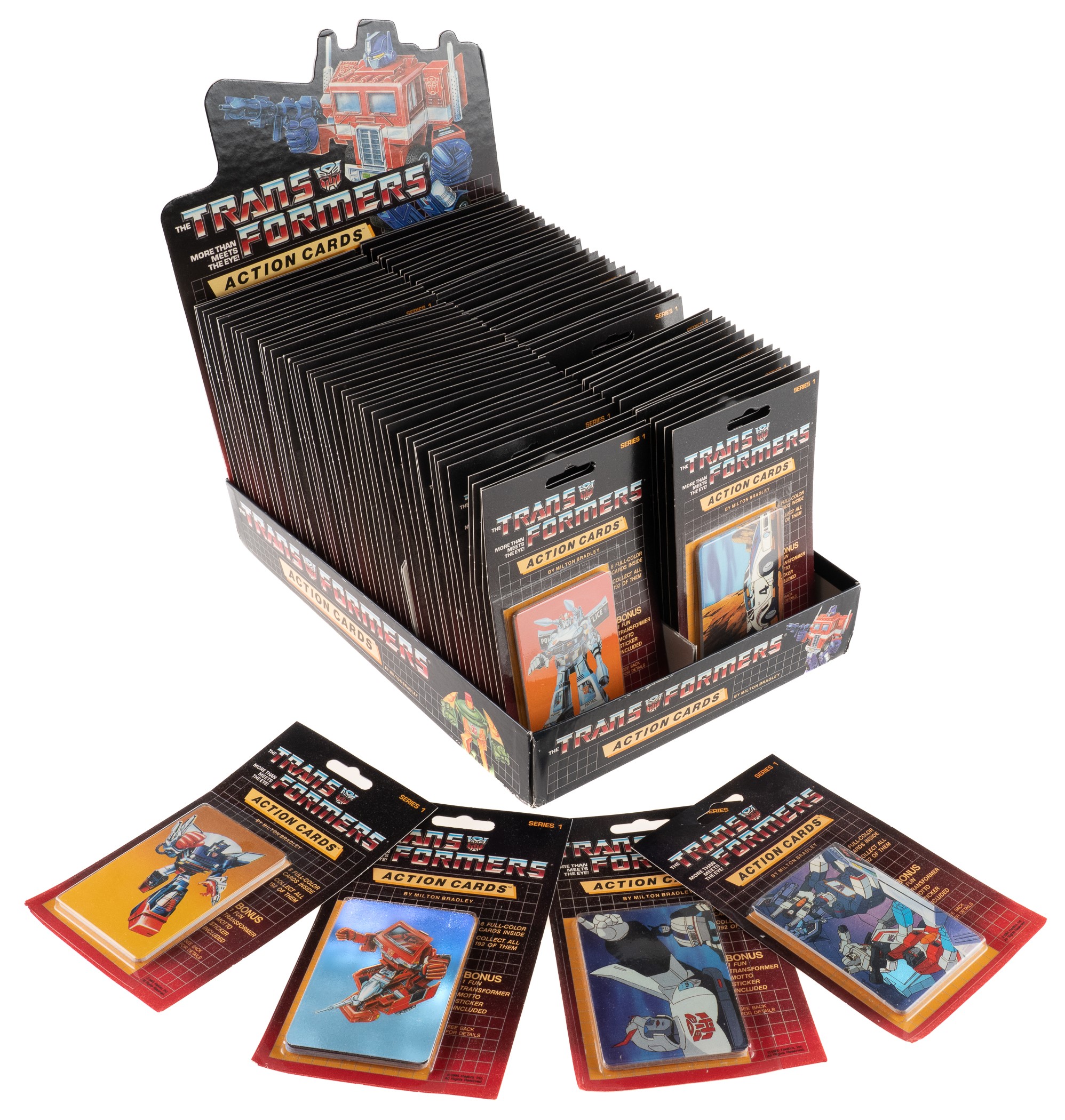 Collection of 95 original unopened 1985 Hasbro Milton Bradley "Transformers" packs. Each pack contains eight cards and one Transformer motto sticker from the 192-card series. While it is impossible to provide guarantees with reference to grading of unopened material, there is the very real possibility that within these packs are high-grade cards. This is a desirable grouping of packs that would make a fantastic addition to a non-sport pack collection. Total: 95 packs. Reserve $500.