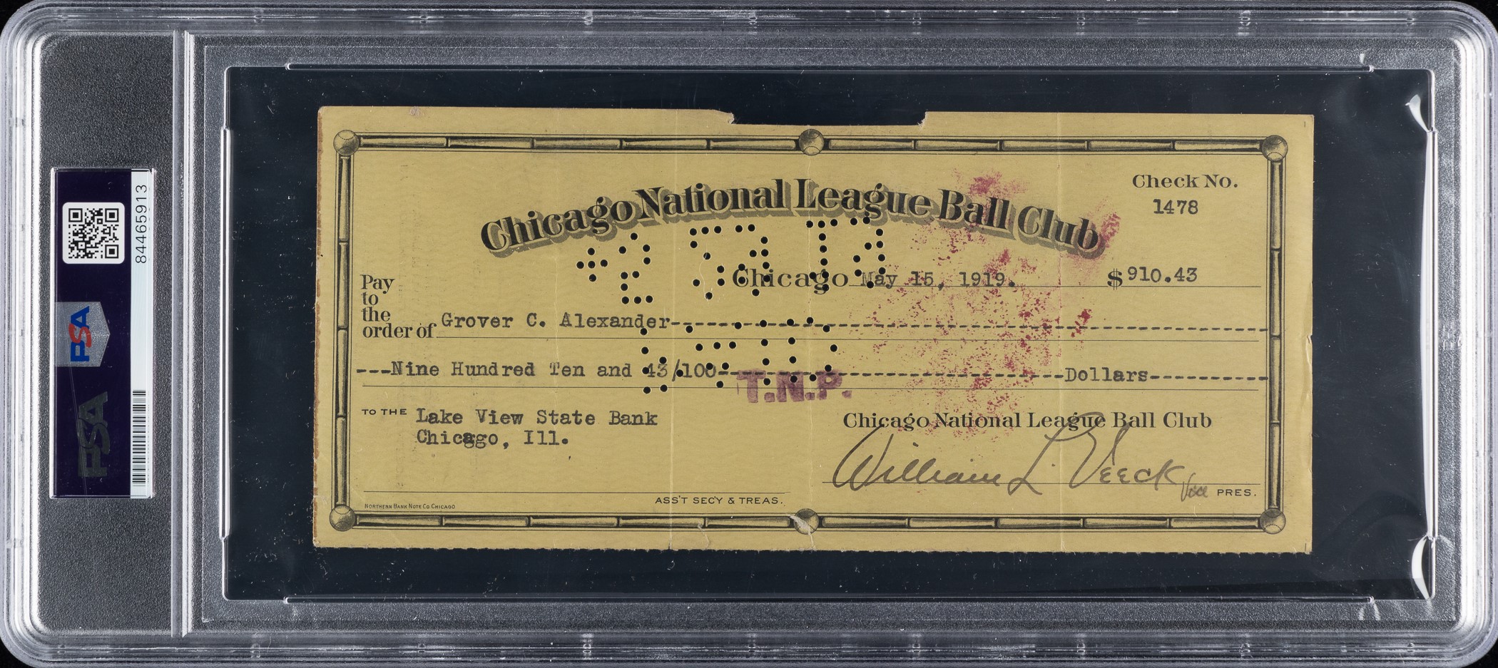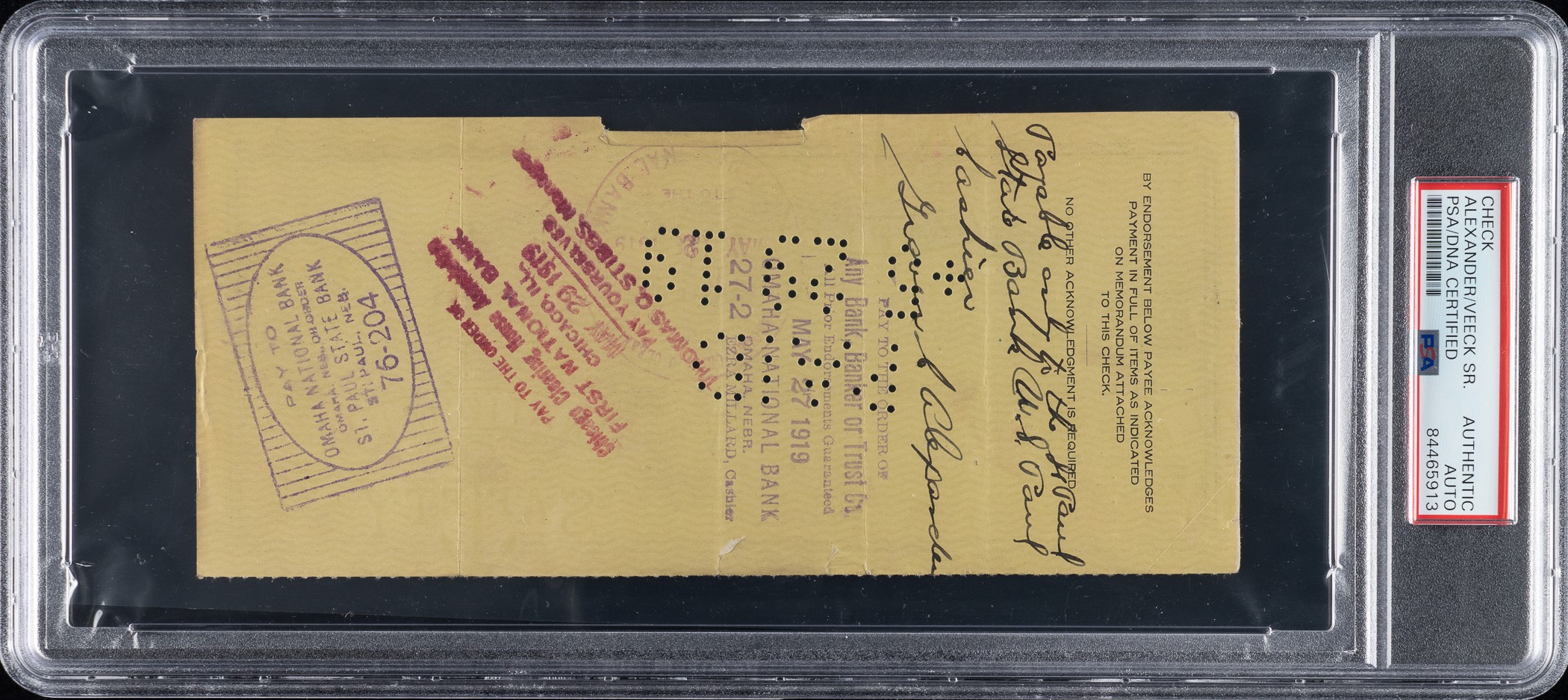 Chicago Cubs payroll check dated May 15, 1919, and issued to and endorsed by Hall of Fame pitcher Grover Alexander. PSA/DNA has encapsulated the check and certified the signature as "Authentic." The check, drawn on the Lake View State Bank of Chicago, Illinois, is made out in the amount of $910.43. Signed by the club president William Veeck Sr. in the lower-right corner. Endorsed by "Grover C. Alexander" in black fountain pen on the reverse. This is an exceptionally early Hall of Famer payroll check. This lot originates from the extraordinary collection of a longtime Chicago Cubs executive, Eldred "Salty" Saltwell, which is consigned to this auction by his family. The collection, which includes a remarkable array of contracts, checks, and other related documents and mementos, will be presented over a series of auctions and will offer publicly for the first time many significant items spanning decades of Chicago baseball. The check (8.25 x 3.75 inches), which has normal bank cancellation stamps and holes, displays three vertical folds, moderate creasing, and edge tears. In Good condition overall. Reserve $1,000.