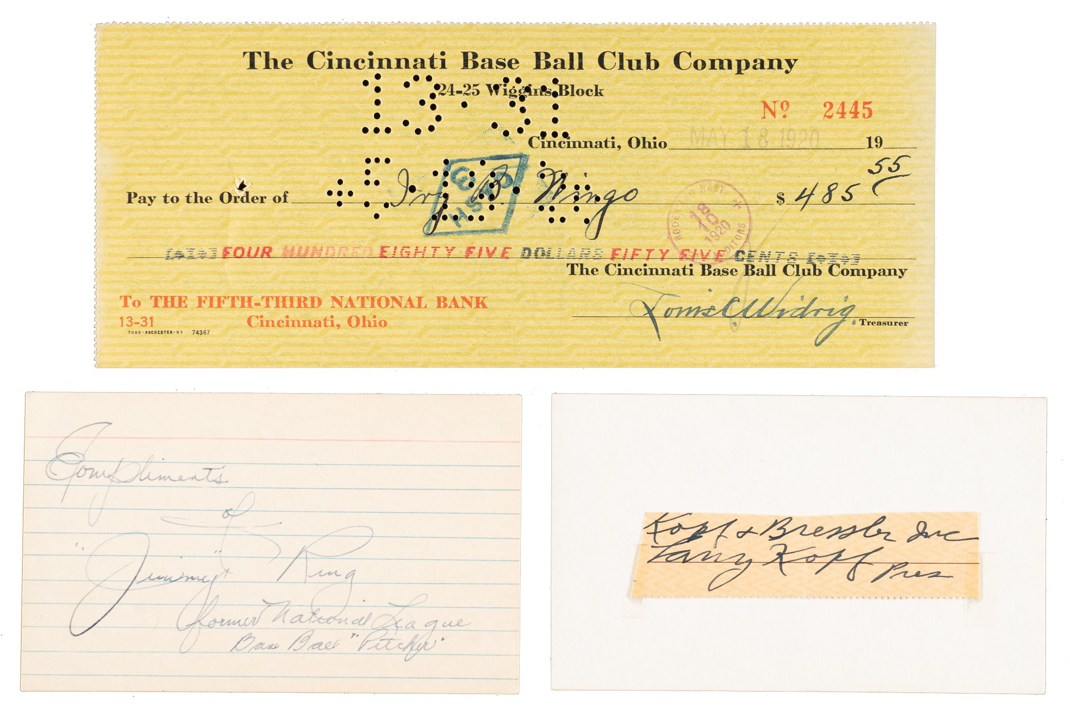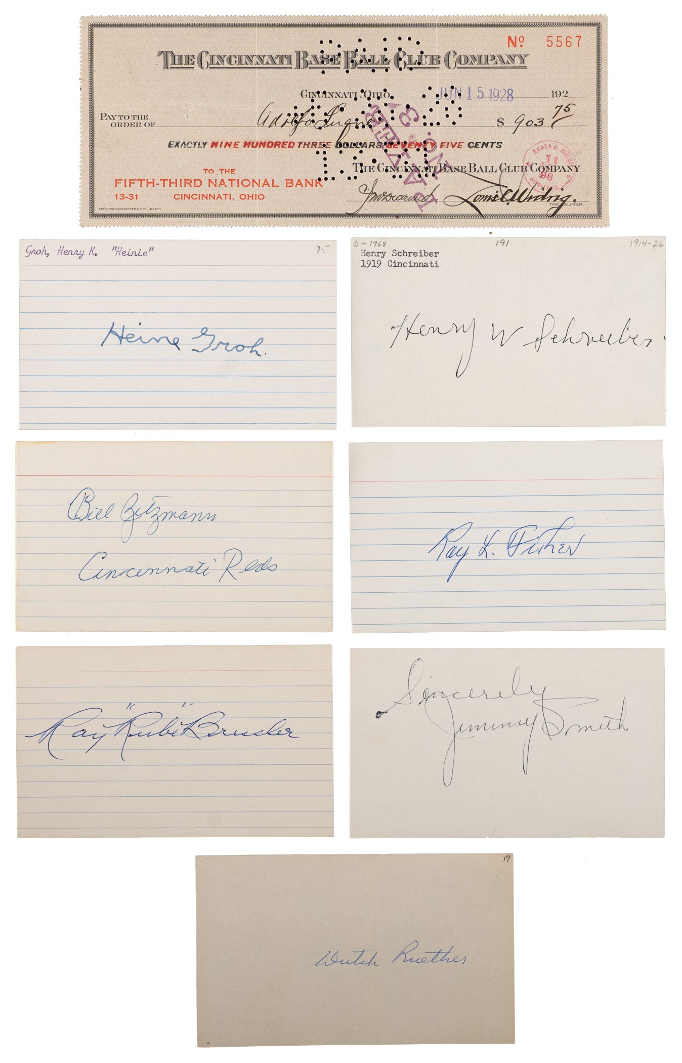 The 1919 Cincinnati Reds remain one of baseball’s most memorable clubs due to their World Series association with the Chicago White Sox, baseball’s most infamous club. Offered is a large and desirable 1919 Cincinnati Reds signature collection featuring eleven different players. Two of the signatures are in the form of endorsements on 1920s Cincinnati Reds payroll checks. Unless otherwise noted, all of the signatures are penned in blue or black ink on 3 x 5-inch index cards (lined and unlined). 1) Rube Bressler. 2) Ray Fisher. 3) Heine Groh. 4) Larry Kopf (cut from a check and taped to index card). 5) Adolfo Luque (on a Reds payroll check dated 6/15/28 and endorsed “Adolfo Luque” on the reverse, 8-3/8 x 3-3/8 inches). The payroll check has normal bank cancellation stamps and perforations. Vg condition. 6) Jimmy Ring (includes the salutation “Compliments of”). 7) Dutch Ruether. 8) Henry Schreiber. 9) Jimmy Smith (includes the salutation “Sincerely”). 10) Ivy Wingo (on a Reds payroll check dated 5/18/20 and endorsed “Ivy B. Wingo” on the reverse, 8.5 x 3.5 inches). The payroll check has normal bank cancellation stamps and perforations. Ex condition. 11) Bill Zitzmann. Auction LOA from James Spence/JSA. Total: 11 signed items. Reserve $200.