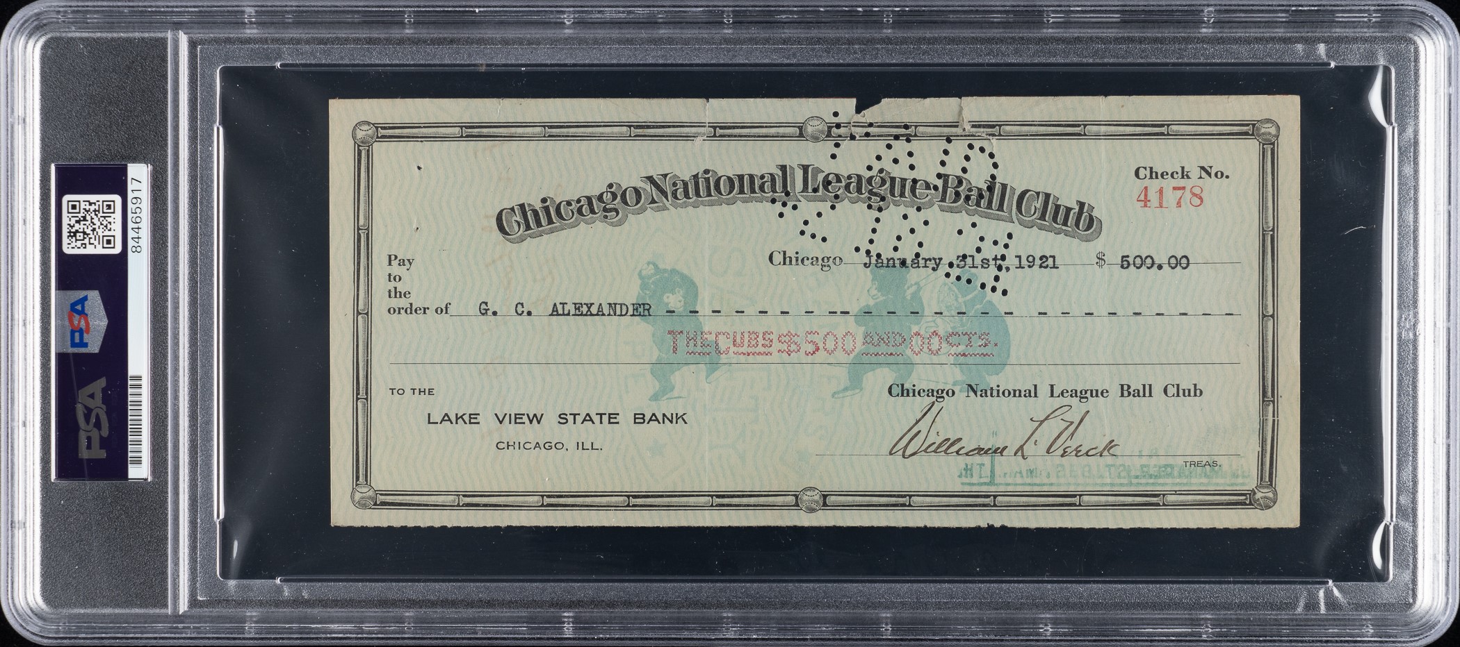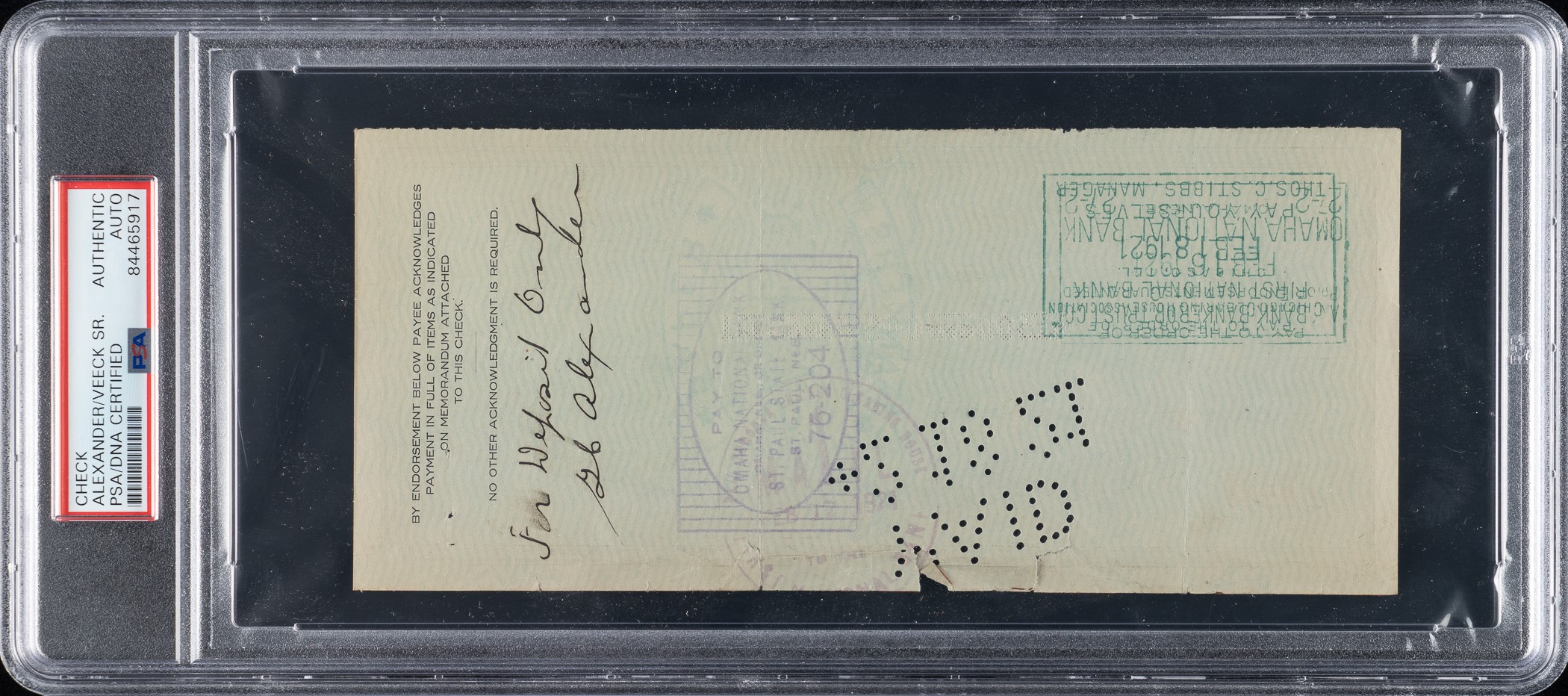 Chicago Cubs payroll check dated January 31, 1921, and issued to and endorsed by Hall of Fame pitcher Grover Alexander. PSA/DNA has encapsulated the check and certified the signature as "Authentic." The check, drawn on the Lake View State Bank of Chicago, Illinois, is made out in the amount of $500.00. Signed by team president William L. Veeck (father of Hall of Fame owner Bill Veeck) in the lower-right corner. Endorsed by "GC. Alexander" in black ink on the reverse. Also inscribed is "For Deposit Only" directly above Alexander's signature. This lot originates from the extraordinary collection of a longtime Chicago Cubs executive, Eldred "Salty" Saltwell, which is consigned to this auction by his family. The collection, which includes a remarkable array of contracts, checks, and other related documents and mementos, will be presented over a series of auctions and will offer publicly for the first time many significant items spanning decades of Chicago baseball. The check (8.25 x 3.75 inches), which has normal bank cancellation stamps and holes, displays a vertical fold, moderate creasing, three tears on the top edge, and a staple hole on the upper left. In Good condition overall. Reserve $1,000.