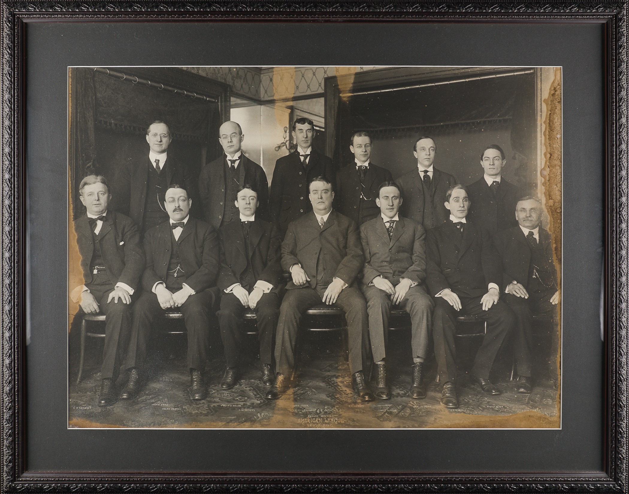 Extraordinary large-format photograph (25 x 18.5 inches, visible dimensions) capturing 13 executives at the annual meeting of the American League in 1904. League President Ban John Johnson is seated in the center, surrounded by the following team officials, all of whom are identified in print below their respective images: Charles Comiskey (Chicago), John E. Bruce (St. Louis), Frank Farrell (New York), Frank Navin (Detroit), C. W. Somers (Cleveland), Connie Mack (Philadelphia), R. L. Hedges (St. Louis), John I. Taylor (Boston), Carl M. Green (Detroit), J. F. Kilfoyl (Cleveland), Robert McRoy (League executive), and Ben Shibe (Philadelphia). The white-letter caption along the base reads "Annual Meeting/American League/Chicago/1904." The size of this photo is not surprising given that it bears the photography credit of George Lawrence in the lower-right corner. Lawrence was one of the most prominent photographers of his era who specialized in images of enormous proportions. One of the most innovative and successful commercial photographers of his era, Lawrence delighted in producing awe-inspiring images of grand size, a fact noted in his business slogan that read "The Hitherto Impossible in Photography is Our Specialty." He was also a pioneer in the field of aerial photography. Lawrence produced several memorable baseball photos over the years, many of which captured World Series action in his hometown of Chicago. This is an early American League executives photo, as the league was in just its fourth year of operation as a "major league." The photo displays discoloration along all four borders, touching upon the images of Johnson, Comiskey and Shibe, but the central image area is free of any significant flaws. Matted and framed to total dimensions of 32.5 x 26 inches. The size/weight of this item requires that there will be an additional shipping charge for this lot. Reserve $300.