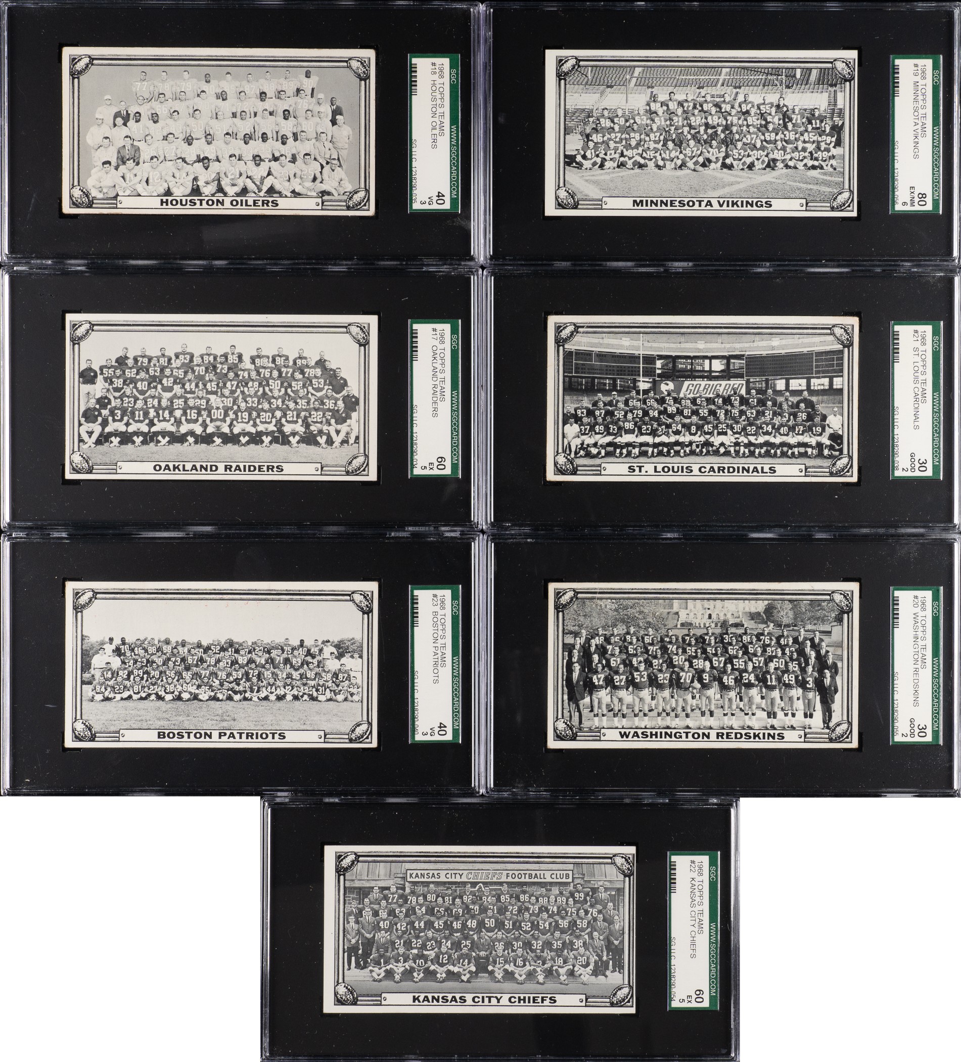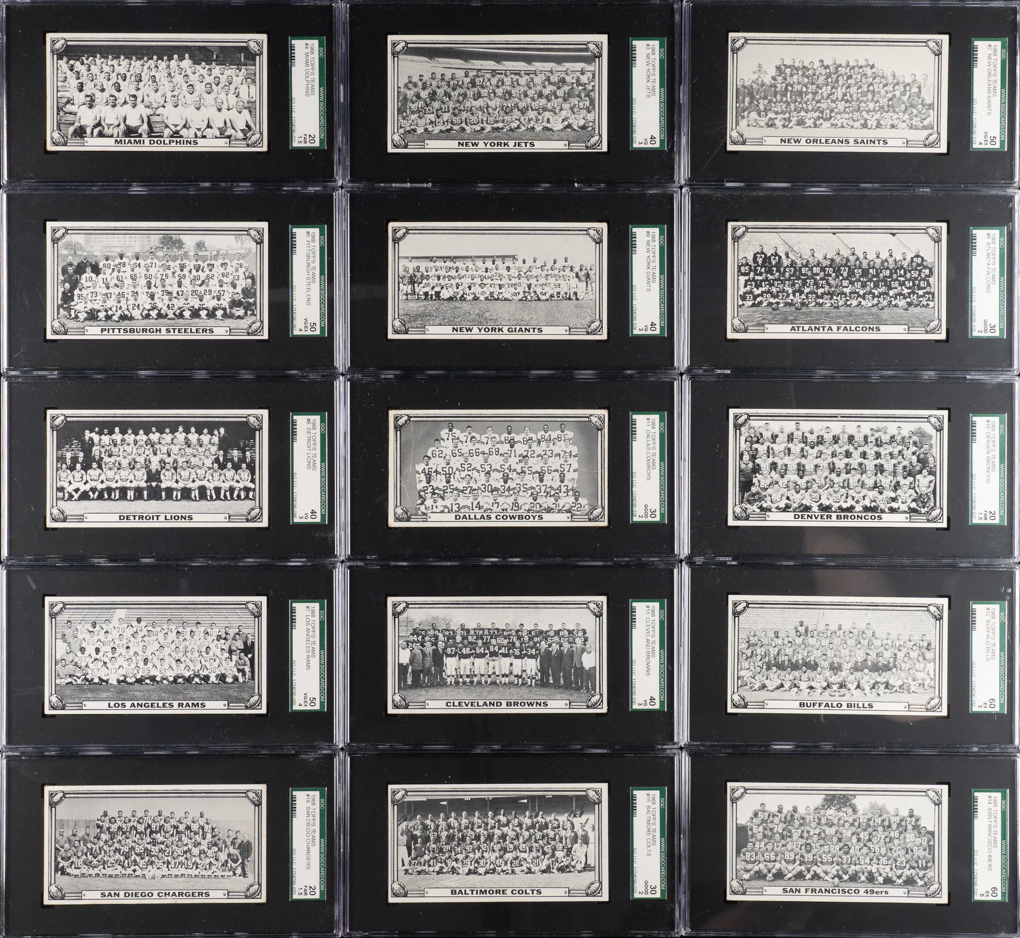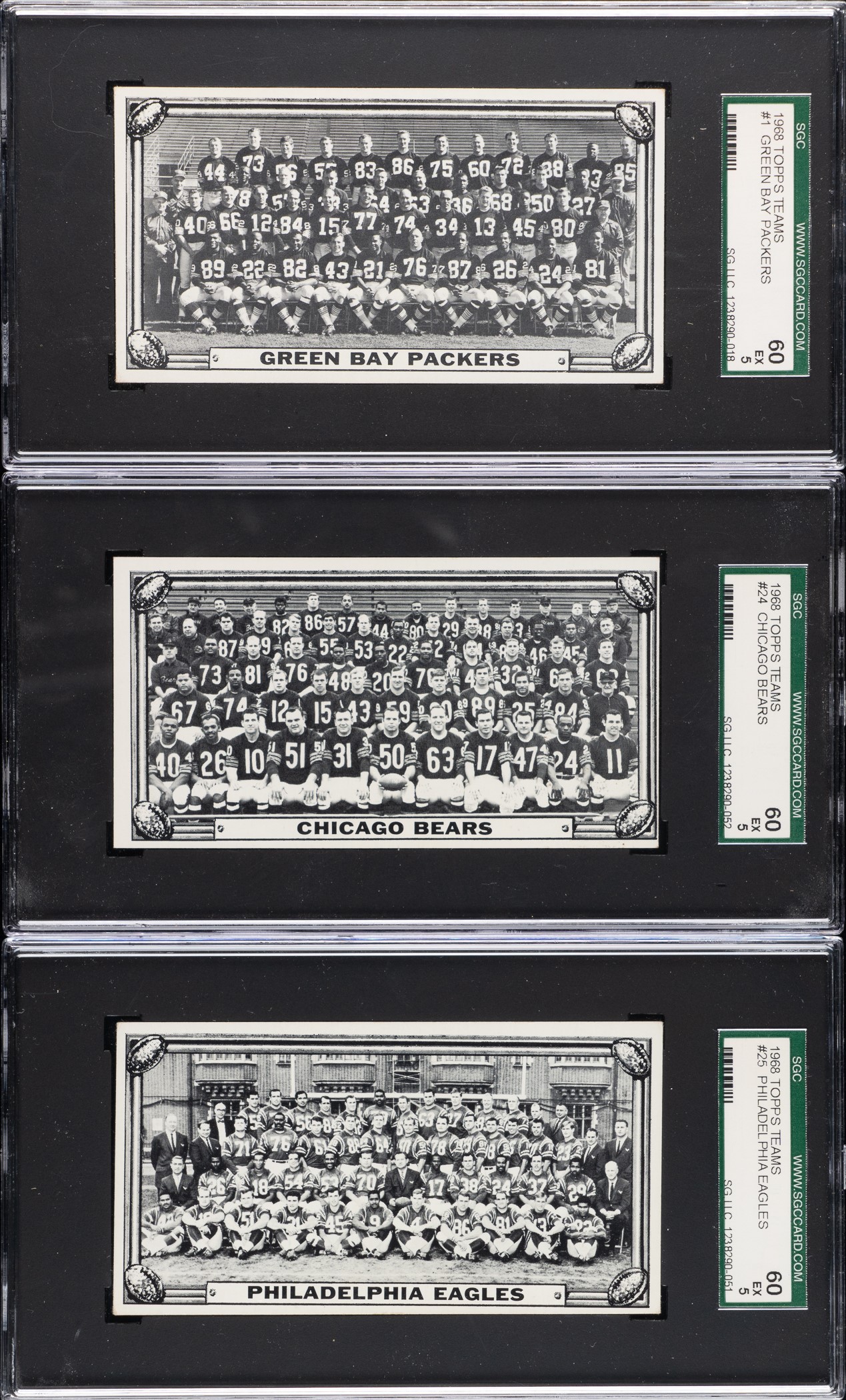 Presented is an exceptional complete set of the rare 1968 Topps Test Teams football issue, entirely graded and encapsulated by SGC. This 25-card set features black-and-white NFL team photos on cards measuring approximately 4-5/8 x 3-1/2 inches. The reverse of each card lists the team members in red text against an off-white background SGC Grading Composite: EX/NM 80 (1 card): #19. EX 60 (7 cards): #1, 12, 14, 17, 22, 24, and 25. VG/EX 50 (3 cards): #2, 5, and 7. VG 40 (6 cards): #3, 6, 9, 13, 18, and 23. GOOD 30 (5 cards): #8, 11, 15, 20, and 21. FAIR 20 (3 cards): #4, 10, and 16. This is only the third complete set of Topps Test Teams we have ever handled and one of only a handful that we have ever seen offered at public auction in the last ten years! This is an extremely attractive and mostly mid-grade complete set of this very scarce Topps test issue that would be a significant highlight in even the most advanced football-card collection. Total: 25 cards. The size/weight of this item requires that there will be an additional shipping charge for this lot. Reserve $500.