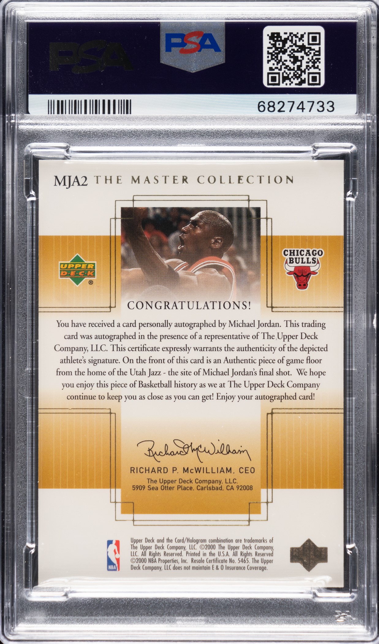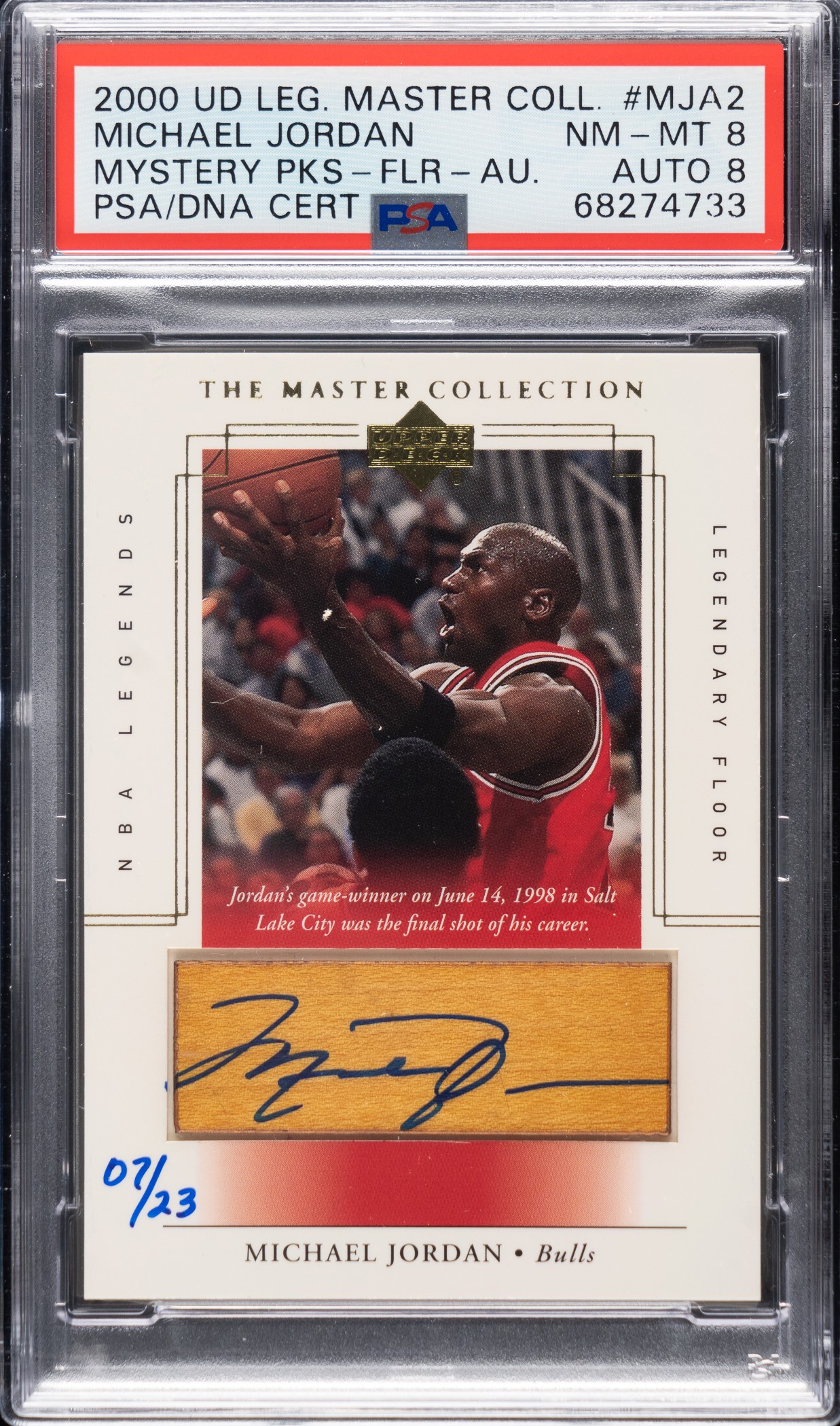Graded NM-MT 8 by PSA (submitted by REA). Outstanding 2000 Upper Deck NBA Legends Basketball "The Master Collection" Legendary Floor Michael Jordan Autographed card. Jordan has signed the card in blue marker, with the signature grading NM-MT 8. Jordan has written his signature across an authentic piece of the game floor from the home of the Utah Jazz, the site of Jordan's final shot as a member of the Chicago Bulls. Hand-numbered 07/23 on the front. The card has a clean surface and strong corners. An outstanding signed Michael Jordan card from this scarce Upper Deck basketball series. Reserve $1,000.