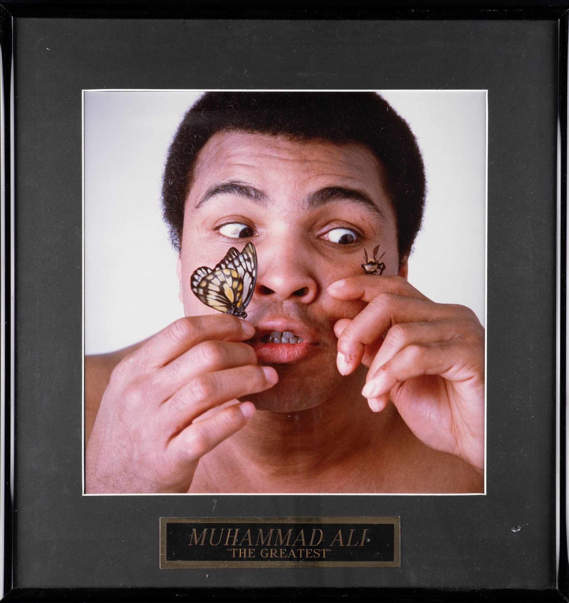 Offered is one of the most candid images of heavyweight boxer Muhammad Ali, taken by noted artist Andy Warhol in 1978. This striking photo was produced specifically to illustrate Ali's most famous mantra, "Float like a butterfly, Sting like a bee." Taken from Warhol's original slides/chromes, this unique Cibachrome print of Ali was produced in 1998 and is in apparent Near Mint condition. Matted and framed to total dimensions of 14.25 x 14.75 inches. The size/weight of this item requires that there will be an additional shipping charge for this lot. Reserve $1,000.